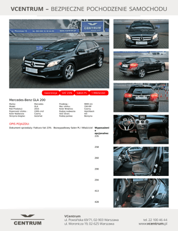 Mercedes-Benz GLA 200 Marka: Model: Rok Produkcji: Pojemność silnika : Kolor Nadwozia: Skrzynia biegów: Mercedes GLA 2015 1595 cm3 Czarny Automat Przebieg : Moc silnika : Kolor Wnętrza: Rodzaj nadwozia: Ilość drzwi: Rodzaj paliwa: 9995 km 156 KM Czarny Hatchback 4/5 Benzyna OPIS POJAZDU: Dokument sprzedaży: Faktura Vat 23% Bezwypadkowy Salon PL I Właściciel Wyposażeni e opcjonalne: 235 258 260 290 294 413 428 429 440 442 475 508 51U 523 538 580 600 614 682 840 873 890 927 950 B03 B51 D0A D0C D0D K11 P54 R01 U10 U25 U59 U60 U62 Cena katalogowa samochodu z wyposaże niem: Dodatkowe Wyposażenie ✓18-calowe felgi aluminiowe ✓Automatycznie przyciemniane wewnętrzne lusterko wsteczne ✓Elektrycznie sterowany hamulec postojowy ✓Elementy dekoracyjne aluminiowe ✓Kierownica wykończona skórą ✓Klimatyzacja automatyczna sterowana elektronicznie ✓Komputer pokładowy ✓Napęd 4Matic ✓Podgrzewane przednie fotele ✓Reflektory BiXenonowe Aktywne ✓Spryskiwacze ciśnieniowe lamp ✓System Start/Stop ✓Światła do jazdy dziennej LED ✓Tempomat ✓Czujniki parkowania tył i przód ✓Zawieszenie AGILITI CONTROL ✓Czujnik deszczu ✓Sportowe fotele Systemy Bezpieczeństwa ✓Mocowanie fotelików dziecięcych (ISOFIX) ✓Poduszka powietrzna kierowcy i pasażera ✓Poduszki przednie boczne ✓Poduszki tylne boczne Multimedia ✓Gniazdo AUX ✓Gniazdo USB / iPod® ✓Przyciski w kierownicy sterujące zestawem audio ✓Zestaw głośnomówiący Bluetooth FINANSOWANIE I UBEZPIECZENIA: Przykładowa rata miesięczna, wpłata 20%, okres leasingu/kredytu 48 miesięcy, 10% wykupu. Rata leasingu jest wartością netto bez vat. Rata: 2 027 Cena: 137 900 PLN PLN Niniejsza treść nie stanowi oferty w rozumieniu przepisów Kodeksu Cywilnego oraz opisu towaru ani zapewnienia w rozumieniu art. 4 Ustawy z dnia 27 lipca 2002r o szczególnych warunkach sprzedaży konsumenckiej. Powered by TCPDF (www.tcpdf.org)