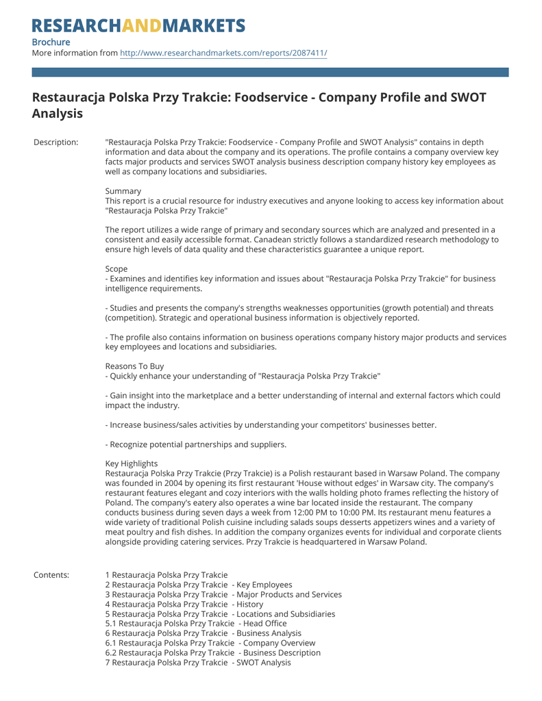 Brochure More information from http://www.researchandmarkets.com/reports/2087411/ Restauracja Polska Przy Trakcie: Foodservice - Company Profile and SWOT Analysis Description: "Restauracja Polska Przy Trakcie: Foodservice - Company Profile and SWOT Analysis" contains in depth information and data about the company and its operations. The profile contains a company overview key facts major products and services SWOT analysis business description company history key employees as well as company locations and subsidiaries. Summary This report is a crucial resource for industry executives and anyone looking to access key information about "Restauracja Polska Przy Trakcie" The report utilizes a wide range of primary and secondary sources which are analyzed and presented in a consistent and easily accessible format. Canadean strictly follows a standardized research methodology to ensure high levels of data quality and these characteristics guarantee a unique report. Scope - Examines and identifies key information and issues about "Restauracja Polska Przy Trakcie" for business intelligence requirements. - Studies and presents the company's strengths weaknesses opportunities (growth potential) and threats (competition). Strategic and operational business information is objectively reported. - The profile also contains information on business operations company history major products and services key employees and locations and subsidiaries. Reasons To Buy - Quickly enhance your understanding of "Restauracja Polska Przy Trakcie" - Gain insight into the marketplace and a better understanding of internal and external factors which could impact the industry. - Increase business/sales activities by understanding your competitors' businesses better. - Recognize potential partnerships and suppliers. Key Highlights Restauracja Polska Przy Trakcie (Przy Trakcie) is a Polish restaurant based in Warsaw Poland. The company was founded in 2004 by opening its first restaurant 'House without edges' in Warsaw city. The company's restaurant features elegant and cozy interiors with the walls holding photo frames reflecting the history of Poland. The company's eatery also operates a wine bar located inside the restaurant. The company conducts business during seven days a week from 12:00 PM to 10:00 PM. Its restaurant menu features a wide variety of traditional Polish cuisine including salads soups desserts appetizers wines and a variety of meat poultry and fish dishes. In addition the company organizes events for individual and corporate clients alongside providing catering services. Przy Trakcie is headquartered in Warsaw Poland. Contents: 1 Restauracja Polska Przy Trakcie 2 Restauracja Polska Przy Trakcie - Key Employees 3 Restauracja Polska Przy Trakcie - Major Products and Services 4 Restauracja Polska Przy Trakcie - History 5 Restauracja Polska Przy Trakcie - Locations and Subsidiaries 5.1 Restauracja Polska Przy Trakcie - Head Office 6 Restauracja Polska Przy Trakcie - Business Analysis 6.1 Restauracja Polska Przy Trakcie - Company Overview 6.2 Restauracja Polska Przy Trakcie - Business Description 7 Restauracja Polska Przy Trakcie - SWOT Analysis 7.1 Restauracja Polska Przy Trakcie - SWOT Analysis - Overview 7.2 Restauracja Polska Przy Trakcie - Strengths 7.2.1 Strength - Strong Customer Portfolio 7.2.2 Strength - Location Advantage 7.3 Restauracja Polska Przy Trakcie - Weaknesses 7.3.1 Weaknesses - Relatively Low Brand Recognition 7.4 Restauracja Polska Przy Trakcie - Opportunities 7.4.1 Opportunities - Growth in Polish Economy 7.4.2 Opportunities - Growing Polish Foodservice Industry 7.4.3 Opportunities - Increase in Global Food Consumption 7.5 Restauracja Polska Przy Trakcie - Threats 7.5.1 Threats - Shortage of Skilled Labor 7.5.2 Threats - Intense Competition 7.5.3 Threats - Changing Consumer Preferences 8 Appendix 8.1 Methodology 8.2 Restauracja Polska Przy Trakcie - Ratio Definitions 8.3 Disclaimer Ordering: Order Online - http://www.researchandmarkets.com/reports/2087411/ Order by Fax - using the form below Order by Post - print the order form below and send to Research and Markets, Guinness Centre, Taylors Lane, Dublin 8, Ireland. Page 1 of 2 Fax Order Form To place an order via fax simply print this form, fill in the information below and fax the completed form to 646-607-1907 (from USA) or +353-1-481-1716 (from Rest of World). If you have any questions please visit http://www.researchandmarkets.com/contact/ Order Information Please verify that the product information is correct and select the format(s) you require. Product Name: Restauracja Polska Przy Trakcie: Foodservice - Company Profile and SWOT Analysis Web Address: http://www.researchandmarkets.com/reports/2087411/ Office Code: SCB1L41V Product Formats Please select the product formats and quantity you require: Quantity Electronic (PDF) Site License: USD 250 Electronic (PDF) Enterprisewide: USD 375 Electronic (PDF) Single User: USD 125 * The price quoted above is only valid for 30 days. Please submit your order within that time frame to avail of this price as all prices are subject to change. Contact Information Please enter all the information below in BLOCK CAPITALS Title: First Name: Mr Mrs Dr Miss Last Name: Email Address: * Job Title: Organisation: Address: City: Postal / Zip Code: Country: Phone Number: Fax Number: * Please refrain from using free email accounts when ordering (e.g. Yahoo, Hotmail, AOL) Ms Prof Page 2 of 2 Payment Information Please indicate the payment method you would like to use by selecting the appropriate box. Pay by credit card: You will receive an email with a link to a secure webpage to enter your credit card details. Pay by check: Please post the check, accompanied by this form, to: Research and Markets, Guinness Center, Taylors Lane, Dublin 8, Ireland. Pay by wire transfer: Please transfer funds to: Account number 833 130 83 Sort code 98-53-30 Swift code ULSBIE2D IBAN number IE78ULSB98533083313083 Bank Addres