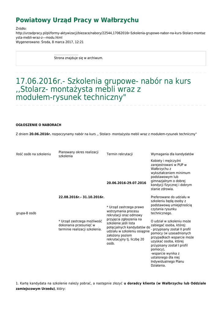 Powiatowy Urząd Pracy w Wałbrzychu Źródło: http://urzadpracy.pl/pl/formy-aktywizacji/biezace/nabory/22544,17062016r-Szkolenia-grupowe-nabor-na-kurs-Stolarz-montaz ysta-mebli-wraz-z---modu.html Wygenerowano: Środa, 8 marca 2017, 12:21 Strona znajduje się w archiwum. 17.06.2016r.- Szkolenia grupowe- nabór na kurs ,,Stolarz- montażysta mebli wraz z modułem-rysunek techniczny" OGŁOSZENIE O NABORACH Z dniem 20.06.2016r. rozpoczynamy nabór na kurs ,, Stolarz- montażysta mebli wraz z modułem-rysunek techniczny" Ilość osób na szkoleniu Planowany okres realizacji szkolenia Termin rekrutacji 20.06.2016-29.07.2016 22.08.2016r.- 31.10.2016r. grupa-8 osób * Urząd zastrzega możliwość dokonania przesunięć w terminie realizacji szkolenia. Wymagania dla kandydatów Kobiety i mężczyźni zarejestrowani w PUP w Wałbrzychu z wykształceniem minimum podstawowym lub gimnazjalnym o dobrej kondycji fizycznej i dobrym stanie zdrowia. Preferowane do udziału w szkoleniu będą osoby z podstawową umiejętnością czytania rysunku technicznego. * Urząd zastrzega prawo wstrzymania procesu rekrutacji oraz odmowy przyjęcia zgłoszenia na O udział w szkoleniu może szkolenie jeśli lista zabiegać osoba, której: potęcjalnych kandydatów do - przypisany został II profil udziału w szkoleniu osiągnie pomocy (w uzasadnionych założony poziom przypadkach wsparcie może rekrutacyjny tj. liczbę 20 uzyskać osoba, której osób. przypisany został I profil pomocy), -wsparcie wynika z ustalonego dla niej Indywidualnego Planu Działania. 1. Kartę kandydata na szkolenie należy pobrać, a następnie złozyć u doradcy klienta (w Wałbrzychu lub Oddziale zamiejscowym Urzedu), który: - dokona oceny czy osoba bezrobotna spełnia warunki formalne do uzyskania wsparcia, - zapozna się z przedstawionym przez osobę bezrobotną uzasadnieniem potrzeby udzielenia wsparcia, - w uzasadnionych przypadkach skieruje osobę bezrobotną do pośrednika pracy lub doradcy celem uzyskania opinii, - sporządzi opinię na karcie kandydata dotyczącą celowości objęcia osoby bezrobotnej wsparciem w ramach szkolenia. 2. Kartę należy wypełnić dokładnie i czytelnie z odznaczeniem aktualnego adresu do korespondencji i numeru telefonu. 3. UWAGA: ZŁOŻENIE KARTY KANDYDATA NA SZKOLENIE GRUPOWE NIE JEST JEDNOZNACZNE Z ZAKWALIFIKOWANIEM NA SZKOLENIE, bowiem spośród wszystkich osób zainteresowanych wsparciem w ramach przeprowadzonego naboru, Zespół ds. Kwalifikowania i doboru kandydatów na szkolenia grupowe (...) wyłoni grupę docelową (8 osób), która otrzyma informację o zakwalifikowaniu na szkolenie 4. Osoby zakwalifikowane do udziału w skzoleniu przed jego rozpoczęciem skierowane zostaną na badania lekarskie. Koszt badań lekarskich sfinansowany zostanie przez Urząd. 5. Urząd dopuszcza możliwość realizacji szkolenia w ramach jego części praktycznej realizowanej w warunkach rzeczywistego zakładu pracy, na terenie Powiatu wałbrzyskiego. W tej sytuacji organizator szkolenia będzie zobowiązany do zapewnienia uczestnikom dojazdu na szkolenie. 6. Urząd nie przewiduje finansowania (refundacji) kosztów dojazdu na pozostałe zajęcia szkoleniowe. 7. Opis realizacji usługi: Szkolenie obejmować będzie do 260 godzin zajęć dydaktycznych w ramach, których zrealizowane zostaną zajecia teoretyczne oraz praktyczne m.in.: ● rozróżnianie gatunków drewna i ich zastosowanie, ● dobieranie cech użytkowych drewna, ● rozróżnianie materiałów drewnopochodnych stosowanych w meblarstwie, ● stosowanie tworzyw sztucznych w meblarstwie, ● klejenie elementów z drewna i materiałów drewnopochodnych, ● wykańczanie powierzchni drewna i materiałów, ● dobieranie okuć i materiałów dodatkowych zgodnie z ich przeznaczeniem, ● dobieranie materiałów montażowych, ● posługiwanie się elektronarzędziami do drewna, ● wykonywanie podstawowych operacji technologicznych na stacjonarnych maszynach do obróbki drewna, ● czytanie rysunku technicznego, ● wykonywanie elementów i podzespołów konstrukcyjnych, ● montowanie zespołów konstrukcyjnych, ● wykonywanie montażu, wyposażenie i wykończenie kompletu mebli. Zajęcia teoretyczne oraz praktyczne będą realizowane według planu obejmującego nie więcej niż 8 godzin zegarowych dziennie (łącznie z przerwą). ● Każdy uczestnik po ukończeniu szkolenia i pozytywnie zdanym egzaminie otrzyma:a) zaświadczenie o ukończeniu kursu wydane zgodnie z Załacznikiem Nr 5 do Rozporządzenia Ministra Edukacji Narodowej z dnia 11 stycznia 2012r. w sprawie kształcenia ustawicznego w formach pozaszkolnych (Dz. U. 2014.622 j.t.).b) suplement zawierający tematy, wymiar godzin zajęć edukacyjnych stanowiący załącznik do zaświadczenia, o jakim mowa powyżej lub dokument potwierdzający ukończenie szkolenia i uzyskanie kwalifikacji zgodny z Rozporządzeniem Ministra Pracy i Polityki Społecznej z dnia 14 maja 2014r. w sprawie szczegółowych warunków realizacji oraz trybu i sposobów prowadzenia usługi rynku pracy (Dz. U. 2014. 667). Wykonawca usługi szkoleniowej będzie zobowiązany zapewnić uczestnikom szkolenia: - skrypt oraz podstawowe materiały piśmienne potrzebne do prowadzenia notatek ( zeszyt, długopis), ● odpowiednie środki ochrony osobistej, ● niezbędne narzędzia, sprzęt, materiały, które umożliwiają realizację założonego minimum programowego. ● zajęcia praktyczne, których zakres będzie obejmował nabycie umiejętności w warunkach rzeczywistego środowiska pracy. Metryka strony Data publikacji 17.06.2016 Rejestr zmian Osoba publikująca: Bożena Zachwyc Wydział Ewidencji, Rejestracji i Świadczeń Autor: Ewelina Bąk Liczba wejść: 155 Drukuj Generuj PDF Powiadom znajomego Wstecz