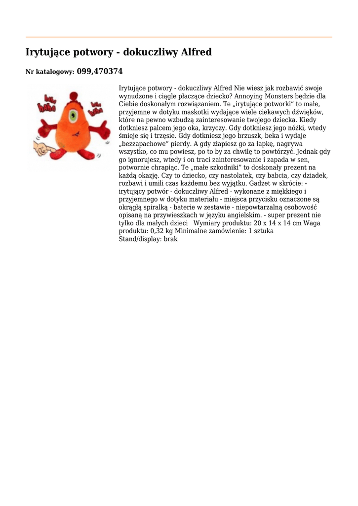 Irytujące potwory - dokuczliwy Alfred Nr katalogowy: 099,470374 Irytujące potwory - dokuczliwy Alfred Nie wiesz jak rozbawić swoje wynudzone i ciągle płaczące dziecko? Annoying Monsters będzie dla Ciebie doskonałym rozwiązaniem. Te „irytujące potworki” to małe, przyjemne w dotyku maskotki wydające wiele ciekawych dźwięków, które na pewno wzbudzą zainteresowanie twojego dziecka. Kiedy dotkniesz palcem jego oka, krzyczy. Gdy dotkniesz jego nóżki, wtedy śmieje się i trzęsie. Gdy dotkniesz jego brzuszk, beka i wydaje „bezzapachowe” pierdy. A gdy złapiesz go za łapkę, nagrywa wszystko, co mu powiesz, po to by za chwilę to powtórzyć. Jednak gdy go ignorujesz, wtedy i on traci zainteresowanie i zapada w sen, potwornie chrapiąc. Te „małe szkodniki” to doskonały prezent na każdą okazję. Czy to dziecko, czy nastolatek, czy babcia, czy dziadek, rozbawi i umili czas każdemu bez wyjątku. Gadżet w skrócie: irytujący potwór - dokuczliwy Alfred - wykonane z miękkiego i przyjemnego w dotyku materiału - miejsca przycisku oznaczone są okrągłą spiralką - baterie w zestawie - niepowtarzalną osobowość opisaną na przywieszkach w języku angielskim. - super prezent nie tylko dla małych dzieci Wymiary produktu: 20 x 14 x 14 cm Waga produktu: 0,32 kg Minimalne zamówienie: 1 sztuka Stand/display: brak