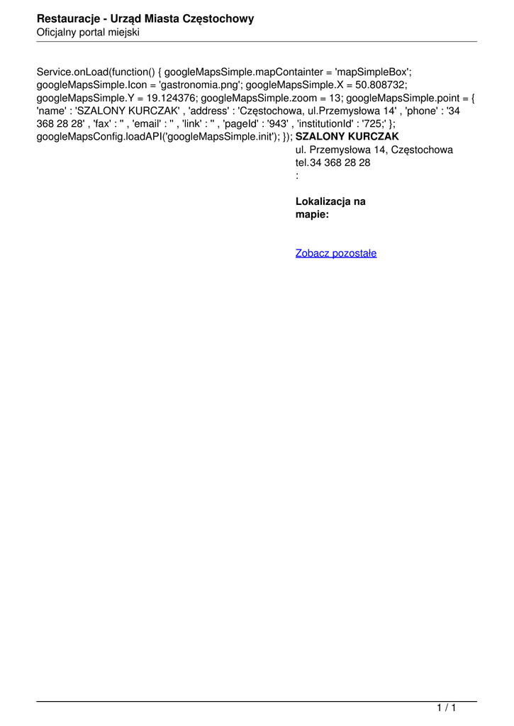 'name' : 'SZALONY KURCZAK' , 'address' : 'Częstochowa, ul.Przemysłowa 14' , 'phone' : '34