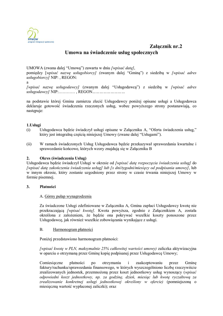 Załącznik nr.2 Umowa na świadczenie usług społecznych UMOWA (zwana dalej “Umową”) zawarta w dniu [wpisać datę], pomiędzy [wpisać nazwę usługobiorcy] (zwanym dalej “Gminą”) z siedzibą w [wpisać adres usługobiorcy] NIP: , REGON: a [wpisać nazwę usługodawcy] (zwanym dalej “Usługodawcą”) z siedzibą w [wpisać adres usługodawcy] NIP:………… , REGON……………………… na podstawie której Gmina zamierza zlecić Usługodawcy poniżej opisane usługi a Usługodawca deklaruje gotowość świadczenia rzeczonych usług, wobec powyższego strony postanawiają, co następuje: 1.Usługi (i) Usługodawca będzie świadczył usługi opisane w Załączniku A, “Oferta świadczenia usług,” który jest integralną częścią niniejszej Umowy (zwane dalej “Usługami”). (ii) W ramach świadczonych Usług Usługodawca będzie przekazywał sprawozdania kwartalne i sprawozdanie końcowe, których wzory znajdują się w Załączniku B 2. Okres (świadczenia Usług) Usługodawca będzie świadczył Usługi w okresie od [wpisać datę rozpoczęcia świadczenia usług] do [wpisać datę zakończenia świadczenia usług] lub [x dni/tygodni/miesięcy od podpisania umowy], lub w innym okresie, który zostanie uzgodniony przez strony w czasie trwania niniejszej Umowy w formie pisemnej. 3. Płatności A. Górny pułap wynagrodzenia Za świadczone Usługi zdefiniowane w Załączniku A, Gmina zapłaci Usługodawcy kwotę nie przekraczającą [wpisać kwotę]. Kwota powyższa, zgodnie z Załącznikiem A, została określona z założeniem, że będzie ona pokrywać wszelkie koszty ponoszone przez Usługodawcę, jak również wszelkie zobowiązania wynikające z usługi. B. Harmonogram płatności Poniżej przedstawiono harmonogram płatności: [wpisać kwotę w PLN, maksymalnie 25% całkowitej wartości umowy) zaliczka aktywizacyjna w oparciu o otrzymaną przez Gminę kopię podpisanej przez Usługodawcę Umowy; Comiesięczne płatności po otrzymaniu i zaakceptowaniu przez Gminę faktury/rachunku/sprawozdania finansowego, w których wyszczególniono liczbę rzeczywiście zrealizowanych jednostek, przemnożoną przez koszt jednostkowy usług wynoszący (wpisać odpowiedni koszt jednostkowy, np. za godzinę, dzień, miesiąc lub kwotę ryczałtową za zrealizowanie konkretnej usługi jednostkowej określony w ofercie) (pomniejszoną o miesięczną wartość wypłaconej zaliczki); oraz [wpisać kwotę równą 20% całkowitej wartości kontraktu] ostatnia płatność po otrzymaniu przez Gminę ostatniego sprawozdania finansowego/rachunku/faktury i akceptacji końcowego raportu podsumowującego efekt wyświadczonych usług (łącznie z badaniem satysfakcji usługobiorców – jeśli ma zastosowanie). C. Zasady płatności Przelewy będą dokonywane nie później niż 30 dni po otrzymaniu przez Koordynatora, którym będzie osoba zdefiniowana w punkcie 4, sprawozdania finansowego /rachunku/faktury (w dwóch egzemplarzach) na konto banku [wpisać numer konta bankowego Usługodawcy) 4. Zarządzanie projektem A. Koordynator. Gmina powołuje Pana/Panią [wpisać nazwisko] na stanowisko Koordynatora reprezentującego Gminę; Koordynator będzie odpowiedzialny za koordynowanie działań prowadzonych w ramach niniejszej Umowy. B. Raporty. Raporty opisane w Załączniku B będą przedkładane w trakcie realizacji zlecenia i będą stanowić podstawę do dokonywania płatności określonych w punkcie 3. 5. Standard świadczonych usług Usługodawca zobowiązuje się świadczyć Usługi zgodnie z najwyższymi standardami odpowiedzialności i kompetencji zawodowej i etycznej. Usługodawca niezwłocznie zatrudni inną osobę na stanowisko pracownika, którego Gmina uzna za niespełniającego jej oczekiwań. 6. Poufność Usługodawca w czasie trwania Umowy i dwóch lat po jej wygaśnięciu nie będzie ujawniał jakichkolwiek wewnętrznych (zastrzeżonych) lub poufnych informacji dotyczących usług, niniejszej Umowy, bądź interesów lub działań Gminy, chyba że Gmina wyrazi na to pisemną zgodę. 7. Prawo własności 1. Wszelkie opracowania, raporty, lub inne materiały – graficzne, w formie oprogramowania komputerowego, lub inne – przygotowane przez Usługodawcę dla Gminy w ramach niniejszej Umowy będą i pozostaną własnością Gminy. Usługodawca może zatrzymać kopie powyżej wspomnianych dokumentów bądź oprogramowania. [2. Środki trwałe zakupione w ramach projektu przez Usługodawcę pozostają własnością Usługodawcy do końca realizacji umowy. Po jej zakończeniu, własność tych środków trwałych przechodzi na Gminę. W przypadku kontynuacji przez Usługodawcę usług będących przedmiotem niniejszej umowy, Gmina może zgodzić się na dalsze wykorzystywanie tych środków trwałych przez Usługodawcę]. lub [2. Środki trwałe zakupione przez Usługodawcę celem realizacji usług integracji społecznej w ramach umowy zawartej z Gminą i sfinansowane w całości z funduszy PPWOW muszą być wykorzystywane do realizacji usług społecznych minimum przez okres 3 lat. W przypadku rezygnacji przez Usługodawcę z realizowania usług społecznych po zakończeniu umowy z Gminą jest on zobowiązany do: - przekazania ww. środków trwałych organizacji pozarządowej lub jednostce organizacyjnej gminy prowadzącej działania w zakresie usług społecznych na terenie tej Gminy, lub - zwrotu otrzymanych na ten cel środków wraz z odsetkami w wysokości ustawowej od dnia zakończenia wykonywania usługi i po potrąceniu kosztów zużycia, zgodnie z formułą: wartość zakupu środka trwałego/36 (bazowy 3 letni okres użytkowania) * ilość miesięcy, przez które środek trwały był wykorzystywany do realizacji usług w ramach zawartej z Gminą umowy.] 8. Zakaz działań naruszających konkurencję Usługodawca wyraża zgodę, iż w okresie obowiązywania niniejszej umowy oraz w okresie dwunastu miesięcy po jej zakończeniu, on sam oraz każda jednostka z nim