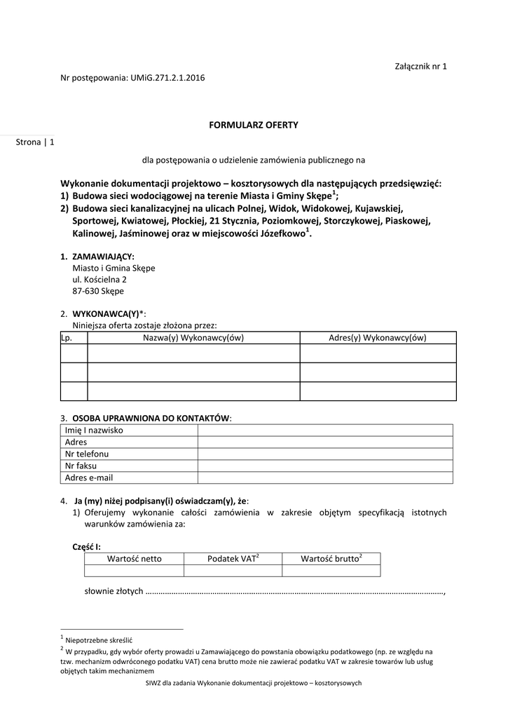 Załącznik nr 1 Nr postępowania: UMiG.271.2.1.2016 FORMULARZ OFERTY Strona | 1 dla postępowania o udzielenie zamówienia publicznego na Wykonanie dokumentacji projektowo – kosztorysowych dla następujących przedsięwzięd: 1) Budowa sieci wodociągowej na terenie Miasta i Gminy Skępe1; 2) Budowa sieci kanalizacyjnej na ulicach Polnej, Widok, Widokowej, Kujawskiej, Sportowej, Kwiatowej, Płockiej, 21 Stycznia, Poziomkowej, Storczykowej, Piaskowej, Kalinowej, Jaśminowej oraz w miejscowości Józefkowo1. 1. ZAMAWIAJĄCY: Miasto i Gmina Skępe ul. Kościelna 2 87-630 Skępe 2. WYKONAWCA(Y)*: Niniejsza oferta zostaje złożona przez: Lp. Nazwa(y) Wykonawcy(ów) Adres(y) Wykonawcy(ów) 3. OSOBA UPRAWNIONA DO KONTAKTÓW: Imię I nazwisko Adres Nr telefonu Nr faksu Adres e-mail 4. Ja (my) niżej podpisany(i) oświadczam(y), że: 1) Oferujemy wykonanie całości zamówienia w zakresie objętym specyfikacją istotnych warunków zamówienia za: Częśd I: Wartośd netto Podatek VAT2 Wartośd brutto2 słownie złotych …………………………………………………………………………………………………………………………, 1 Niepotrzebne skreślid W przypadku, gdy wybór oferty prowadzi u Zamawiającego do powstania obowiązku podatkowego (np. ze względu na tzw. mechanizm odwróconego podatku VAT) cena brutto może nie zawierad podatku VAT w zakresie towarów lub usług objętych takim mechanizmem 2 SIWZ dla zadania Wykonanie dokumentacji projektowo – kosztorysowych W trybie art. 91 ust. 3a ustawy Prawo zamówieo publicznych oświadczamy, iż wybór naszej oferty w tej części będzie/nie będzie* prowadził do powstaniu u Zamawiającego obowiązku podatkowego zgodnie z przepisami ustawy o podatku od towarów i usług (*niewłaściwe skreślid) (wybór oferty Wykonawcy prowadzi do „powstania u Zamawiającego obowiązku podatkowego”, kiedy zgodnie z przepisami ustawy o podatku od towarów i usług to nabywca (Zamawiający) będzie zobowiązany do rozliczenia (odprowadzenia) podatku VAT) W przypadku, gdy wybór oferty Wykonawcy będzie prowadził do powstania u Zamawiającego obowiązku podatkowego Wykonawca zobowiązany jest wskazad nazwę (rodzaj) towaru lub usług, wartośd tego towaru lub usług bez kwoty podatku VAT. Nazwa towaru lub usług prowadzących do powstania u Zamawiającego obowiązku podatkowego …………………………………………………………………………………………………………………………………………..…… oraz wartośd tych towarów i usług bez podatku od towarów i usług: …………………..…………….…. zł UWAGA! Powyższe pola zaznaczone kursywą wypełniają wyłącznie Wykonawcy, których wybór oferty prowadziłby u Zamawiającego do powstania obowiązku podatkowego tzn. kiedy zgodnie z przepisami ustawy o podatku od towarów i usług to nabywca (Zamawiający) będzie zobowiązany do rozliczenia (odprowadzenia) podatku VAT. Strona | 2 Częśd II: Wartośd netto Podatek VAT3 Wartośd brutto3 słownie złotych …………………………………………………………………………………………………………………………, W trybie art. 91 ust. 3a ustawy Prawo zamówieo publicznych oświadczamy, iż wybór naszej oferty w tej części będzie/nie będzie* prowadził do powstaniu u Zamawiającego obowiązku podatkowego zgodnie z przepisami ustawy o podatku od towarów i usług (*niewłaściwe skreślid) (wybór oferty Wykonawcy prowadzi do „powstania u Zamawiającego obowiązku podatkowego”, kiedy zgodnie z przepisami ustawy o podatku od towarów i usług to nabywca (Zamawiający) będzie zobowiązany do rozliczenia (odprowadzenia) podatku VAT) W przypadku, gdy wybór oferty Wykonawcy będzie prowadził do powstania u Zamawiającego obowiązku podatkowego Wykonawca zobowiązany jest wskazad nazwę (rodzaj) towaru lub usług, wartośd tego towaru lub usług bez kwoty podatku VAT. Nazwa towaru lub usług prowadzących do powstania u Zamawiającego obowiązku podatkowego …………………………………………………………………………………………………………………………………………..…… oraz wartośd tych towarów i usług bez podatku od towarów i usług: …………………..…………….…. zł UWAGA! Powyższe pola zaznaczone kursywą wypełniają wyłącznie Wykonawcy, których wybór oferty prowadziłby u Zamawiającego do powstania obowiązku podatkowego tzn. kiedy zgodnie z przepisami ustawy o podatku od towarów i usług to nabywca (Zamawiający) będzie zobowiązany do rozliczenia (odprowadzenia) podatku VAT. 2) Podana cena całkowita jest ceną ryczałtową, obejmującą wszystkie koszty niezbędne do należytego wykonania zamówienia. 3) Zamówienie wykonamy w terminie Częśd I: w ciągu…………tygodni od dnia podpisania umowy wraz z uzyskaniem w tym terminie decyzji o pozwoleniu na budowę. 3 W przypadku, gdy wybór oferty prowadzi u Zamawiającego do powstania obowiązku podatkowego (np. ze względu na tzw. mechanizm odwróconego podatku VAT) cena brutto może nie zawierad podatku VAT w zakresie towarów lub usług objętych takim mechanizmem SIWZ dla zadania Wykonanie dokumentacji projektowo – kosztorysowych Strona | 3 Częśd II: w ciągu…………tygodni od dnia podpisania umowy wraz z uzyskaniem w tym terminie decyzji o pozwoleniu na budowę. 4) Oświadczamy, że uważamy się za związanych niniejszą ofertą przez okres 30 dni od dnia upływu terminu składania ofert. 5) Usługi objęte niniejszym zamówieniem zamierzamy w całości wykonad sami, za wyjątkiem usług wyszczególnionych w Załączniku nr 7. 6) W przypadku powierzenia podwykonawcom do wykonania części zamówienia wskazanych Załączniku nr 7 odpowiadamy za całośd przedmiotu zamówienia. 7) Oświadczamy, że zapoznaliśmy się z zakresem przedmiotu zamówienia oraz uzyskaliśmy konieczne informa