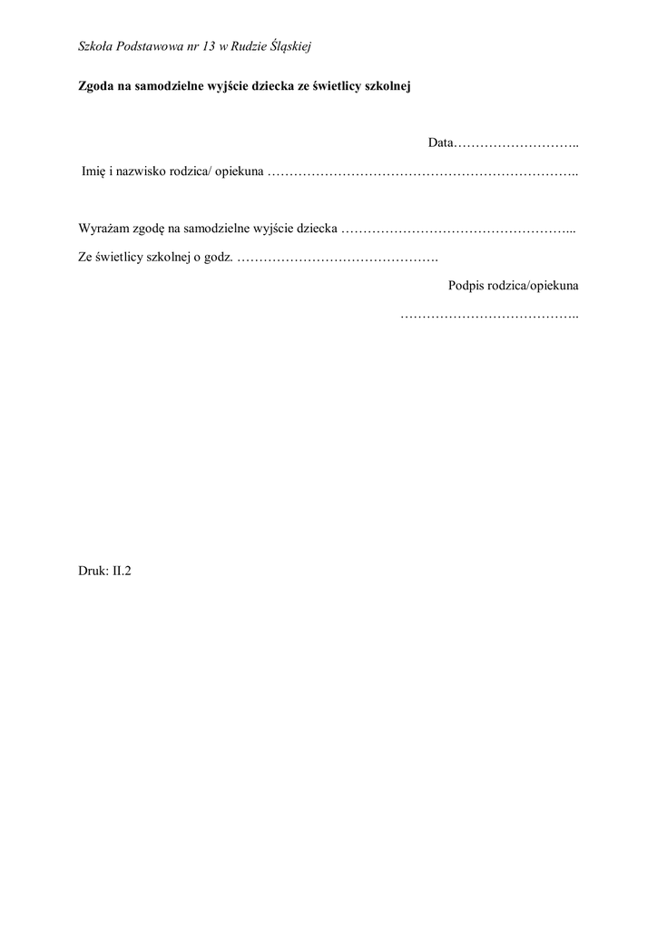 Szkoła Podstawowa nr 13 w Rudzie Śląskiej Zgoda na samodzielne wyjście dziecka ze świetlicy szkolnej Data……………………….. Imię i nazwisko rodzica/ opiekuna …………………………………………………………….. Wyrażam zgodę na samodzielne wyjście dziecka ……………………………………………... Ze świetlicy szkolnej o godz. ………………………………………. Podpis rodzica/opiekuna ………………………………….. Druk: II.2