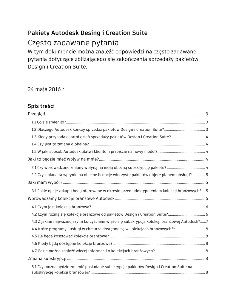 Pakiety Autodesk Desing i Creation Suite Często zadawane pytania W tym dokumencie można znaleźć odpowiedzi na często zadawane pytania dotyczące zbliżającego się zakończenia sprzedaży pakietów Design i Creation Suite. 24 maja 2016 r. Spis treści Przegląd ...................................................................................................................................................... 3 1.1 Co się zmieniło?............................................................................................................................................... 3 1.2 Dlaczego Autodesk kończy sprzedaż pakietów Design i Creation Suite? .......................................... 3 1.3 Kiedy przypada ostatni dzień sprzedaży pakietów Design i Creation Suite? ................................... 4 1.4 Czy jest to zmiana globalna? ....................................................................................................................... 4 1.5 W jaki sposób Autodesk ułatwi klientom przejście na nowy model? ................................................. 4 Jaki to będzie mieć wpływ na mnie? .................................................................................................... 4 2.1 Czy wprowadzone zmiany wpłyną na moją obecną subskrypcję pakietu? ....................................... 4 2.2 Czy zmiana ta wpłynie na obecne licencje wieczyste pakietów objęte planem obsługi? ............. 5 Jaki mam wybór? ...................................................................................................................................... 5 3.1 Jakie opcje zakupu będą oferowane w okresie przed udostępnieniem kolekcji branżowych? ... 5 Wprowadzamy kolekcje branżowe Autodesk ..................................................................................... 6 4.1 Czym jest kolekcja branżowa? ..................................................................................................................... 6 4.2 Czym różnią się kolekcje branżowe od pakietów Design i Creation Suite? ...................................... 6 4.3 Z jakimi najważniejszymi korzyściami wiąże się subskrypcja kolekcji branżowej Autodesk?......7 4.4 Które programy i usługi w chmurze dostępne są w kolekcjach branżowych?* .............................. 8 4.5 Ile będą kosztować kolekcje branżowe? .................................................................................................. 8 4.6 Kiedy będą dostępne kolekcje branżowe? ............................................................................................... 8 4.7 Gdzie można znaleźć więcej informacji o kolekcjach branżowych? ................................................... 8 Zmiana subskrypcji ..................................................................................................................................8 5.1 Czy można będzie zmienić posiadane subskrypcje pakietów Design i Creation Suite na subskrypcję kolekcji branżowej? ...................................................................................................................... 8 5.2 Jakie opcje dostępne będą dla klientów zamierzających przejść na kolekcję branżową? ........... 9 5.3 Kiedy można będzie zmienić obecnie posiadaną subskrypcję pakietów Design i Creation Suite na kolekcję branżową? ............................................................................................................................. 9 5.4 Czy będzie można zmienić licencję wieczystą z planem obsługi na kolekcję branżową? ............. 9 5.5 Ile będzie kosztować zmiana? ..................................................................................................................... 9 Przegląd 1.1 Co się zmieniło? Po 31 lipca 2016 r. Autodesk nie będzie już sprzedawać pakietów Design i Creation Suite (nowych subskrypcji po zapowiadanym wcześniej zakończeniu sprzedaży licencji wieczystych na pakiety). Zmiana ma wpływ na następujące pakiety: Autodesk® 3ds Max® Entertainment Creation Suite Autodesk® Building Design Suite Autodesk® Entertainment Creation Suite Autodesk® Factory Design Suite Autodesk® Infrastructure Design Suite Autodesk® Maya Entertainment Creation Suite Autodesk® Plant Design Suite Autodesk® Product Design Suite Revit® Collaboration Suite Wyjątki: sprzedaż przeznaczonych dla jednego użytkownika nowych subskrypcji wymienionych poniżej pakietów zakończy się 31 stycznia 2017 r. AutoCAD® Inventor® LT Suite AutoCAD® Revit® LT Suite Structural Fabrication Suite MEP Fabrication Suite 1.2 Dlaczego Autodesk kończy sprzedaż pakietów Design i Creation Suite? Słuchamy głosów użytkowników — ich sposoby pracy szybko się zmieniają, co ma wpływ również na zmiany stosowanych narzędzi oraz sposobów zakupu oprogramowania i uzyskiwania do niego dostępu. Autodesk kończy sprzedaż pakietów Design i Creation Suite, aby móc dostarczać rozwiązania z zakresu oprogramowania w elastyczniejszy i prostszy sposób oraz lepiej dopasowywać się do stale zmieniających się potrzeb użytkowników. 1 sierpnia 2016 r. wprowadzimy kolekcje branżowe, dzięki którym użytkownicy zyskają nowy sposób dostępu do oprogramowania Autodesk, na którym im zależy i którego potrzebują — jednocześnie zapewnimy też klientom większą wartość i elastyczność oraz uproszczoną obsługę. Dowiedz się więcej różnicach między kolekcjami branżowymi a pakietami Design i Creation Suite. 1.3 Kiedy przypada ostatni dzień sprzedaży pakietów Design i Creation Suite? 31 lipca 2016 r. będzie ostatnim dniem, w którym będzie można kupić pakiety Design i Creation Suite bądź rozpocząć subskrypcję takich pakietów. Wyjątki: sprzedaż przeznaczonych dla jednego użytkownika nowych subskrypcji wymienionych poniżej pakietów zakończy się 31 stycznia 2017 r. AutoCAD® Inventor® LT Suite AutoCAD® Revit® LT Suit