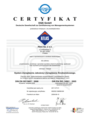 C E R T Y F I K A T DQS GmbH Deutsche Gesellschaft zur Zertifizierung von Managementsystemen poświadcza niniejszym, że przedsiębiorstwo Atlas Sp. z o.o. ul. Kilińskiego 2 91-421 Łódź Polska wraz z wymienionymi w aneksie lokalizacjami dla zakresu projektowanie, produkcja i sprzedaż wyrobów chemii budowlanej, opakowań oraz wyrobów pomocniczych dla budownictwa wdrożyło i stosuje System Zarządzania Jakością i Zarządzania Środowiskowego. Poprzez audit, udokumentowany sprawozdaniem, przedstawiono dowód, że niniejszy system zarządzania spełnia wymagania następujących norm: DIN EN ISO 9001 : 2008 DIN EN ISO 14001 : 2005 Wydanie: listopad 2008 Odpowiada EN ISO 14001 wydanie listopad 2004 Certyfikat jest ważny do: 2011-07-01 Nr rejestracyjny certyfikatu: 062002 QM08/UM Frankfurt am Main 2009-08-10 Ass. iur. M. Drechsel Dipl.-Bw. J. Böge DYREKTORZY Jednostka certyfikująca: DQS GmbH, 60433 Frankfurt am Main, August-Schanz-Straße 21, Niemcy (Tel. +49-69-95 42 70) Biuro: DQS Polska sp. z o. o., ul. Marynarska 21, 02-674 Warszawa, Polska (Tel: +48 22 607 06 10) Aneks do certyfikatu numer rejestracyjny: 062002 QM08/UM Strona 1 Atlas Sp. z o.o. ul. Kilińskiego 2 91-421 Łódź Polska Lokalizacje Zakres Atlas Sp. z o.o. ul. Kilińskiego 2, 91-421 Łódź Polska projektowanie, produkcja i sprzedaż wyrobów chemii budowlanej, opakowań oraz wyrobów pomocniczych dla budownictwa Centrala Atlas Sp. z o.o. ul. Jaśkowa Dolina 17 80-252 Gdańsk Polska projektowanie i sprzedaż wyrobów chemii budowlanej, opakowań oraz wyrobów pomocniczych dla budownictwa Atlas Sp. z o.o. Zakład Produkcyjny Piotrków Trybunalski ul. Wronia 61/63 97-300 Piotrków Trybunalski Polska projektowanie, produkcja i sprzedaż wyrobów chemii budowlanej oraz wyrobów pomocniczych dla budownictwa Atlas Sp. z o.o. Zakład Produkcyjny Bydgoszcz ul. Przemysłowa 32 85-758 Bydgoszcz Polska projektowanie, produkcja i sprzedaż wyrobów chemii budowlanej Atlas Sp. z o.o. Zakład Produkcyjny Dąbrowa Górnicza ul. Roździeńskiego 2 41-306 Dąbrowa Górnicza Polska projektowanie, produkcja i sprzedaż wyrobów chemii budowlanej Niniejszy aneks (wydanie: 2009-08-10) jest ważny tylko z wyżej wymienionym certyfikatem. Aneks do certyfikatu numer rejestracyjny: 062002 QM08/UM Strona 2 Atlas Sp. z o.o. ul. Kilińskiego 2 91-421 Łódź Polska Lokalizacje Zakres Atlas Sp. z o.o. Zakład Produkcyjny Suwałki Dubowo II nr 33 16-400 Suwałki Polska projektowanie, produkcja i sprzedaż wyrobów chemii budowlanej Atlas Sp. z o.o. Zakład Produkcyjny Niwnice Oddział Niwnice Niwnice 59-607 Lwówek Śląski Polska projektowanie, produkcja i sprzedaż wyrobów chemii budowlanej Atlas Sp. z o.o. Zakład Produkcyjny Niwnice Oddział Gromadka Osła 1A 59-706 Gromadka Polska produkcja wyrobów chemii budowlanej WKiZB S.A. ul. Szczawińska 52 A 95-100 Zgierz Polska projektowanie, produkcja i sprzedaż wyrobów chemii budowlanej, opakowań oraz wyrobów pomocniczych dla budownictwa Niniejszy aneks (wydanie: 2009-08-10) jest ważny tylko z wyżej wymienionym certyfikatem.