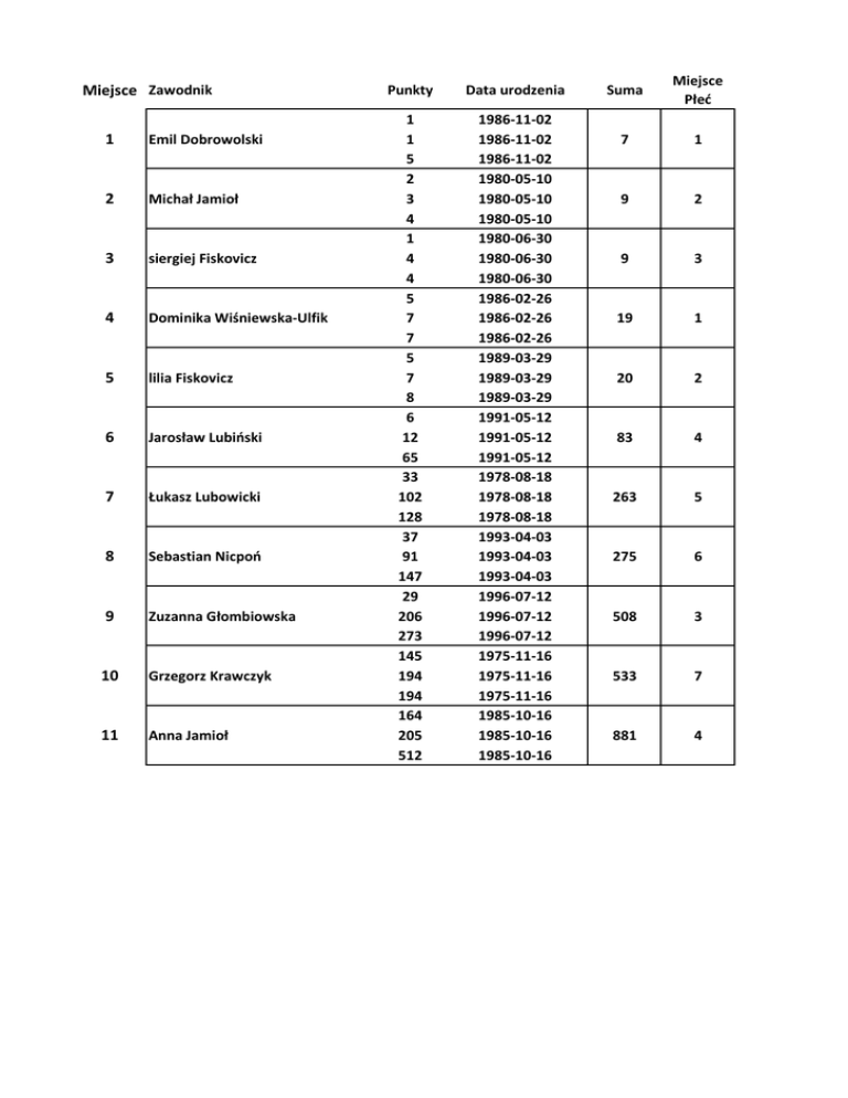 Miejsce Zawodnik 1 Emil Dobrowolski 2 Michał Jamioł 3 siergiej Fiskovicz 4 Dominika Wiśniewska-Ulfik 5 lilia Fiskovicz 6 Jarosław Lubiński 7 Łukasz Lubowicki 8 Sebastian Nicpoń 9 Zuzanna Głombiowska 10 Grzegorz Krawczyk 11 Anna Jamioł Punkty Data urodzenia 1 1 5 2 3 4 1 4 4 5 7 7 5 7 8 6 12 65 33 102 128 37 91 147 29 206 273 145 194 194 164 205 512 1986-11-02 1986-11-02 1986-11-02 1980-05-10 1980-05-10 1980-05-10 1980-06-30 1980-06-30 1980-06-30 1986-02-26 1986-02-26 1986-02-26 1989-03-29 1989-03-29 1989-03-29 1991-05-12 1991-05-12 1991-05-12 1978-08-18 1978-08-18 1978-08-18 1993-04-03 1993-04-03 1993-04-03 1996-07-12 1996-07-12 1996-07-12 1975-11-16 1975-11-16 1975-11-16 1985-10-16 1985-10-16 1985-10-16 Suma Miejsce Płeć 7 1 9 2 9 3 19 1 20 2 83 4 263 5 275 6 508 3 533 7 881 4