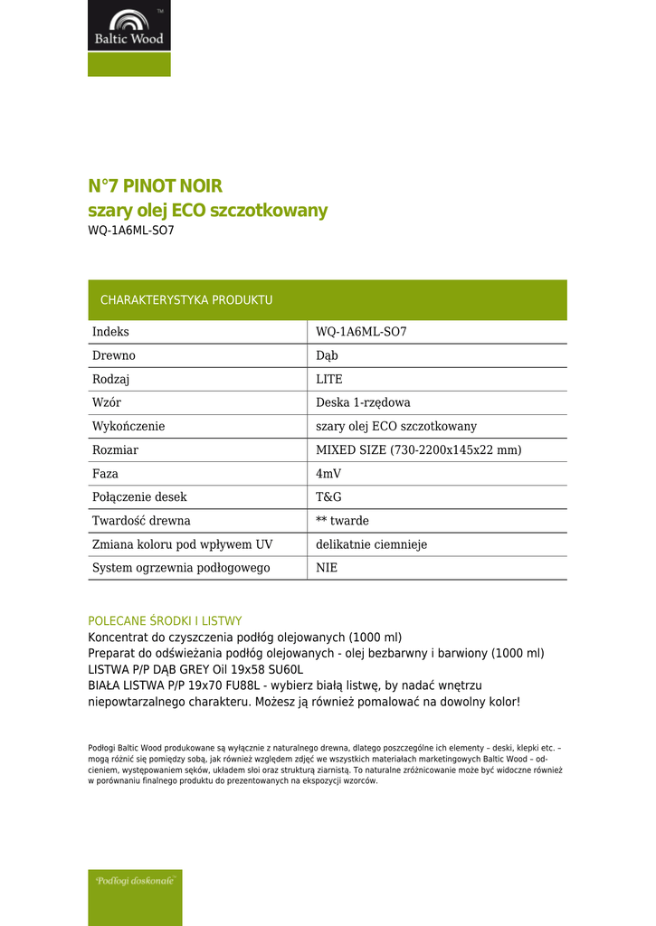 N°7 PINOT NOIR szary olej ECO szczotkowany WQ-1A6ML-SO7 CHARAKTERYSTYKA PRODUKTU Indeks WQ-1A6ML-SO7 Drewno Dąb Rodzaj LITE Wzór Deska 1-rzędowa Wykończenie szary olej ECO szczotkowany Rozmiar MIXED SIZE (730-2200x145x22 mm) Faza 4mV Połączenie desek T&G Twardość drewna ** twarde Zmiana koloru pod wpływem UV delikatnie ciemnieje System ogrzewnia podłogowego NIE POLECANE ŚRODKI I LISTWY Koncentrat do czyszczenia podłóg olejowanych (1000 ml) Preparat do odświeżania podłóg olejowanych - olej bezbarwny i barwiony (1000 ml) LISTWA P/P DĄB GREY Oil 19x58 SU60L BIAŁA LISTWA P/P 19x70 FU88L - wybierz białą listwę, by nadać wnętrzu niepowtarzalnego charakteru. Możesz ją również pomalować na dowolny kolor! Podłogi Baltic Wood produkowane są wyłącznie z naturalnego drewna, dlatego poszczególne ich elementy – deski, klepki etc. – mogą różnić się pomiędzy sobą, jak również względem zdjęć we wszystkich materiałach marketingowych Baltic Wood – odcieniem, występowaniem sęków, układem słoi oraz strukturą ziarnistą. To naturalne zróżnicowanie może być widoczne również w porównaniu finalnego produktu do prezentowanych na ekspozycji wzorców.
