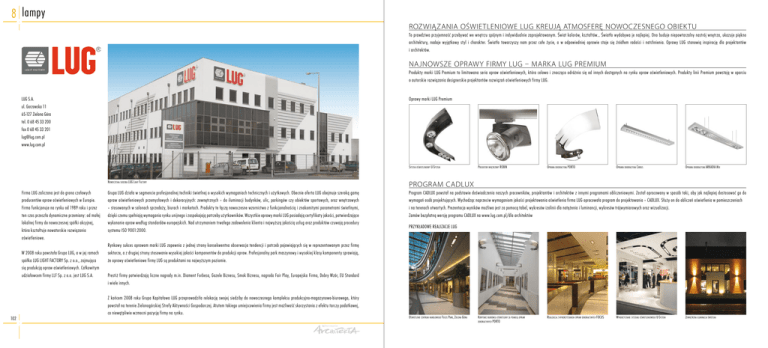 8 lampy Rozwiązania oświetleniowe LUG kreują atmosferę nowoczesnego obiektu To prawdziwa przyjemność przebywać we wnętrzu spójnym i indywidualnie zaprojektowanym. Świat kolorów, kształtów… Światło wydobywa je najlepiej. Ono buduje niepowtarzalny nastrój wnętrza, ukazuje piękno architektury, nadaje wyjątkowy styl i charakter. Światło towarzyszy nam przez całe życie, a w odpowiedniej oprawie staje się źródłem radości i natchnienia. Oprawy LUG stanowią inspirację dla projektantów i architektów. Najnowsze oprawy firmy LUG – marka LUG Premium Produkty marki LUG Premium to limitowana seria opraw oświetleniowych, która celowo i znacząco odróżnia się od innych dostępnych na rynku opraw oświetleniowych. Produkty linii Premium powstają w oparciu o autorskie rozwiązania designerskie projektantów rozwiązań oświetleniowych firmy LUG. LUG S.A. ul. Gorzowska 11 65-127 Zielona Góra tel. 0 68 45 33 200 fax 0 68 45 33 201 [email protected] www.lug.com.pl Oprawy marki LUG Premium System oświetleniowy U-System Firma LUG zaliczana jest do grona czołowych producentów opraw oświetleniowych w Europie. Firma funkcjonuje na rynku od 1989 roku i przez ten czas przeszła dynamiczne przemiany: od małej lokalnej firmy do nowoczesnej spółki akcyjnej, która kształtuje nowatorskie rozwiązania oświetleniowe. W 2008 roku powstała Grupa LUG, a w jej ramach spółka LUG LIGHT FACTORY Sp. z o.o., zajmująca się produkcją opraw oświetleniowych. Całkowitym udziałowcem firmy LLF Sp. z o.o. jest LUG S.A. 102 Projektor wnętrzowy ROBIN Oprawa dekoracyjna PORTO Oprawa dekoracyjna Cirrus Oprawa dekoracyjna ARKADIA Mix Nowoczesna siedziba LUG L ight Factory Program CADLUX Grupa LUG działa w segmencie profesjonalnej techniki świetlnej o wysokich wymaganiach technicznych i użytkowych. Obecnie oferta LUG obejmuje szeroką gamę opraw oświetleniowych przemysłowych i dekoracyjnych: zewnętrznych – do iluminacji budynków, ulic, parkingów czy obiektów sportowych, oraz wnętrzowych – stosowanych w salonach sprzedaży, biurach i marketach. Produkty te łączą nowoczesne wzornictwo z funkcjonalnością i znakomitymi parametrami świetlnymi, dzięki czemu spełniają wymagania rynku unijnego i zaspokajają potrzeby użytkowników. Wszystkie oprawy marki LUG posiadają certyfikaty jakości, potwierdzające wykonanie opraw według standardów europejskich. Nad utrzymaniem trwałego zadowolenia klienta i najwyższą jakością usług oraz produktów czuwają procedury systemu ISO 9001:2000. Program CADLUX powstał na podstawie doświadczenia naszych pracowników, projektantów i architektów z innymi programami obliczeniowymi. Został opracowany w sposób taki, aby jak najlepiej dostosować go do wymagań osób projektujących. Wychodząc naprzeciw wymaganiom jakości projektowania oświetlenia firma LUG opracowała program do projektowania – CADLUX. Służy on do obliczeń oświetlenia w pomieszczeniach i na terenach otwartych. Prezentacja wyników możliwa jest za pomocą tabel, wykresów izolinii dla natężenia i luminancji, wykresów trójwymiarowych oraz wizualizacji. Zamów bezpłatną wersję programu CADLUX na www.lug.com.pl/dla architektów PRZYKŁADOWE REALIZACJE LUG Rynkowy sukces oprawom marki LUG zapewnia z jednej strony konsekwentna obserwacja tendencji i potrzeb pojawiających się w reprezentowanym przez firmę sektorze, a z drugiej strony stosowanie wysokiej jakości komponentów do produkcji opraw. Profesjonalny park maszynowy i wysokiej klasy komponenty sprawiają, że oprawy oświetleniowe firmy LUG są produktami na najwyższym poziomie. Prestiż firmy potwierdzają liczne nagrody m.in. Diament Forbesa, Gazele Biznesu, Smok Biznesu, nagroda Fair Play, Europejska Firma, Dobry Wzór, EU Standard i wiele innych. Z końcem 2008 roku Grupa Kapitałowa LUG przeprowadziła relokację swojej siedziby do nowoczesnego kompleksu produkcyjno-magazynowo-biurowego, który powstał na terenie Zielonogórskiej Strefy Aktywności Gospodarczej. Atutem takiego umiejscowienia firmy jest możliwość skorzystania z efektu tarczy podatkowej, co niewątpliwie wzmocni pozycję firmy na rynku. Oświetlenie centrum handlowego Focus Park, Zielona Góra Korytarz biurowca oświetlony za pomocą opraw dekoracyjnych PORTO Realizacja z wykorzystaniem opraw dekoracyjnych FOCUS W ykorzystanie systemu oświetleniowego U-System Zewnętrzna iluminacja świetlna