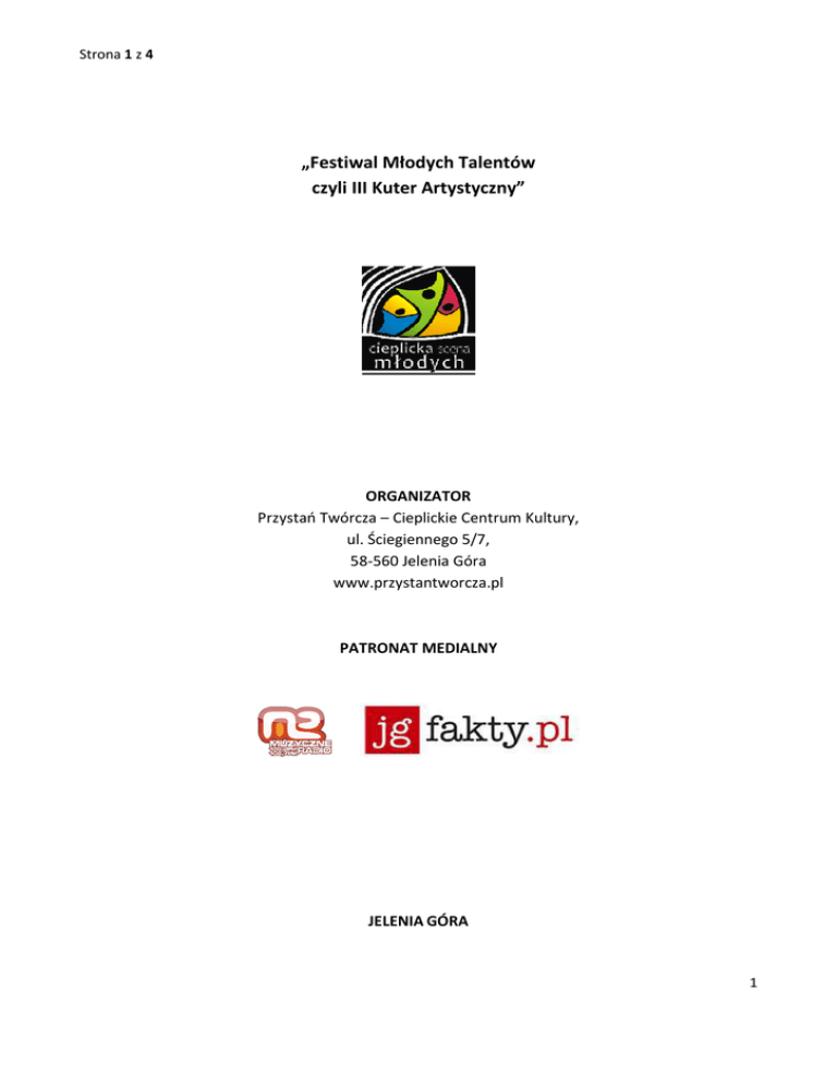 Strona 1 z 4 „Festiwal Młodych Talentów czyli III Kuter Artystyczny” ORGANIZATOR Przystań Twórcza – Cieplickie Centrum Kultury, ul. Ściegiennego 5/7, 58-560 Jelenia Góra www.przystantworcza.pl PATRONAT MEDIALNY JELENIA GÓRA 1 Strona 2 z 4 REGULAMIN §1. Postanowienia ogólne 1. „Festiwal Młodych Talentów, czyli III Kuter Artystyczny” ma charakter konkursowy i przeznaczony jest dla wokalistów, instrumentalistów, tancerzy, aktorów (małych form teatralnych, kabaretów) oraz innych (nie mieszczących się w poprzednich kategoriach a wartych pokazania szerszej publiczności. 2. Festiwal składa się z dwóch etapów: 2.1. ETAP PIERWSZY będzie polegać na przyjmowaniu zgłoszeń oraz przeprowadzeniu prezentacji kwalifikacyjnych w formie pokazów i koncertów organizowanych w różnych miejscach w Jeleniej Górze oraz okolicach. W ramach pierwszego etapu zostaną przeprowadzone trzy nabory: a. pierwszy nabór trwający do dnia 19.02.2013 r. godz. 12.00, przeznaczony dla wokalistów i aktorów (małe formy teatralne, kabarety itp.). W ramach tego naboru zostaną przeprowadzone około trzy pokazy kwalifikacyjne. b. drugi nabór trwający od 19.02.2013 r. do 19.03.2013 r. godz. 12.00, przeznaczony dla wokalistów, aktorów, tancerzy, instrumentalistów i innych. W ramach tego naboru zostaną przeprowadzone około trzy pokazy kwalifikacyjne. c. trzeci nabór trwający od 19.03.2013 r. godz. 12.01 do dnia 16.04.2013 r. godz. 16.00, przeznaczony dla wokalistów, aktorów, tancerzy oraz instrumentalistów i innych. W ramach tego naboru zostaną przeprowadzone około dwa pokazy kwalifikacyjne. 2.2. Osoby, które nie zostaną zakwalifikowane w pierwszym naborze, mogą zgłosić się w kolejnych naborach. 2.3. Lista osób zaproszonych do udziału w pokazach będzie umieszczona na stronie www.przystantworcza.pl oraz wysłana na e-maila uczestników. Jeśli komisja kwalifikująca do pokazu nie będzie w stanie podjąć decyzji tylko na podstawie nadesłanego zgłoszenia, może zaprosić uczestnika na dodatkowe przesłuchanie. Informacja o terminie dodatkowego przesłuchania (kwalifikacji) do pokazu zostanie wysłana na e-mail uczestnika. 2.4. Pierwszy pokaz osób które zgłoszą się do pierwszego naboru „Festiwalu Młodych Talentów, czyli III Cieplickiego Kutra Artystycznego” odbędzie się w siedzibie Przystani Twórczej – Cieplickim Centrum Kultury P. Ściegiennego 5/7, 58-560 Jelenia Góra w dniu 22 lutego 2013 r. o godzinie 19:00. 2.5. Miejsca i terminy następnych pokazów podawane będą na bieżąco na stronie internetowej organizatora oraz w materiałach informacyjnych przez niego dystrybuowanych. 2.6. Z każdego naboru, w zależności od poziomu artystycznego, komisja kwalifikacyjna wytypuje około cztery podmioty do drugiego etapu festiwalu. (podmiot to: wokalista, zespół, tancerz, grupa taneczna, itp.). 3. ETAP DRUGI festiwalu będzie polegać na zaprezentowaniu wyłonionych w I etapie artystów podczas dwóch około 90 minutowych koncertów/pokazów (przesłuchań finałowych). 3.1. Występy uczestników podczas DRUGIEGO ETAPU będą oceniane przez jury, które wyłoni laureatów festiwalu. 2 Strona 3 z 4 4. 5. 6. 7. KONCERTY (pokazy) „Festiwalu Młodych Talentów, czyli III Cieplickiego Kutra Artystycznego” odbędą się w maju 2013 r. Decyzja o zakwalifikowaniu uczestnika zostanie umieszczona na stronie internetowej oraz przesłana drogą elektroniczną. Zgłoszenie udziału w festiwalu jest równoznaczne z wyrażeniem zgody na nieodpłatne prawo do rejestracji dowolną techniką, zapisu oraz wykorzystania zarejestrowanego materiału w celach reklamy festiwalu oraz Cieplickiej Sceny Młodych, przez organizatora, partnerów oraz sponsorów. Festiwal Młodych Talentów odbędzie się w ramach Cieplickiej Sceny Młodych. §2 Cele festiwalu 1. 2. 3. 4. Prezentacja umiejętności uczestników festiwalu. Aktywizowanie młodych artystów i mobilizowanie do wspólnego działania i efektywnego spędzania wolnego czasu. Wymiana pomysłów i doświadczeń w pracy artystycznej między młodymi wykonawcami. Doskonalenie warsztatu artystycznego. §3. Warunki udziału w festiwalu 1. 2. Festiwal skierowany jest do osób w wieku od 14 do 26 roku życia. Organizator, w razie potrzeby, ma prawo do dodatkowego podziału na grupy wiekowe np. 14-17 lat, 18 – 26 lat itp. Zgłaszający się do udziału w festiwalu są zobowiązani do przesłania w następujących terminach (liczy się data wpływu dokumentów do siedziby): - do dnia 19.02. 2013 r. do godz. 12:00, (pierwszy nabór) - do dnia 19.03.2013 r. do godz. 12:00, (drugi nabór) - do dnia 19.04.2013 r. do godz. 16:00, (trzeci nabór) następujących dokumentów: - wypełnionej czytelnie karty uczestnictwa z podaniem wymagań technicznych (załącznik nr 1), - oświadczenia o zgodzie na przetwarzanie danych osobowych (załącznik nr 2), - Wykonawcy śpiewający są również zobowiązani do dostarczenia: • na nośniku np. płycie CD, podkładów muzycznych do trzech wybranych przez siebie utworów/dodatkowych aranżacji, w tym dwóch dowolnych oraz trzeciego w języku czeskim. (Jeśli utwór w języku czeskim jest wykonywany acapella wystarczą dwa podkłady muzyczne). • Wydrukowanych tekstów wykonywanych utworów z podaniem autora słów i muzyki. - możliwa jest także prezentacja z towarzyszeniem akompaniatora lub zespołu (organizator nie zapewnia instrumentów muzycznych). - Tancerze lub artyści innych kategorii wykorzystujący muzykę w swojej prezentacji są również zobowiązani do dostarczenia jej na opisanym nośniku dźwięku. Nośniki podpisane muszą być w następujący sposób: • imię i nazwisko uczestnika, • tytuł utworu i nazwa wykonawcy, • kolejność wykonywania utworów. 3 Strona 4 z 4 3. 4. W sytuacji, gdy uczestnik nie ukończył 18 lat – zobowiązany jest dostarczyć organizatorom pisemną zgodę rodziców lub opiekunów prawnych na wzięcie udziału w festiwalu (załącznik nr 3).