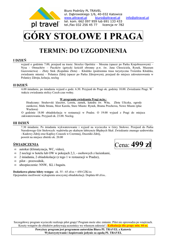 Biuro Podróży PL TRAVEL ul. Dąbrowskiego 1/6, 40-032 Katowice www.pltravel.pl [email protected] [email protected] tel. kom. 662 097 959 lub 691 133 433 tel./fax 032 256 45 77 licencja nr 782 GÓRY STOŁOWE I PRAGA TERMIN: DO UZGODNIENIA I DZIEŃ wyjazd o godzinie 7.00, przejazd na trasie: Strzelce Opolskie – Moszna (spacer po Parku Krajobrazowym) – Nysa - Otmuchów – Paczków (gotycki kościół obronny p.w. św. Jana Chrzciciela, Rynek, Muzeum Gazownictwa) – Złoty Stok (Kopalnia Złota) – Kłodzko (podziemna trasa turystyczna Twierdza Kłodzka, zwiedzanie miasta) – Polanica Zdrój (spacer po Parku Zdrojowym), przejazd do miejsca zakwaterowania w Polanicy Zdroju, kolacja, nocleg II DZIEŃ 6.00 śniadanie, po śniadaniu wyjazd o godz. 6.30. Przyjazd do Pragi ok. godziny 10.00. Zwiedzanie Pragi. W trakcie zwiedzania stolicy Czech czas wolny. W programie zwiedzania Pragi m.in.: Hradczany: Strahovski klasztor, Loreta, zamek, katedra św. Wita, Złota Uliczka, ogrody zamkowe, Mała Strana, Most Karola, Stare Miasto: Rynek, Brama Prochowa, Nowe Miasto (plac Wacława) O godzinie 18.00 obiadokolacja w restauracji w Pradze. O 19.00 wyjazd z Pragi do miejsca zakwaterowania. Przyjazd ok. 23.00. Nocleg. III DZIEŃ 7.30 śniadanie. Po śniadaniu wykwaterowanie i wyjazd na wycieczka w Góry Stołowe. Przejazd do Parku Narodowego Gór Stołowych: wędrówka po skalnym labiryncie Błędnych Skał. Zwiedzanie znanego uzdrowiska - Kudowy Zdrój oraz Kaplicy Czaszek w Czermnej, Duszniki Zdrój, powrót na miejsce zbiórki ok. 20.00 ŚWIADCZENIA • • • • • autokar (klimatyzacja, WC, video), 2 noclegi w hotelu lub OW w pokojach 2,3, - osobowych z łazienkami, 2 śniadania, 2 obiadokolacje (z tego 1 w restauracji w Pradze), pilot – przewodnik, ubezpieczenie: NNW, KL i bagażu. Cena: 499 zł Dodatkowo płatne bilety wstępu: ok. 55 - 65 zł/os + 450 CZK/os Opcjonalnie możliwość wykupienia uroczystej obiadokolacji. Dopłata 60 zł/os.. Szczegółowy program wycieczki realizuje pilot grupy! Program może ulec zmianie. Pilot nie oprowadza po wnętrzach. Koszty wstępów do obiektów pokrywają uczestnicy we własnym zakresie! | Kalkulacja dla grupy min. 44 os. Powyższy program jest programem autorskim Biura PL TRAVEL z Katowic Wykorzystywanie i kopiowanie jedynie za zgodą PL TRAVEL