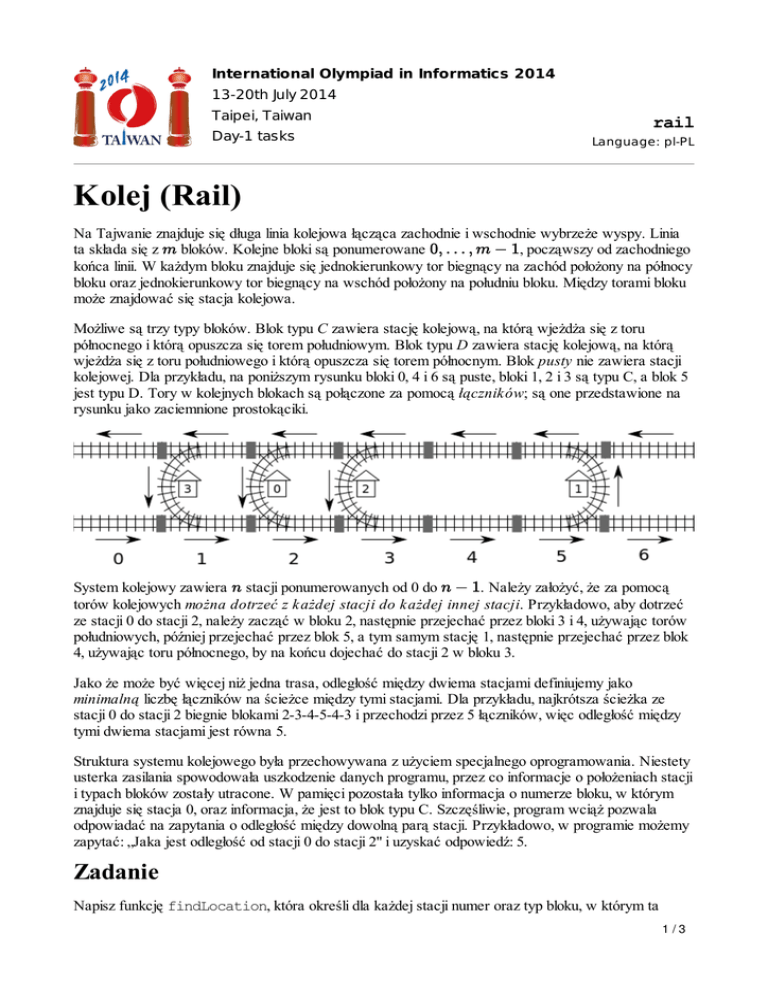 InternationalOlympiadinInformatics2014 13-20thJuly2014 Taipei,Taiwan Day-1tasks rail Language:pl-PL Kolej(Rail) NaTajwanieznajdujesiędługaliniakolejowałączącazachodnieiwschodniewybrzeżewyspy.Linia taskładasięz bloków.Kolejneblokisąponumerowane ,począwszyodzachodniego końcalinii.Wkażdymblokuznajdujesięjednokierunkowytorbiegnącynazachódpołożonynapółnocy blokuorazjednokierunkowytorbiegnącynawschódpołożonynapołudniubloku.Międzytoramibloku możeznajdowaćsięstacjakolejowa. Możliwesątrzytypybloków.BloktypuCzawierastacjękolejową,naktórąwjeżdżasięztoru północnegoiktórąopuszczasiętorempołudniowym.BloktypuDzawierastacjękolejową,naktórą wjeżdżasięztorupołudniowegoiktórąopuszczasiętorempółnocnym.Blokpustyniezawierastacji kolejowej.Dlaprzykładu,naponiższymrysunkubloki0,4i6sąpuste,bloki1,2i3sątypuC,ablok5 jesttypuD.Torywkolejnychblokachsąpołączonezapomocąłączników;sąoneprzedstawionena rysunkujakozaciemnioneprostokąciki. Systemkolejowyzawiera stacjiponumerowanychod0do .Należyzałożyć,żezapomocą torówkolejowychmożnadotrzećzkażdejstacjidokażdejinnejstacji.Przykładowo,abydotrzeć zestacji0dostacji2,należyzacząćwbloku2,następnieprzejechaćprzezbloki3i4,używająctorów południowych,późniejprzejechaćprzezblok5,atymsamymstację1,następnieprzejechaćprzezblok 4,używająctorupółnocnego,bynakońcudojechaćdostacji2wbloku3. Jakożemożebyćwięcejniżjednatrasa,odległośćmiędzydwiemastacjamidefiniujemyjako minimalnąliczbęłącznikównaścieżcemiędzytymistacjami.Dlaprzykładu,najkrótszaścieżkaze stacji0dostacji2biegnieblokami2-3-4-5-4-3iprzechodziprzez5łączników,więcodległośćmiędzy tymidwiemastacjamijestrówna5. Strukturasystemukolejowegobyłaprzechowywanazużyciemspecjalnegooprogramowania.Niestety usterkazasilaniaspowodowałauszkodzeniedanychprogramu,przezcoinformacjeopołożeniachstacji itypachblokówzostałyutracone.Wpamięcipozostałatylkoinformacjaonumerzebloku,wktórym znajdujesięstacja0,orazinformacja,żejesttobloktypuC.Szczęśliwie,programwciążpozwala odpowiadaćnazapytaniaoodległośćmiędzydowolnąparąstacji.Przykładowo,wprogramiemożemy zapytać:„Jakajestodległośćodstacji0dostacji2"iuzyskaćodpowiedź:5. Zadanie NapiszfunkcjęfindLocation,któraokreślidlakażdejstacjinumeroraztypbloku,wktórymta 1/3 stacjasięznajduje. findLocation(n,first,location,stype) n:liczbastacji. first:numerbloku,wktórymznajdujesięstacja0. location:tablicarozmiaru ;location[i]powinnonakońcudziałaniafunkcji zawieraćnumerbloku,wktórymznajdujesięstacja . stype:tablicarozmiaru ;stype[i]powinnonakońcudziałaniafunkcjizawieraćtyp bloku,wktórymznajdujesięstacja :1dlatypuC,a2dlatypuD. PrzyustalaniupołożeńitypówstacjiTwojafunkcjamożeużywaćfunkcjigetDistance: getDistance(i,j)dajewwynikuodległośćodstacjiidostacjij.getDistance(i,i) dajewynik0.getDistance(i,j)dajewynik-1,jeśliilubjznajdujesiępozazakresem . Podzadania Wewszystkichpodzadaniachliczbabloków nieprzekracza1,000,000.Wniektórychpodzadaniach liczbawywołańfunkcjigetDistancejestograniczona.Ograniczenietozależyodkonkretnego podzadania.JeśliTwójprogramprzekroczytoograniczenie,otrzymawynik'wronganswer',. maxliczba wywołań dodatkoweograniczenia getDistance brak Wszystkiestacjepozastacją0znajdują ograniczeń sięwblokachtypuD. Wszystkiestacjepołożonenawschód odstacji0znajdująsięwblokachtypu brak D,awszystkiestacjepołożonena ograniczeń zachódodstacji0znajdująsięw blokachtypuC. podzadanie liczba punktów 1 8 2 22 3 26 brak 4 44 brak Implementacja Powinieneśzgłosićdokładniejedenplikonazwierail.c,rail.cpplubrail.pas.Wpliku powinnaznaleźćsięimplementacjafunkcjifindLocationopisanejpowyżej,onastępującej sygnaturze.WprzypadkuprogramuwC/C++powinieneśtakżezałączyć(include)pliknagłówkowy rail.h. ProgramywC/C++ voidfindLocation(intn,intfirst,intlocation[],intstype[]); 2/3 ProgramywPascalu procedurefindLocation(n,first:longint;varlocation, stype:arrayoflongint); SygnaturyfunkcjigetDistancesąnastępujące. ProgramywC/C++ intgetDistance(inti,intj); ProgramywPascalu functiongetDistance(i,j:longint):longint; Przykładowyprogramsprawdzający Przykładowyprogramsprawdzającywczytujedanewnastępującymformacie: wiersz1:numerpodzadania wiersz2:n wiersz ,( ):stype[i](1dlatypuCi2dlatypuD),location[i]. PrzykładowyprogramsprawdzającywypiszekomunikatCorrect,jeślilocation[0]... location[n-1]orazstype[0]...stype[n-1]nakońcuwywołaniaTwojejfunkcji findLocationbędąidentyczneztymipodanyminawejściu,aIncorrect,jeśliniesąone identyczne. 3/3