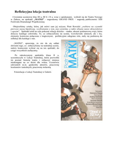 Refleksyjna lekcja teatralna 4 kwietnia uczniowie klas III a, III b i II a, wraz z opiekunami, wybrali się do Teatru Nowego w Zabrzu, na spektakl „MATKI” - nagrodzony GRAND PRIX – nagrodą publiczności XIII Festiwalu Dramaturgii Współczesnej. Obejrzeliśmy sztukę, która, jak mówi sam jej reżyser, Piotr Rowicki „rozbiera na czynniki pierwsze naszą hipokryzję, wyobrażania o tym, jacy jesteśmy, a także obnaża nasze okrucieństwo i egozim”. Spektakl miał na celu pokazać relację dziecko – matka, ukazać podstawową więź, która dotyczy każdego człowieka. To, co zobaczylismy na scenie, wywoływało uśmiech, ale i łzy, elementy komiczne połączone z tragicznymi, perfekcyjnie odegrane role, stały się podstawą do refleksji dla każdego z nas. „MATKI”, sprawiają, że nie da się oddać słowami tego, co zobaczylismy na teatralnej scenie, należy koniecznie wybrać się na ten spektakl, do czego wszystkich zachęcamy. Po zakończonym spektaklu klasa II a, uczestniczyła w Lekcji Teatralnej, która pozwoliła im poznać historię teatru i zobaczyć miejsca niedostępne na co dzień dla widza. Uczniowie odwiedzili m.in. garderoby aktorów, pracownię kostiumów teatralnych, pracownię stolarską Fotorelacja z Lekcji Teatralnej w Galerii.