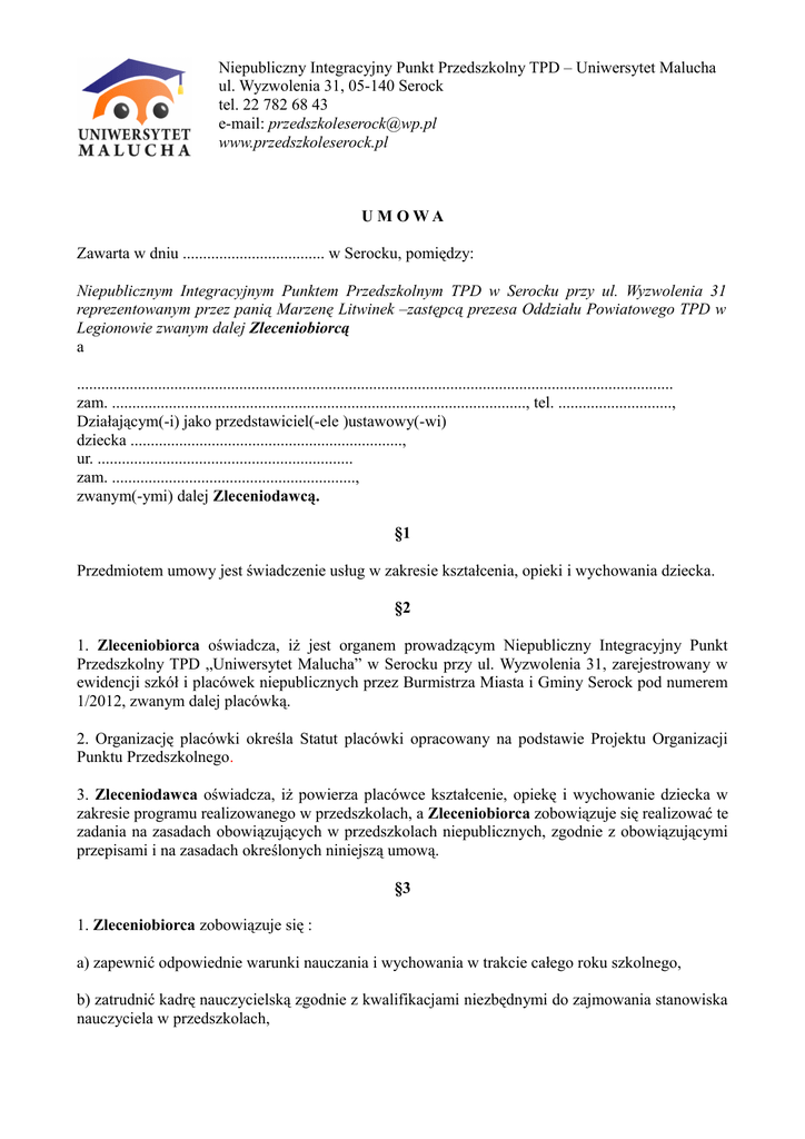 Niepubliczny Integracyjny Punkt Przedszkolny TPD – Uniwersytet Malucha ul. Wyzwolenia 31, 05-140 Serock tel. 22 782 68 43 e-mail: [email protected] www.przedszkoleserock.pl U M O WA Zawarta w dniu ................................... w Serocku, pomiędzy: Niepublicznym Integracyjnym Punktem Przedszkolnym TPD w Serocku przy ul. Wyzwolenia 31 reprezentowanym przez panią Marzenę Litwinek –zastępcą prezesa Oddziału Powiatowego TPD w Legionowie zwanym dalej Zleceniobiorcą a ................................................................................................................................................... zam. ......................................................................................................, tel. ............................, Działającym(-i) jako przedstawiciel(-ele )ustawowy(-wi) dziecka ..................................................................., ur. ............................................................... zam. ............................................................, zwanym(-ymi) dalej Zleceniodawcą. §1 Przedmiotem umowy jest świadczenie usług w zakresie kształcenia, opieki i wychowania dziecka. §2 1. Zleceniobiorca oświadcza, iż jest organem prowadzącym Niepubliczny Integracyjny Punkt Przedszkolny TPD „Uniwersytet Malucha” w Serocku przy ul. Wyzwolenia 31, zarejestrowany w ewidencji szkół i placówek niepublicznych przez Burmistrza Miasta i Gminy Serock pod numerem 1/2012, zwanym dalej placówką. 2. Organizację placówki określa Statut placówki opracowany na podstawie Projektu Organizacji Punktu Przedszkolnego. 3. Zleceniodawca oświadcza, iż powierza placówce kształcenie, opiekę i wychowanie dziecka w zakresie programu realizowanego w przedszkolach, a Zleceniobiorca zobowiązuje się realizować te zadania na zasadach obowiązujących w przedszkolach niepublicznych, zgodnie z obowiązującymi przepisami i na zasadach określonych niniejszą umową. §3 1. Zleceniobiorca zobowiązuje się : a) zapewnić odpowiednie warunki nauczania i wychowania w trakcie całego roku szkolnego, b) zatrudnić kadrę nauczycielską zgodnie z kwalifikacjami niezbędnymi do zajmowania stanowiska nauczyciela w przedszkolach, c) realizować program kształcenia i wychowania zgodnie z podstawą programową wychowania przedszkolnego, d) zapewnić opiekę nad dzieckiem przez cały rok szkolny, od poniedziałku do piątku, w godzinach 700 – 1700, we wszystkie dni robocze oraz opiekę w godzinach ponadnormatywnych, o których mowa w §5 ust. 1 pkt h, e) zapewnić śniadanie, obiad i podwieczorek, zgodnie z normami i zasadami zdrowego żywienia. Godziny posiłków znajdują się w ramowym harmonogramie dnia, który jest dostępny na stronie internetowej placówki (www.przedszkoleserock.pl), f) współdziałać z rodzicami w zakresie kształcenia, wychowania i opieki nad dzieckiem, g) prowadzić dodatkowe zajęcia ( np. ceramika, korektywa, taniec) w wymiarze 4 godzin w miesiącu, po utworzeniu na dane zajęcia grupy liczącej co najmniej 15 dzieci, h) prowadzić zajęcia wakacyjne, bez względu na liczbę chętnych dzieci do korzystania z zajęć w tym okresie. §4 Zleceniobiorcy przysługuje wynagrodzenie za usługi określone niniejszą umową, w tym wynagrodzenie za gotowość do ich świadczenia związane ze stałymi kosztami, jakie ponosi placówka w celu przygotowania usług do ich świadczenia. §5 1. Zleceniodawca zobowiązuje się: a) przyprowadzać dziecko do godziny 830 w dobrym stanie zdrowia, b) uiścić jednorazową opłatę wpisową w wysokości 200 zł przy zapisywaniu dziecka do placówki celem rezerwacji miejsca, z przeznaczeniem na fundusz rozwoju, c) opłacać czesne w wysokości 350 zł miesięcznie najpóźniej do dnia 3-go każdego miesiąca, wraz z ustawowymi odsetkami w przypadku opóźnienia w zapłacie, liczonymi od dnia następnego po upływie terminu zapłaty, w formie przelewu na konto nr 83 8013 0006 2001 0000 0589 0001 lub gotówką w kasie placówki i w takiej samej wysokości opłacać czesne za okres nieobecności dziecka bez względu na charakter i okres nieobecności, d) uiszczać co miesiąc opłatę za żywienie dziecka w wysokości 8 zł dziennie, płatną z dołu, w terminie do dnia 3 każdego następnego miesiąca, wraz z ustawowymi odsetkami w przypadku opóźnienia w zapłacie, liczonymi od dnia następnego po upływie terminu zapłaty, w formie gotówki w kasie placówki, na podstawie listy obecności w dziennika zajęć. Zleceniodawca zobowiązany jest do zawiadomienia o nieobecności dziecka najpóźniej na dzień przed planowaną nieobecnością. W takim wypadku nie nalicza się opłaty za wyżywienie za dany dzień nieobecności. W nagłych wypadkach nie nalicza się tej opłaty od następnego dnia po dniu zgłoszenia nieobecności, e) w przypadku zgłoszenia dziecka do udziału w zajęciach dodatkowych, uiszczać miesięczne opłaty osobie prowadzącej zajęcia, f) zawiadomić o rezygnacji z udziału dziecka w zajęciach dodatkowych najpóźniej na miesiąc przed planowaną rezygnacją. W takim przypadku niniejsza umowa trwa nadal w zakresie pozostałych świadczeń, a obowiązek Zleceniodawcy związany z opłatą zajęć dodatkowych ustaje z końcem miesiąca, w którym upływa okres przewidziany na zgłoszenie rezygnacji, g) w przypadku zgłoszenia dziecka do udziału w zajęciach wakacyjnych, uiszczać miesięczne opłaty w wysokości 350zł płatne według zasad opłaty czesnego oraz zasad opłaty za wyżywienie, h) odbierać dziecko najpóźniej do godziny 1700. W przypadkach opieki w godzinach: 600- 700 i 1700 – 1800 Zleceniodawca zobowiązuje się do uiszczenia opłaty za dany dzień opieki ponadnormatywnej w wysokości 25zł/godz, płatnej najpóźniej na jeden dzień przed planowanym późniejszym odebraniem dziecka, a w przypadkach losowych w tym samym dniu, gotówką w kasie placówki, i) na bieżąco informować pracowników placówki odnośnie sytuacji prawnej dzi