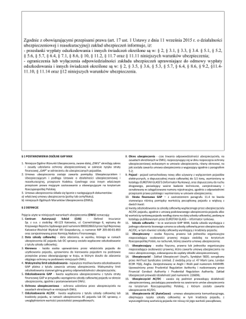 Zgodnie z obowiązującymi przepisami prawa (art. 17 ust. 1 Ustawy z dnia 11 września 2015 r. o działalności ubezpieczeniowej i reasekuracyjnej) zakład ubezpieczeń informuje, iż: - przesłanki wypłaty odszkodowania i innych świadczeń określone są w: § 2, § 3.1, § 3.3, § 3.4. § 5.1, § 5.2, § 5.6, § 5.7, § 6.4, § 7.1, § 8.6, § 10, § 11.2, § 11.7 oraz § 11.11 niniejszych warunków ubezpieczenia; - ograniczenia lub wyłączenia odpowiedzialności zakładu ubezpieczeń uprawniające do odmowy wypłaty odszkodowania i innych świadczeń określone są w: § 2, § 3.5, § 3.6, § 5.3, § 5.7, § 6.4, § 8.6, § 9.2, §11.411.10, § 11.14 oraz §12 niniejszych warunków ubezpieczenia. § 1 POSTANOWIENIA OGÓLNE GAP MAX 1. Niniejsze Ogólne Warunki Ubezpieczenia, zwane dalej „OWU” określają zakres i zasady udzielania ochrony ubezpieczeniowej w zakresie ryzyka straty finansowej „GAP” w odniesieniu do ubezpieczanych pojazdów. 2. Umowa ubezpieczenia zostaje zawarta pomiędzy Ubezpieczycielem i Ubezpieczającym i podlega Ustawie o działalności ubezpieczeniowej i reasekuracyjnej, przepisom Kodeksu Cywilnego oraz innym właściwym przepisom prawa mającym zastosowanie a obowiązującym na terytorium Rzeczypospolitej Polskiej. 3. Umowa ubezpieczenia składa się łącznie z następujących dokumentów: a) właściwej umowy ubezpieczenia (polisy lub certyfikatu); b) niniejszych Ogólnych Warunków Ubezpieczenia (OWU); § 2 DEFINICJE Pojęcia użyte w niniejszych warunkach ubezpieczenia (OWU) oznaczają: 1. Centrum Autoryzacji Szkód (CAS) Defend Insurance Sp. z o.o. z siedzibą: 40-123 Katowice, ul. Czerwińskiego 6, wpisaną do Krajowego Rejestru Sądowego pod numerem 0000228653 przez Sąd Rejonowy Katowice-Wschód Wydział VIII Gospodarczy, o numerze NIP 205-00-01-853 oraz zarejestrowaną przez Komisję Nadzoru Finansowego; 2. Data szkody całkowitej - data zdarzenia, w wyniku, którego w ramach ubezpieczenia AC pojazdu lub OC sprawcy zostało wypłacone odszkodowanie z tytułu szkody całkowitej; 3. Kierowca - każda osoba upoważniona przez właściciela pojazdu do użytkowania pojazdu, uprawniona do kierowania pojazdem na podstawie przepisów prawa obowiązującego w kraju, w którym doszło do zdarzenia objętego ochroną na podstawie niniejszych OWU; 4. Maksymalny limit odszkodowania - najwyższa możliwa kwota odszkodowania GAP płatna z tytułu zawarcia umowy ubezpieczenia. Maksymalny limit odszkodowania stanowi górną granicę odpowiedzialności ubezpieczyciela; 5. Odszkodowanie GAP - kwota wypłacana ubezpieczonemu z tytułu straty finansowej GAP w przypadku wystąpienia szkody całkowitej pojazdu w okresie ubezpieczenia, zgodnie z postanowieniami OWU; 6. Ochrona ubezpieczeniowa - ochrona udzielana przez ubezpieczyciela na zasadach określonych w niniejszych OWU; 7. Odszkodowanie AC/OC - kwota wypłacona z tytułu szkody całkowitej lub kradzieży pojazdu, w ramach ubezpieczenia AC pojazdu lub OC sprawcy, z uwzględnieniem wartości pozostałości powypadkowych; 8. Okres ubezpieczenia - czas trwania odpowiedzialności ubezpieczyciela, na zasadach określonych w OWU, rozpoczynający się w dniu rozpoczęcia ochrony ubezpieczeniowej wskazanym w umowie ubezpieczenia, równy okresowi, na jaki została zawarta umowa ubezpieczenia a wygasający zgodnie z paragrafem 5.2; 9. Pojazd - pojazd samochodowy nowy albo używany z wyłączeniem pojazdów elektrycznych, o dopuszczalnej masie całkowitej do 3,5 tony, wymieniony w katalogu EUROTAX GLASS’S (Informator Rynkowy), oraz dopuszczony do ruchu drogowego, posiadający ważne badanie techniczne, zarejestrowany i oznakowany w zalegalizowane numery rejestracyjne, zgodnie z odpowiednimi przepisami prawa polskiego i wymieniony w umowie ubezpieczenia; 10. Strata finansowa GAP – z zastrzeżeniem paragrafu 11.4 to kwota stanowiąca różnicę pomiędzy wartością początkową pojazdu a większą z dwóch kwot: a) kwotą odszkodowania za szkodę całkowitą wypłaconego przez ubezpieczyciela AC/OC pojazdu, zgodnie z umową podstawowego ubezpieczenia pojazdu albo b) wartością rynkową pojazdu według stanu na datę szkody całkowitej, podaną w katalogu publikowanym przez EUROTAX GLASS – informator rynkowy. 11. Szkoda całkowita – to w wariancie GAP MAX, każda szkoda wynikająca z jednego zdarzenia losowego uznana za szkodę całkowitą przez ubezpieczyciela AC/OC, w tym również szkodę całkowitą wynikającą z kradzieży pojazdu; 12. Ubezpieczony - osoba fizyczna, prawna lub jednostka organizacyjna nieposiadająca osobowości prawnej mająca siedzibę na terytorium Rzeczpospolitej Polski, na rachunek, której zawarto umowę ubezpieczenia; 13. Ubezpieczający - osoba fizyczna, prawna lub jednostka organizacyjna nieposiadająca osobowości prawnej, która zawarła umowę ubezpieczenia na rzecz ubezpieczonego, zobowiązana do zapłaty składki ubezpieczeniowej; 14. Ubezpieczyciel - Zakład Ubezpieczeń Lloyd’s, Syndykat 5820, zarządzany przez AmTrust Syndicates Limited. Z siedzibą przy ul. 47 Mark Lane, Londyn EC3R 7QQ, Anglia. Zarejestrowany w Anglii i Walii pod numerem 4434499. Upoważniony przez Prudential Regulation Authority i nadzorowany przez Financial Conduct Authority i Prudential Regulation Authority. Zakład Ubezpieczeń prowadzi działalność pod numerem: 226696; 15. Ubezpieczyciel AC/OC - uważa się podmiot prowadzący działalność ubezpieczeniową, posiadający pozwolenie na zawieranie umów ubezpieczenia na terytorium Rzeczypospolitej Polskiej, z którym zostało zawarte ubezpieczenie AC/OC; 16. Ubezpieczenie AC (AutoCasco) - umowa ubezpieczenia komunikacyjnego, obejmująca ryzyko szkody całkowitej w tym kradzieży pojazdu, z wyszczególnioną wartością pojazdu nie niższą niż jego wartość początkowa; 17. Ubezpieczenie OC - obowiązkowe ubezpieczenie odpowiedzialności cywilnej posiadaczy pojazdów mechanicznych na podstawie którego, udzielana jest ochrona z tytułu skutków szko