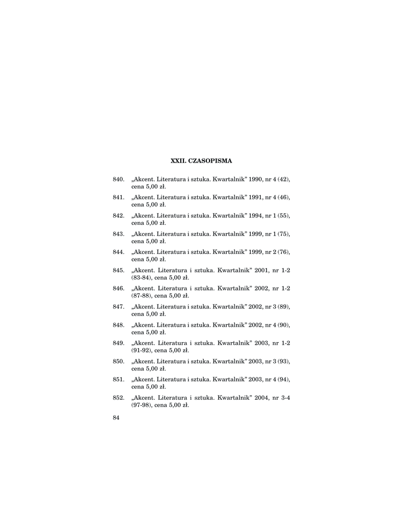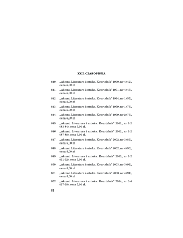 XXII. CZASOPISMA 840. Akcent. Literatura i sztuka. Kwartalnik 1990, nr 4 (42), cena 5,00 z³. 841. Akcent. Literatura i sztuka. Kwartalnik 1991, nr 4 (46), cena 5,00 z³. 842. Akcent. Literatura i sztuka. Kwartalnik 1994, nr 1 (55), cena 5,00 z³. 843. Akcent. Literatura i sztuka. Kwartalnik 1999, nr 1 (75), cena 5,00 z³. 844. Akcent. Literatura i sztuka. Kwartalnik 1999, nr 2 (76), cena 5,00 z³. 845. Akcent. Literatura i sztuka. Kwartalnik 2001, nr 1-2 (83-84), cena 5,00 z³. 846. Akcent. Literatura i sztuka. Kwartalnik 2002, nr 1-2 (87-88), cena 5,00 z³. 847. Akcent. Literatura i sztuka. Kwartalnik 2002, nr 3 (89), cena 5,00 z³. 848. Akcent. Literatura i sztuka. Kwartalnik 2002, nr 4 (90), cena 5,00 z³. 849. Akcent. Literatura i sztuka. Kwartalnik 2003, nr 1-2 (91-92), cena 5,00 z³. 850. Akcent. Literatura i sztuka. Kwartalnik 2003, nr 3 (93), cena 5,00 z³. 851. Akcent. Literatura i sztuka. Kwartalnik 2003, nr 4 (94), cena 5,00 z³. 852. Akcent. Literatura i sztuka. Kwartalnik 2004, nr 3-4 (97-98), cena 5,00 z³. 84 853. Akcent. Literatura i sztuka. Kwartalnik 2005, nr 2 (100), cena 5,00 z³. 854. Akcent. Literatura i sztuka. Kwartalnik Bibliografia. Dokumentacja 1980-1995, cena 5,00 z³. 855. Akcent. Literatura i sztuka. Kwartalnik. Bibliografia. Dokumentacja, tom drugi lata 1995-2004, cena 5,00 z³. 856. Alma Mater. 25 lat akademickiego kszta³cenia pielêgniarek. Wspomnienia, fakty, refleksje kwiecieñ-czerwiec 1995, nr 2, cena 5,00 z³. 857. Ameryka nr 208, cena 3,00 z³. 858. Annales Universitatis Mariae Curie-Sk³odowska, Sectio D, Medicina 2003, vol. LVII, Suppl. XI, cena 30,00 z³ (2 egz.). 859. Annales Universitatis Mariae Curie-Sk³odowska, Sectio D, Medicina 2003, vol. LVIII, Suppl. XIII, cena 30,00 z³. 860. Apel Jasnogórski. Jubileusz 600-lecia Matki Bo¿ej Jasnogórskiej 1982, z. 1, cena 8,00 z³. 861. Archiwa, biblioteki i muzea kocielne 1995, t. 64, cena 5,00 z³. 862. Arka. Eseistyka, krytyka, literatura 1983-1984, nr 1-9, cena 15,00 z³. 863. Arka. Eseistyka, krytyka, literatura 1985, nr 10-12, cena 15,00 z³. 864. Arka. Eseistyka, krytyka, literatura 1986, nr 14-16, cena 15,00 z³. 865. Bibliotekarz Lubelski [Rocznik] 1997, nr 128; Bibliotekarz Lubelski. Spis treci roczników 1986-1995 [Dodatek do Bibliotekarza Lubelskiego 1996], cena 5,00 z³. 866. Biuletyn Informacyjny. Miesiêcznik wiatowego Zwi¹zku ¯o³nierzy Armii Krajowej 2001, nr 2 (130), cena 3,00 z³. 867. Biuletyn Informacyjny. Zwi¹zek Gmin Lubelszczyzny 2001, nr 3 (22), cena 1,00 z³. 868. Biuletyn Synodalny, Archidiecezjalna Rada Synodu Plenarnego w Lublinie 1994, nr 2, cena 3,00 z³. 85 869. Carpe Diem. Pismo ludzi twórczych 1998, nr 1, cena 2,00 z³. 870. Christianitas. Religia Kultura Spo³eczeñstwo 1999, nr 1/2, cena 5,00 z³. 871. Chrystusowcy wród Polonii 1977, nr 9 (396) , cena 3,00 z³. 872. Chrzecijanin w wiecie. Zeszyty ODiSS 1988, nr 11 (182), cena 8,00 z³. 873. Currenda. Organ Urzêdowy Diecezji Tarnowskiej 1986, nr 4-6, cena 5,00 z³. 874. Dialogue-USA 1977, nr 2, cena 5,00 z³. 875. Dialogue-USA 1979, nr 4, cena 5,00 z³. 876. Fronda. Pismo Powiêcone 1997, nr 8, cena 8,00 z³. 877. Fronda. Pismo Powiêcone 2000, nr 19/20, cena 8,00 z³. 878. Gadki z chatki. Pismo folkowe 2001, nr II-III (33/34), cena 3,50 z³. 879. Gadki z chatki. Pismo folkowe 2001, nr IV-V (35/36), cena 3,50 z³. 880. Gadki z chatki. Pismo folkowe 2002, nr 4-5 (41/42), cena 3,50 z³. 881. G³os z wieczernika. Parafia Wieczerzy Pañskiej styczeñ 2004, nr 60, cena 3,00 z³. 882. Informator Parlamentarny Obywatelskiego Klubu Parlamentarnego i Komitetów Obywatelskich Solidarnoæ z Wiejskiej 1989, nr 2, cena 1,00 z³. 883. Informator Parlamentarny Obywatelskiego Klubu Parlamentarnego i Komitetów Obywatelskich Solidarnoæ z Wiejskiej 1989, nr 3, cena 1,00 z³. 884. Informator Parlamentarny Obywatelskiego Klubu Parlamentarnego i Komitetów Obywatelskich Solidarnoæ z Wiejskiej 1989, nr 4, cena 1,00 z³. 885. Informator Parlamentarny Obywatelskiego Klubu Parlamentarnego i Komitetów Obywatelskich Solidarnoæ z Wiejskiej 1989, nr 5, cena 1,00 z³. 86 886. Informator Parlamentarny Obywatelskiego Klubu Parlamentarnego i Komitetów Obywatelskich Solidarnoæ z Wiejskiej 1989, nr 6, cena 1,00 z³. 887. Informator Parlamentarny Obywatelskiego Klubu Parlamentarnego i Komitetów Obywatelskich Solidarnoæ z Wiejskiej 1989, nr 7, cena 1,00 z³. 888. Informator Parlamentarny Obywatelskiego Klubu Parlamentarnego i Komitetów Obywatelskich Solidarnoæ z Wiejskiej 1990, nr 8/9, cena 1,00 z³. 889. Informator Parlamentarny Obywatelskiego Klubu Parlamentarnego i Komitetów Obywatelskich Solidarnoæ z Wiejskiej 1990, nr 10, cena 1,00 z³. 890. Informator Parlamentarny Obywatelskiego Klubu Parlamentarnego i Komitetów Obywatelskich Solidarnoæ z Wiejskiej 1990, nr 11, cena 1,00 z³. 891. Informator Parlamentarny Obywatelskiego Klubu Parlamentarnego i Komitetów Obywatelskich Solidarnoæ z Wiejskiej 1990, nr 12, cena 1,00 z³. 892. Informator Parlamentarny Obywatelskiego Klubu Parlamentarnego i Komitetów Obywatelskich Solidarnoæ z Wiejskiej 1990, nr 13, cena 1,00 z³. 893. Informator Parlamentarny Obywatelskiego Klubu Parlamentarnego i Komitetów Obywatelskich Solidarnoæ z Wiejskiej 1990, nr 14, cena 1,00 z³. 894. Informator Parlamentarny Obywatelskiego Klubu Parlamentarnego i Komitetów Obywatelskich Solidarnoæ z Wiejskiej 1990, nr 15, cena 1,00 z³. 895. Informator Parlamentarny Obywatelskiego Klubu Parlamentarnego i Komitetów Obywatelskich Solidarnoæ z Wiejskiej 1990, nr 16, cena 1,00 z³. 896. Informator Parlamentarny Obywatelskiego Klubu Parlamentarnego i Komitetów Obywatelskich Solidarnoæ z Wiejskiej 1990, nr 17, cena 1,00 z³. 897. Informator Parlamentarny Obywatelskiego Klubu Parlamentarnego i Komitetów Obywatelskich Solidarnoæ z Wiejskiej 1990, nr 18, cena 1,00 z³. 87 898. Informator Parlamentarny Obywatelskiego Klubu Parlamentarnego i Komitetów Obywatelskich Solidarnoæ z Wiejskiej 1990, nr 19, cena 1,00 z³.