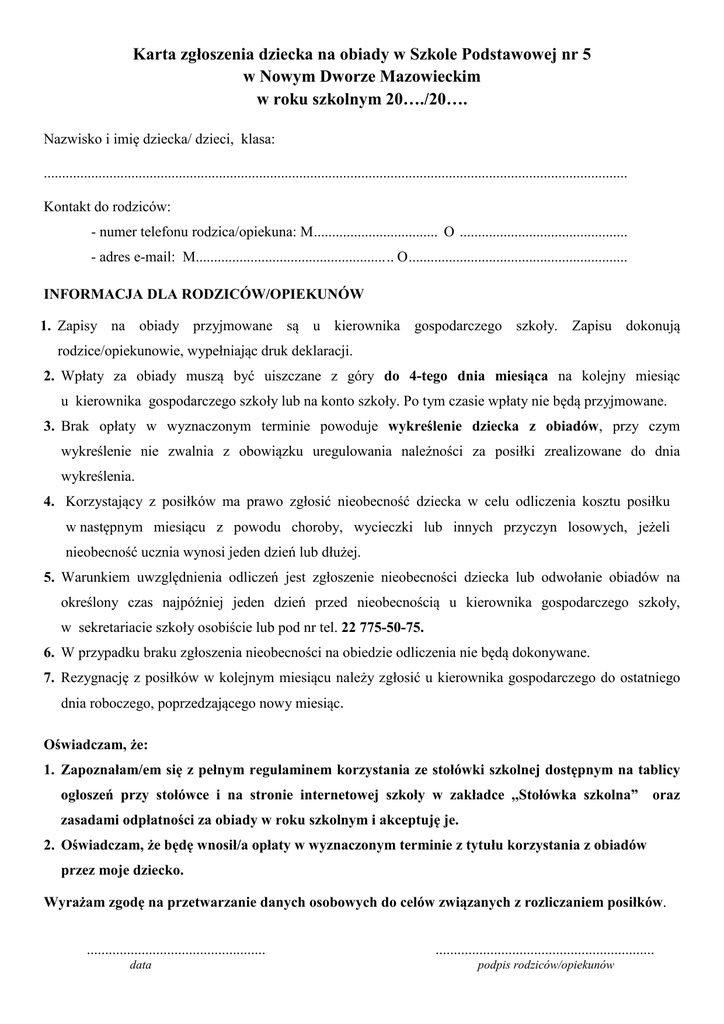 Karta zgłoszenia dziecka na obiady w Szkole Podstawowej nr 5 w Nowym Dworze Mazowieckim w roku szkolnym 20…./20…. Nazwisko i imię dziecka/ dzieci, klasa: ................................................................................................................................................................ Kontakt do rodziców: - numer telefonu rodzica/opiekuna: M .................................. O .............................................. - adres e-mail: M.................................................... .. O ............................................................ INFORMACJA DLA RODZICÓW/OPIEKUNÓW 1. Zapisy na obiady przyjmowane są u kierownika gospodarczego szkoły. Zapisu dokonują rodzice/opiekunowie, wypełniając druk deklaracji. 2. Wpłaty za obiady muszą być uiszczane z góry do 4-tego dnia miesiąca na kolejny miesiąc u kierownika gospodarczego szkoły lub na konto szkoły. Po tym czasie wpłaty nie będą przyjmowane. 3. Brak opłaty w wyznaczonym terminie powoduje wykreślenie dziecka z obiadów, przy czym wykreślenie nie zwalnia z obowiązku uregulowania należności za posiłki zrealizowane do dnia wykreślenia. 4. Korzystający z posiłków ma prawo zgłosić nieobecność dziecka w celu odliczenia kosztu posiłku w następnym miesiącu z powodu choroby, wycieczki lub innych przyczyn losowych, jeżeli nieobecność ucznia wynosi jeden dzień lub dłużej. 5. Warunkiem uwzględnienia odliczeń jest zgłoszenie nieobecności dziecka lub odwołanie obiadów na określony czas najpóźniej jeden dzień przed nieobecnością u kierownika gospodarczego szkoły, w sekretariacie szkoły osobiście lub pod nr tel. 22 775-50-75. 6. W przypadku braku zgłoszenia nieobecności na obiedzie odliczenia nie będą dokonywane. 7. Rezygnację z posiłków w kolejnym miesiącu należy zgłosić u kierownika gospodarczego do ostatniego dnia roboczego, poprzedzającego nowy miesiąc. Oświadczam, że: 1. Zapoznałam/em się z pełnym regulaminem korzystania ze stołówki szkolnej dostępnym na tablicy ogłoszeń przy stołówce i na stronie internetowej szkoły w zakładce ,,Stołówka szkolna” oraz zasadami odpłatności za obiady w roku szkolnym i akceptuję je. 2. Oświadczam, że będę wnosił/a opłaty w wyznaczonym terminie z tytułu korzystania z obiadów przez moje dziecko. Wyrażam zgodę na przetwarzanie danych osobowych do celów związanych z rozliczaniem posiłków. ................................................. data ............................................................ podpis rodziców/opiekunów