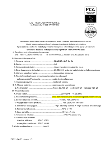 LAB – TEST LABORATORIUM S.C. ul. Piastów 6, 40-868 KATOWICE SPRAWOZDANIE NR DZ/11/06/15 SPRAWOZDANIE ZAWIERA 3 NUMEROWANE STRONY Wyniki przeprowadzonych badań odnoszą się wyłącznie do badanych obiektów Sprawozdanie z badań nie może być powielane inaczej niż w całości bez pisemnej zgody Laboratorium Określenie działania metodą ilościową wg PN-EN 1657:2006+AC:2007 A. Dane informacyjne laboratorium badawczego LAB – TEST LABORATORIUM S.C 40-868 KATOWICE, ul. Piastów 6; tel./fax. (32)203-63-42 B. Dane identyfikacyjne próbki: 1. Preparat badany: ............................................SILVECO- SNT Ag 2k 2. Seria.................................................................bd 3. Producent/dystrybutor......................................Smart Nanotechnologies Sp. z o.o. 4. Data dostarczenia do badań............................29.03.2015; próbę do badań dostarczył zleceniodawca 5. Warunki przechowywania................................temperatura pokojowa 6. Rozcieńczalnik płynu do przygotowania roztworów roboczych zalecany przez Producenta .......................woda demineralizowana 7. Substancje czynne .......................................nadtlenek wodoru C. 1. Metoda badania .........................................rozcieńczenie-neutralizacja 2. Neutralizator: ..............................................Tween 80, 100 g/l + lecytyna 30 g/l + katalaza 0,25 g/l D. Warunki badania: 1. Okres badań.................................................................29.03.2015 – 15.06.2015 2. Rozcieńczalnik preparatu............................woda demineralizowana dostarczona przez zleceniodawcę 3. Badane stężenia produktu........................................ 18,75%; 75% ; 80% v/v 4. Wygląd rozcieńczeń produktu........................................ 75% ; 80% v/v - mleczne 5. Substancje obciążające..................................10 g/l albuminy wołowej + 10 g/l ekstraktu drożdżowego 6. Temperatura badania....................................................10°C 7. Czas kontaktu ...............................................................60 min 1°C 1 min 8. Temperatura inkubacji................................................................30ºC±1ºC; posiew lany 9. Szczepy użyte do badań: Candida albicans ATCC 10231 Aspergillus brasiliensis ATCC 16404 E. Wyniki przedstawiono w....................... tabeli 1 DZ/11/06/15 strona 1/3 TABELA 1 Wyniki badania preparatu: SILVECO- SNT Ag 2k metodą ilościową wg PN – EN 1657:2006+AC:2007 Producent/dystrybutor: Smart Nanotechnologies Sp. z o.o. Testowa Organizm zawiesina testowy Zawiesina grzybów Warunki testu Kontrola neutralizatora Kontrola metody rozcieńczenianeutralizacji grzybów -5 10 : 275;298 ATCC 10231 Aspergillus brasiliensis ATCC 16404 temp. testu: 10ºC ± 1 C Procedura testowa dla roztworów produktu stężenia testowe % v/v Test walidacyjny Candida albicans o obciążenie: 1,0 % albuminy wołowej + 1,0% ekstraktu drożdżowego, czas działania: 60 minut Vc: 71;79 Vc: 65;68 1 Nv 0: 7,5•10 A: Vc: 62;74 1 6,6∙10 Vc: 52;61 Vc: 55;67 Nv 0: 5,6•101 A: 6,1∙101 B: 1 6,8•10 Vc: 57;64 B: 10-6: 32;35 Vc: 54;65 6,0•101 Vc - Liczba kolonii na płytce Nv - Liczba jkt/ml w zawiesinie bakteryjnej w teście walidacyjnym; Nv 0= Nv/10 R - Redukcja zdolnych do życia bakterii w log Na - Liczba jkt/ml w mieszaninie testowej 1 C: 6,0∙10 Vc: 60;68 C: 6,4∙101 18,75% 75% 80% Vc 0;0 0;0 0;0 Na < 140 < 140 < 140 < 2,15 < 2,15 < 2,15 7 lg 6 N0 2,9•10 lg N0=6,46 Na R > 4,31± 0,30 > 4,31± 0,30 > 4,31± 0,30 10-5: >165;>165 Vc 0;0 0;0 0;0 10-6: 23;29 Na < 140 < 140 < 140 < 2,15 < 2,15 < 2,15 > 4,26± 0,30 > 4,26± 0,30 > 4,26± 0,30 N: N: 2,9•10 7 2,6•10 N0 2,6•106 lg N0=6,41 lg Na R A - Liczba jkt/ml przy walidacji warunków testu C - Liczba jkt/ml w kontroli metody rozcieńczenia-neutralizacji B - Liczba jkt/ml w kontroli neutralizatora N - Liczba jkt/ml w testowej zawiesinie bakteryjnej; N0= N/10 Warunki testów i neutralizacja zostały zwalidowane pozytywnie, gdyż: 7 7 2 3 - N zawiera się pomiędzy 1.5∙ 10 – 5,0∙10 jkt/ml; - Nv zawiera się pomiędzy 3.0∙ 10 - 1,6∙10 jkt/ml;- B wynosi co najmniej 0,05 Nv; - C wynosi co najmniej 0,05 Nv; - A wynosi co najmniej 0,05 Nv Za miarę niepewności oznaczenia współczynnika redukcji przyjęto wyznaczone średnie wewnątrzlaboratoryjne odchylenie standardowe dla bada ń chemicznych środków dezynfekcyjnych / antyseptycznych wynoszące ± 0,15. Podano wartość niepewności dla współczynnika rozszerzenia k=2 dla poziomu ufności 95%. Niepewność nie dotyczy etapu pobierania prób. DZ/11/06/15 strona 2/3 F. Wniosek: Preparat: SILVECO- SNT Ag 2k badany wg PN-EN 1657:2006+AC:2007, przy obciążeniu 10 g/l albuminy wołowej+ 10 g/l ekstraktu drożdżowego, w czasie 60 min, w temperaturze 10ºC, rozcieńczony w wodzie demineralizowanej (D.2), wykazuje działanie grzybobójcze (redukcja 4 log) wobec: w stężeniu 18,75 ; 75%; 80% v/v Aspergillus brasiliensis ATCC 16404 Candida albicans ATCC 10231 w stężeniu 18,75 ; 75%; 80% v/v Opracował Kierownik laboratorium Sprawdził Z-ca kierownika laboratorium Autoryzował Kierownik laboratorium DZ/11/06/15 strona 3/3