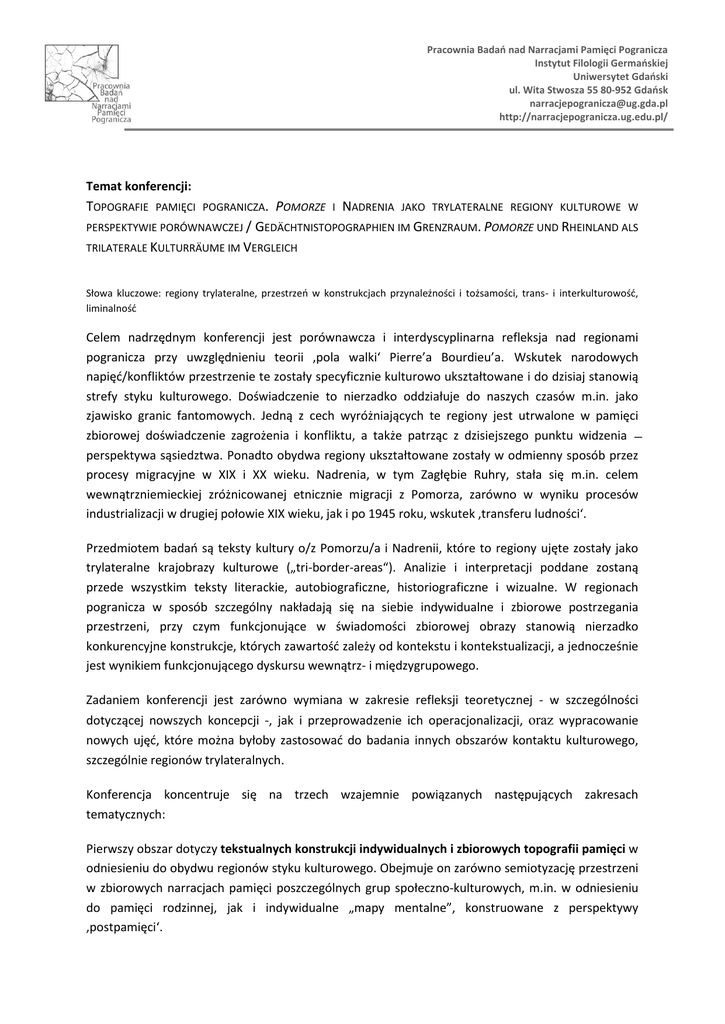 Pracownia Badań nad Narracjami Pamięci Pogranicza Instytut Filologii Germańskiej Uniwersytet Gdański ul. Wita Stwosza 55 80-952 Gdańsk [email protected] http://narracjepogranicza.ug.edu.pl/ Temat konferencji: TOPOGRAFIE PAMIĘCI POGRANICZA. PERSPEKTYWIE PORÓWNAWCZEJ / POMORZE I NADRENIA JAKO TRYLATERALNE REGIONY KULTUROWE W GEDÄCHTNISTOPOGRAPHIEN IM GRENZRAUM. POMORZE UND RHEINLAND ALS TRILATERALE KULTURRÄUME IM VERGLEICH Słowa kluczowe: regiony trylateralne, przestrzeń w konstrukcjach przynależności i tożsamości, trans- i interkulturowość, liminalność Celem nadrzędnym konferencji jest porównawcza i interdyscyplinarna refleksja nad regionami pogranicza przy uwzględnieniu teorii ‚pola walki‘ Pierre’a Bourdieu’a. Wskutek narodowych napięć/konfliktów przestrzenie te zostały specyficznie kulturowo ukształtowane i do dzisiaj stanowią strefy styku kulturowego. Doświadczenie to nierzadko oddziałuje do naszych czasów m.in. jako zjawisko granic fantomowych. Jedną z cech wyróżniających te regiony jest utrwalone w pamięci zbiorowej doświadczenie zagrożenia i konfliktu, a także patrząc z dzisiejszego punktu widzenia ̶ perspektywa sąsiedztwa. Ponadto obydwa regiony ukształtowane zostały w odmienny sposób przez procesy migracyjne w XIX i XX wieku. Nadrenia, w tym Zagłębie Ruhry, stała się m.in. celem wewnątrzniemieckiej zróżnicowanej etnicznie migracji z Pomorza, zarówno w wyniku procesów industrializacji w drugiej połowie XIX wieku, jak i po 1945 roku, wskutek ‚transferu ludności‘. Przedmiotem badań są teksty kultury o/z Pomorzu/a i Nadrenii, które to regiony ujęte zostały jako trylateralne krajobrazy kulturowe („tri-border-areas“). Analizie i interpretacji poddane zostaną przede wszystkim teksty literackie, autobiograficzne, historiograficzne i wizualne. W regionach pogranicza w sposób szczególny nakładają się na siebie indywidualne i zbiorowe postrzegania przestrzeni, przy czym funkcjonujące w świadomości zbiorowej obrazy stanowią nierzadko konkurencyjne konstrukcje, których zawartość zależy od kontekstu i kontekstualizacji, a jednocześnie jest wynikiem funkcjonującego dyskursu wewnątrz- i międzygrupowego. Zadaniem konferencji jest zarówno wymiana w zakresie refleksji teoretycznej - w szczególności dotyczącej nowszych koncepcji -, jak i przeprowadzenie ich operacjonalizacji, oraz wypracowanie nowych ujęć, które można byłoby zastosować do badania innych obszarów kontaktu kulturowego, szczególnie regionów trylateralnych. Konferencja koncentruje się na trzech wzajemnie powiązanych następujących zakresach tematycznych: Pierwszy obszar dotyczy tekstualnych konstrukcji indywidualnych i zbiorowych topografii pamięci w odniesieniu do obydwu regionów styku kulturowego. Obejmuje on zarówno semiotyzację przestrzeni w zbiorowych narracjach pamięci poszczególnych grup społeczno-kulturowych, m.in. w odniesieniu do pamięci rodzinnej, jak i indywidualne „mapy mentalne”, konstruowane z perspektywy ‚postpamięci‘. Pracownia Badań nad Narracjami Pamięci Pogranicza Instytut Filologii Germańskiej Uniwersytet Gdański ul. Wita Stwosza 55 80-952 Gdańsk [email protected] http://narracjepogranicza.ug.edu.pl/ W kontekście tym chodzi przede wszystkim o porównanie projekcji przestrzeni zogniskowanych na wybranych miejscach, uwzględniające różnorodność społeczno-kulturowych perspektyw. Analizie i interpretacji poddane zostaną różne kodowania (i dekodowania) tych samych miejsc (również w znaczeniu ‚miejsc pamięci‘), a także kontekstowe nadawanie/przypisywanie znaczenia poszczególnym miejscom, oraz instrumentalizacja mitów. Uwzględnione zostaną przy tym aspekty transmisji międzypokoleniowej oraz dyskurs medialny. Refleksji poddane zostaną również splot relacji między narracjami dyskursu centralnego i peryferyjnego w aspekcie kulturowym i ideologicznym oraz zastosowane przy tym struktury narracyjne. Odchodząc od „klasycznych” pozycji binarnych w polsko-niemieckich relacjach i dychotomizacji postrzegania, drugi obszar tematyczny koncentruje się na współistnieniu i przenikaniu się zjawisk kulturowych w regionach trylateralnych. Obejmie on przede wszystkim założenia/koncepcje badawcze dotyczące estetycznej i kulturowej hybrydowości, obcości/inności, ‘Alterität’, dialogiczności i intertekstualności. W centrum zainteresowań badawczych znajdują się m.in. literackie zabawy stereotypami, a także konstrukcje swojskości i obcości w odniesieniu do przestrzeni oraz akcentowanie różnic kulturowych, które stawiają pod znakiem zapytania dominujące konstrukcje. Do klasycznych wręcz zagadnień należą w tym kontekście pytania m.in. o to, jakimi znaczeniami wypełniane są takie pojęcia, jak „granica” czy „krajobraz”, które można uznać za typowe pojęcia sygnalizujące odmienne konstrukcje swojskości i odmienności. Chodzi tu nie tylko o projekcje i reprezentacje, ale również o sposób zaplatania/prowadzenia/snucia refleksji, o istotę przekazu tekstualnego i o zastosowane przy tym strategie narracyjne. W tym kontekście istotną kwestią jest rola narracji w konstruowaniu i transmisji tożsamości kulturowej, szczególnie w odniesieniu do kształtowania się pamięci na pograniczu. Ponadto postawione zostanie pytanie o sposób kształtowania się relacji między tekstem a kontekstem jako formacji dyskursywnej. W obszarze zainteresowań znajduje się również sposób integracji aspektu regionalnego w konstrukcjach przynależności i tożsamości, jednocześnie zaś zjawisko „unheimatliche Identität“. Trzeci obszar tematyczny odnosi się do koncepcji liminalności w przestrzeni pomiędzy racjonalnością a mitem. Obydwa badane regiony od początku XIX wieku w sposób szczególny doświadczały różnych ruchów migracyjnych, w wymiarze wewnętrznym i zewnętrznym, przez co musiały się zmierzyć się z wyzwaniami integracji. Tworzone 