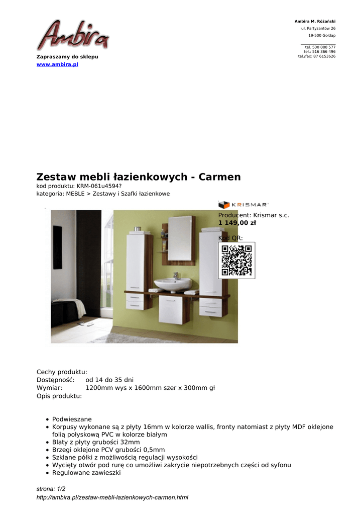 Ambira M. Różański ul. Partyzantów 26 19-500 Gołdap ___________________ tel. 500 088 577 tel.: 516 366 496 tel./fax: 87 6153626 Zapraszamy do sklepu www.ambira.pl Zestaw mebli łazienkowych - Carmen kod produktu: KRM-061u4594? kategoria: MEBLE > Zestawy i Szafki łazienkowe Producent: Krismar s.c. 1 149,00 zł Kod QR: Cechy produktu: Dostępność: od 14 do 35 dni Wymiar: 1200mm wys x 1600mm szer x 300mm gł Opis produktu: Podwieszane Korpusy wykonane są z płyty 16mm w kolorze wallis, fronty natomiast z płyty MDF oklejone folią połyskową PVC w kolorze białym Blaty z płyty grubości 32mm Brzegi oklejone PCV grubości 0,5mm Szklane półki z możliwością regulacji wysokości Wycięty otwór pod rurę co umożliwi zakrycie niepotrzebnych części od syfonu Regulowane zawieszki strona: 1/2 http://ambira.pl/zestaw-mebli-lazienkowych-carmen.html 2 x Szafki boczne SB: 1200mm wys x 400mm szer x 300mm gł Szafka dolna US: 460mm wys x 800mm szer x 300mm gł Szafka Wiszaca SL: 740mm wys x 600mm szer x 170mm gł Meble w paczkach do samodzielnego montażu strona: 2/2 http://ambira.pl/zestaw-mebli-lazienkowych-carmen.html