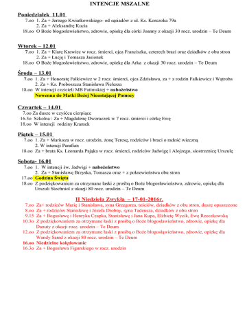 INTENCJE MSZALNE Poniedziałek 11.01 7.oo 1. Za + Jerzego Kwiatkowskiego- od sąsiadów z ul. Ks. Korczoka 79a 2. Za + Aleksandrę Kucia 18.oo O Boże błogosławieństwo, zdrowie, opiekę dla córki Joanny z okazji 30 rocz. urodzin – Te Deum Wtorek – 12.01 7.oo 1. Za + Klarę Krawiec w rocz. śmierci, ojca Franciszka, czterech braci oraz dziadków z obu stron 2. Za + Łucję i Tomasza Jasionek 18.oo O Boże błogosławieństwo, zdrowie, opiekę dla Arka z okazji 30 rocz. urodzin – Te Deum Środa – 13.01 7.oo 1. Za + Honoratę Falkiewicz w 2 rocz. śmierci, ojca Zdzisława, za + z rodzin Falkiewicz i Wątroba 2. Za + Ks. Proboszcza Stanisława Pielesza 18.oo W intencji czcicieli MB Fatimskiej + nabożeństwo Nowenna do Matki Bożej Nieustającej Pomocy Czwartek – 14.01 7.oo Za dusze w czyśćcu cierpiące 16.3o Szkolna : Za + Magdalenę Dworaczek w 7 rocz. śmierci i córkę Ewę 18.oo W intencji rodziny Kramek Piątek – 15.01 7.oo 1. Za + Mariusza w rocz. urodzin, żonę Teresę, rodziców i braci o radość wieczną 2. W intencji Parafian 18.oo Za + brata Ks. Leonarda Pająka w rocz. śmierci, rodziców Jadwigę i Alojzego, siostrzenicę Urszulę Sobota- 16.01 7.oo 1. W intencji św. Jadwigi + nabożeństwo 2. Za + Stanisławę Brzyska, Tomasza oraz + z pokrewieństwa obu stron 17.oo Godzina Święta 18.oo Z podziękowaniem za otrzymane łaski z prośbą o Boże błogosławieństwo, zdrowie, opiekę dla Urszuli Stochniol z okazji 80 rocz. urodzin – Te Deum II Niedziela Zwykła – 17-01-2016r. 7.oo 8.oo 9.15 10.3o Za+ rodziców Marię i Stanisława, syna Grzegorza, teściów, dziadków z obu stron, dusze opuszczone Za + rodziców Stanisławę i Józefa Drobny, syna Tadeusza, dziadków z obu stron Za + Bogusławę i Henryka Czapka, Stanisławę i Jana Kupa, Elżbietę Wycik, Ewę Rzeczkowską Z podziękowaniem za otrzymane łaski z prośbą o Boże błogosławieństwo, zdrowie, opiekę dla Danuty z okazji rocz. urodzin – Te Deum 12.oo Z podziękowaniem za otrzymane łaski z prośbą o Boże błogosłąwieństwo, zdrowie, opiekę dla Wandy Sarad z okazji 80 rocz. urodzin – Te Deum 16.oo Niedzielne kolędowanie 16.3o Za + Bogusława Figurskiego w rocz. urodzin