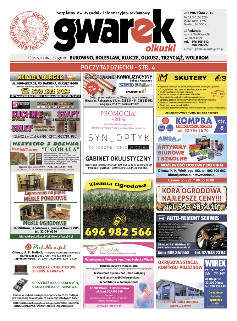 3 WRZEŚNIA 2015 Nr 19/2015 (228) ISSN: 1896-1797 Nakład: 16 000 szt. Redakcja: ul. K. K. Wielkiego 29, 32-300 Olkusz tel. 698 805 242 608 696 097 e-mail: [email protected] Obszar miast i gmin: Bukowno, Bolesław, Klucze, Olkusz, Trzyciąż, Wolbrom POCZYTAJ DZIECKU - str. 4 KEBAB & BURGER Al. 1000-lecia 2B, Os. Pakuska, Olkusz 32-300 (pawilon handlowy naprzeciwko sklepu Delikatesy Centrum) 573 232 992 PRZY ZAMÓWIENIU POWYŻEJ 20ZŁ • DOJAZD NA TERENIE OLKUSZA GRATIS!!! www.system-olkusz.pl OLKUSZ, ul. Sławkowska 22 KUCHNIE NA WYMIAR SKLEP SZAFY Z DRZWIAMI SUWANYMI WSZYSTKO DO MEBLI czynne 9.00 - 17.00 SKLEP WODNO-KANALIZACYJNY Łukasz Knapczyk montaż 8% VAT Sklep przeniesiony do Olkusza, nowy adres: Olkusz, ul. Rabsztyńska 51, tel. 788 524 414, 728 820 552 Pon-piątek 900-1700, sobota 800-1300 OPTYK SKUTERY • Naprawa chińskich skuterów, motorowerów, motocykli i quadów • Przeglądy i naprawy gwarancyjne i pogwarancyjne CZYNNE • Skutery zastępcze na czas naprawy PON. – SOB. • Możliwość transportu skutera do SERWISU 800 – 2200 • Skup skuterów uszkodzonych i powypadkowych • Sprzedaż części nowych i używanych do chińskich skuterów • Sprzedaż części używanych do WSK125 i ROMET • Skutery używane już od 1000 zł • Możliwość zostawienia starego lub uszkodzonego skutera w rozliczeniu JERZMANOWICE 128B, Tel. 513 410 697 KOMPRA BIURO RACHUNKOWE tel. 32 754 56 70 str. 8 tel./fax 32 641 32 00 • kom. 502 261 586 WSZYSTKO Z DREWNA "U GÓRALA" U NAS NA JTANIEJ!!!! Producent wyrobów z drewna oferuje: • Boazerię świerkową: szer. 7 cm, 9 cm lub 15 cm • Podbitkę pod dachy • Bardzo duży asortyment listew wykończeniowych z lipy, świerka, buka, dębu i jesionu. Deski podłogowe, schody, poręcze, tralki, sztachety, więźby dachowe, meble oraz drzwi. Czynne: pon - piątek 9.00 - 17.15, sobota 9.00-13.00 MOŻLIWOŚĆ DOWOZU WŁASNYM TRANSPORTEM GABINET OKULISTYCZNY rejestracja telefoniczna 500-200-941 ul. K. K. Wielkiego 60 (“SILVER” BUDYNEK DAWNEJ POLICJI PRZY POCZCIE) ARTYKUŁY BIUROWE I SZKOLNE MOŻLIWOŚĆ DOSTAWY DO FIRM Olkusz, K. K. Wielkiego 102, tel. 503 505 662 [email protected] • www.abisa.pl Czynne pn. - pt. 7:00 do 16:00 KORA OGRODOWA NAJLEPSZE CENY!!! tel. 793 407 210 Zapraszamy na piętro MEBLE POKOJOWE MEBLE OGRODOWE 32-300 Olkusz, ul. Składowa 2, (budynek Dworca PKP) tel. (32) 754 60 10 [email protected], drzwi.olkusz24.pl Olkusz, ul. Fr. Nullo 2, (obok Apteki - dawna siedziba Getin Bank) tel./fax (32) 211 03 27, tel. +48 519 409 079 Zapraszamy: pon. - pt. 9.00 - 18.00, sob. 9.00 - 13.00 SPRZEDAŻ KOMPUTERÓW, SERWIS, NAPRAWA Fizjoterapeuta kliniczny mgr. Anna Małecka-Włoch Rehabilitacja w schorzeniach: neurologicznych, ortopedycznych, ginekologicznych, onkologicznych. OKRĘGOWA STACJA KONTROLI POJAZDÓW Plastrowanie dynamiczne - Kinesiotaping Masaż leczniczy (bóle kręgosłupa) SPRZEDAŻ KAS FISKALNYCH, STAŁA OPIEKA SERWISOWA Pomoc w wyborze urządzeń odpowiednich do rodzaju prowadzonej działalności to daj niżej tych dwóch haseł TUSZE I TONERY do każdego urządzenia drukującego • NOTEBOOKI • KOMPUTERY • APARATY FOTOGRAFICZNE • MONITORY • DRUKARKI • OPROGRAMOWANIE 32-300 Olkusz, ul Sławkowska 4 tel. kom. 505 503 249 www.an-medic.pl Pn - Pt 700 - 2000 Sob 700 - 1400 ul. Długa 1D 32-300 Olkusz tel. 508 133 255 Rehabilitacja w domu pacjenta Czynne: poniedziałek i środa od 1500 do 2000 (zapisy telefonicznie) WiREX FACHOWA I MIŁA OBSŁUGA ZAPRASZAMY!!! Do każdego badania upominek gratis 2 Informacje PORADY PRAWNE ul. Minkiewicza 2, email: [email protected], www: www.pup-olkusz.pl tel. 32 643-05-38, 32 641-34-02; fax 32 643-43-48; NIP 637-10-45-891 Zatrudnianie cudzoziemców uproszczona procedura dla obywateli Białorusi, Gruzji, Mołdowy, Rosji i Ukrainy NA CZYM POLEGA PROCEDURA UPROSZCZONA? Podmiot (pracodawca, osoba fizyczna) zamierzający powierzyć wykonywanie pracy cudzoziemcowi rejestruje odpowiednie oświadczenie w powiatowym urzędzie pracy właściwym ze względu na miejsce pobytu stałego lub siedzibę podmiotu powierzającego wykonywania pracy; Podmiot przekazuje oryginał oświadczenia cudzoziemcowi; Oświadczenie może być podstawą do wydania cudzoziemcowi przez właściwego polskiego konsula wizy w celu wykonywania pracy: Posiadane oświadczenia oraz tytułu pobytowego uprawniającego do podejmowania pracy umożliwia podjęcie pracy krótkoterminowej na terytorium RP. Pracę taką można wykonywać po zawarciu pisemnej umowy z pracodawcą (rodzaj umowy wiąże się z odmiennym zakresem praw i obowiązków podmiotu zatrudniającego i osoby wykonującej pracę). • • • • WAŻNE! Cudzoziemiec może pracować w Polsce przez okres do 6 miesięcy w ciągu kolejnych 12 miesięcy; Dopuszczalne jest wykonywanie pracy wyłącznie na rzecz podmiotu, który zarejestrował oświadczenie. W przypadku zmiany pracodawcy niezbędne jest zarejestrowanie oświadczenia przez nowego pracodawcę; Oświadczenie jest rejestrowane bezpłatnie; W przypadku wątpliwości dotyczących możliwości zatrudnienia przez podmiot rejestrujący oświadczenie, wskazanej przez niego liczby pracowników bądź jakichkolwiek innych wątpliwości sugerujących możliwość wystąpienia nadużyć, urząd pracy może powiadomić organy konsularne i kontrolne – Straż Graniczną, Państwową Inspekcję Pracy, Policję; PODSTAWA PRAWNA Rozporządzenie Ministra Pracy i Polityki Społecznej z dnia 21 kwietnia 2015 r. w sprawie przypadków, w których powierzenie wykonywania pracy cudzoziemcowi na terytorium Rzeczypospolitej Polskiej jest dopuszczalne bez konieczności uzyskania zezwolenia na pracę (Dz. U. z 2015 r., poz. 588); Jeśli podmiot powierzający pracę jest zainteresowany tym, by cudzoziemiec pracował u niego przez okres dłuższy, niż pozwala oświadczenie, może po 3 miesiącach wykonywania przez niego pracy na podstawie oświadczenia złożyć wniosek do wojewody o wydanie mu zezwolenia na pracę (n