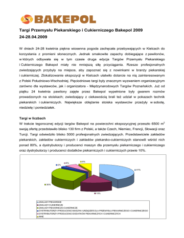 Targi Przemysłu Piekarskiego i Cukierniczego Bakepol 2009 24-28.04.2009 W dniach 24-28 kwietnia piękna wiosenna pogoda zachęcała przebywających w Kielcach do korzystania z promieni słonecznych. Jednak smakowite zapachy dobiegające z pawilonów, w których odbywała się w tym czasie druga edycja Targów Przemysłu Piekarskiego i Cukierniczego Bakepol miały nie mniejszą siłę przyciągania. Rzesze profesjonalnych zwiedzających przybyły na miejsce, aby zapoznać się z nowinkami w branŜy piekarskiej i cukierniczej. Zlokalizowanie ekspozycji w Kielcach ułatwiło dotarcie na nią zainteresowanym z Polski Południowo-Wschodniej. Pięciodniowe targi były znacznym wyzwaniem organizacyjnym zarówno dla wystawców, jak i organizatora - Międzynarodowych Targów Poznańskich. JuŜ od piątku 24 kwietnia pawilony zajęte przez Bakepol wypełnione były gwarem rozmów prowadzonych na stoiskach; zwiedzający z ciekawością brali teŜ udział w pokazach technik piekarskich i cukierniczych. Największe oblęŜenie stoiska wystawców przeŜyły w sobotę, niedzielę i poniedziałek. Targi w liczbach W trakcie tegorocznej edycji targów Bakepol na powierzchni ekspozycyjnej przeszło 6500 m2 swoją ofertę przedstawiło blisko 130 firm z Polski, a takŜe Czech, Niemiec, Francji, Słowacji oraz Turcji. Targi odwiedziło blisko 5000 profesjonalnych zwiedzających. Przedstawiciele zakładów piekarskich, zakładów cukierniczych i zakładów piekarsko-cukierniczych stanowili wśród nich ponad 80%, a dystrybutorzy i producenci maszyn dla przemysłu piekarniczego i cukierniczego oraz dystrybutorzy i producenci dodatków piekarniczych i cukierniczych prawie 10%. 6% 6% 2% 41% 30% 15% ZAKŁADY PIEKARSKIE ZAKŁADY CUKIERNICZE ZAKŁADY PIEKARNICZO-CUKIERNICZE DYSTRYBUTORZY I PRODUCENCI MASZYN I URZĄDZEŃ DLA PRZEMYSŁU PIEKARNICZEGO I CUKIERNICZEGO DYSTRYBUTORZY I PRODUCENCI DODATKÓW PIEKARNICZYCH I CUKIERNICZYCH INNE Pokazy, prezentacje, dyskusje Na terenie ekspozycji wystawcy prezentowali całe linie produkcyjne: od wyrabiania ciasta, formowania, nadziewania i zdobienia, aŜ po wypiek gotowych wyrobów w profesjonalnych piecach. MoŜna było poznać między innymi zasady działania smaŜalników do pączków, sposoby wypieku wszelkiego rodzaju chlebów, bułek, chałek, a takŜe wypieku gofrów oraz ich dekoracji. Poza tym odbywały się pokazy nadziewania wyrobów cukierniczych oraz ich dekoracja pomadami i Ŝelami, produkcji lodów, deserów oraz ciast droŜdŜowych i francuskich. śaden zwiedzający nie wyszedł z targów głodny - na miejscu piekarze zachęcali do skosztowania i ocenienia efektów ich pracy. Zainteresowani mogli równieŜ obejrzeć profesjonalne krojenie tortów i ciast a takŜe zmywanie koszy i czyszczenie blach. Ponadto wystawcy chętnie dzielili się ciekawymi recepturami na tradycyjne ciasta polskie; pokazywali metody pakowania chleba, zapiekanek i pieczywa cukierniczego (babki, keksy, makowce). Ciekawym elementem była oferta stojaków do tortów weselnych oraz pełna gama surowców, form i przyrządów do dekorowania słodkich wypieków. Zwiedzający targi zatrzymywali się na dłuŜej na przestrzeni specjalnej Stowarzyszenia Rzemieślników Piekarstwa RP oraz Stowarzyszenia Cukierników, Karmelarzy i Lodziarzy RP. Rajskie ptaki, kwiaty do złudzenia przypominające te świeŜo zerwane w ogrodzie oraz misternie zawiązane kokardy to dekoracje tortów weselnych, które były przygotowywane na miejscu z karmelu i marcepanu z precyzją zapierającą dech w piersiach. Stowarzyszenie Piekarzy oprócz sprawdzonych rozwiązań piekarskich pokazało moŜliwości wykorzystania najnowszych technologii i udoskonalanych receptur oraz ich zastosowanie dla gastronomii. W poniedziałek, 27 kwietnia, sala konferencyjna, w której Międzynarodowe Targi Poznańskie, redakcja Przeglądu Piekarskiego i Cukierniczego oraz Stowarzyszenie Naukowo-Techniczne InŜynierów i Techników Przemysłu SpoŜywczego (SITSpoŜ) zorganizowały panel dyskusyjny wypełniona była po brzegi. Profesor Henryk Mruk z Uniwersytetu Ekonomicznego w Poznaniu w ciekawy sposób poprowadził spotkanie na temat: „Sposoby budowania pozycji piekarni w warunkach konkurencji rynkowej”. Następne spotkania piekarzy i cukierników Następne targowe spotkanie dla branŜy cukierniczej i piekarskiej odbędzie się we wrześniu 2010 w ramach Salonu Przemysłu Piekarskiego i Cukierniczego Międzynarodowych Targów Technologii SpoŜywczych Polagra-Tech w Poznaniu. Trzecia edycja targów Bakepol będzie miała miejsce w 2011 roku. www.bakepol.pl