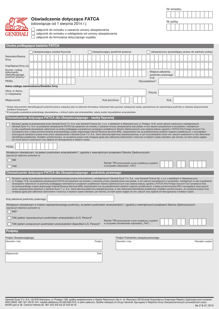 Nr wniosku Oświadczenie dotyczące FATCA Nr polisy (obowiązuje od 1 sierpnia 2014 r.) załącznik do wniosku o zawarcie umowy ubezpieczenia z ałącznik do wniosku o odstąpienie od umowy ubezpieczenia z ałącznik do formularza dotyczącego wypłaty Osoba podlegająca badaniu FATCA Ubezpieczający (osoba fizyczna) Ubezpieczający (podmiot prawny) Ubezpieczony (posiadający prawo do wartości polisy) Nazwisko/Nazwa firmy Imię/Nazwa firmy cd. Numer i rodzaj dokumentu identyfikującego podmiot prawny1) Miejsce założenia podmiotu prawnego (kraj) PESEL Obywatelstwo2) Adres stałego zamieszkania/Siedziba firmy Ulica, nr domu, nr mieszkania Poczta Kod pocztowy Miejscowość 1) 2) Kraj ykaz dokumentów identyfikujących podmiot prawny wskazany jest na odwrocie formularza. Dokument taki powinien wskazywać osoby upoważnione do reprezentacji podmiotu w zakresie dysponowania W środkami finasowymi. W przypadku posiadania podwójnego obywatelstwa, z których jedno jest amerykańskie, należy podać obywatelstwo amerykańskie. Oświadczenie dotyczące FATCA dla Ubezpieczającego - osoby fizycznej Wyrażam zgodę na przetwarzanie przez Generali Życie T.U. S.A. oraz Generali Finance Sp. z o.o. z siedzibami w Warszawie przy ul. Postępu 15 B, moich danych osobowych udostępnianych Generali Życie T.U. S.A. na podstawie oświadczenia FATCA lub zawartych we wniosku o zawarcie umowy ubezpieczenia oraz polisie, w tym danych pozyskanych w przyszłości, niezbędnych w celu wypełnienia obowiązków nałożonych na osoby podlegające wewnętrznym przepisom podatkowym Stanów Zjednoczonych oraz nadania statusu zgodnie z FATCA (The Foreign Account Tax Compliance Act), a także poinformowania amerykańskiego urzędu skarbowego Internal Revenue Services (IRS), bezpośrednio lub za pośrednictwem polskich organów podatkowych, o szczegółach dotyczących zawartych przeze mnie umów ubezpieczenia z Generali Życie T.U. S.A., które stanowią tajemnicę ubezpieczeniową, w tym na przekazanie moich ww. danych osobowych w celu dokonania identyfikacji podatkowej. Zostałem poinformowany, że wyrażenie przeze mnie niniejszej zgody jest całkowicie dobrowolne i może być w każdym czasie odwołane, jak również, że mam prawo wglądu do moich danych osobowych oraz żądania ich skorygowania w każdym czasie. PESEL Niniejszym oświadczam, że jestem podmiotem amerykańskim1), zgodnie z wewnętrznymi przepisami Stanów Zjednoczonych: (zaznaczyć właściwe symbolem x) NIE Numer TIN (amerykański numer podatkowy wypełnić w przypadku odpowiedzi „TAK”) TAK Oświadczenie dotyczące FATCA dla Ubezpieczającego - podmiotu prawnego Wyrażam zgodę na przekazanie danych reprezentowanego przeze mnie podmiotu, udostępnianych Generali Życie T.U. S.A. oraz Generali Finance Sp. z o.o. z siedzibami w Warszawie przy ul. Postępu 15 B, na podstawie oświadczenia FATCA lub zawartych we wniosku o zawarcie umowy ubezpieczenia oraz polisie, w tym danych pozyskanych w przyszłości, niezbędnych w celu wypełnienia obowiązków nałożonych na podmioty podlegające wewnętrznym przepisom podatkowym Stanów Zjednoczonych oraz nadania statusu zgodnie z FATCA (The Foreign Account Tax Compliance Act), do amerykańskiego urzędu skarbowego Internal Revenue Services (IRS), bezpośrednio lub za pośrednictwem polskich organów podatkowych, a także poinformowania IRS o szczegółach dotyczących umów ubezpieczenia zawartych z Generali Życie T. U. S.A., które stanowią tajemnicę ubezpieczeniową, w celu dokonania identyfikacji podatkowej. Zostałem poinformowany, że wyrażenie przeze mnie niniejszej zgody jest całkowicie dobrowolne i może być w każdym czasie odwołane, jak również, że mam prawo wglądu do ww. danych oraz żądania ich skorygowania w każdym czasie. Kraj założenia podmiotu prawnego Niniejszym oświadczam w imieniu reprezentowanego podmiotu, że jestem podmiotem amerykańskim1), zgodnie z wewnętrznymi przepisami Stanów Zjednoczonych: (zaznaczyć właściwe symbolem x) NIE2) TAK jestem nieoznaczonym podmiotem amerykańskim (U.S. Person)3) TAK jestem oznaczonym podmiotem amerykańskim (Specified U.S. Person)4) Numer TIN (amerykański numer podatkowy wypełnić w przypadku którejkolwiek odpowiedzi „TAK”) Podpisy Podpis Ubezpieczającego Nazwisko i imię Miejscowość Podpis Pośrednika ubezpieczeniowego Podpis Nazwisko i imię Pieczątka i podpis Dnia Generali Życie T.U. S.A., 02-676 Warszawa, ul. Postępu 15B, spółka zarejestrowana w Sądzie Rejonowym dla m. st. Warszawy XIII Wydział Gospodarczy Krajowego Rejestru Sądowego pod numerem KRS 25952. NIP: 521-28-87-341, kapitał zakładowy 63.500.000 PLN, w pełni opłacony. Spółka należąca do Grupy Generali, figurującej w Rejestrze Grup Ubezpieczeniowych prowadzonym przez ISVAP pod nr 26. Centrum Klienta tel.: 801 343 343 lub 22 543 05 43 8e-218-01.2015 Informacje dodatkowe 1. Niniejsze oświadczenie składane jest w celu wypełnienia obowiązków nałożonych na osoby podlegające wewnętrznym przepisom podatkowym w Stanach Zjednoczonych - FATCA (Foreign Account Tax Compliance Act). 2. Generali Życie Towarzystwo Ubezpieczeń Spółka Akcyjna z siedzibą w Warszawie przy ul. Postępu 15B, 02-676 Warszawa ma prawo zweryfikować prawdziwość danych zawartych w oświadczeniu i w razie podejrzenia, iż dane złożone w oświadczeniu są nieprawdziwe, może żądać przedłożenia przez Klienta dodatkowych dokumentów w celu potwierdzenia tych danych. 3. W razie zmiany danych objętych oświadczeniem Klient zobowiązany jest do powiadomienia Generali Życie T.U. S.A. o takiej zmianie w ciągu 30 dni roboczych. 4. Składanie fałszywych oświadczeń może podlegać odpowiedzialności karnej na mocy właściwych przepisów prawa. Podmiotem amerykańskim jest podmiot prawny, który ma siedzibę lub miejsce założenia w Stanach Zjednoczonych lub osoba fizyczna, która ma miejsce zamieszkania w Stanach Zjednoczonych, posiada obywatelstwo amerykańsk