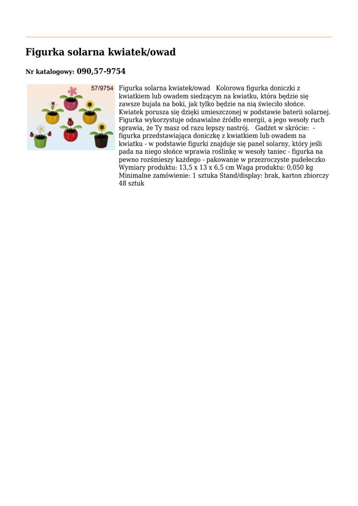 Figurka solarna kwiatek/owad Nr katalogowy: 090,57-9754 Figurka solarna kwiatek/owad Kolorowa figurka doniczki z kwiatkiem lub owadem siedzącym na kwiatku, która będzie się zawsze bujała na boki, jak tylko będzie na nią świeciło słońce. Kwiatek porusza się dzięki umieszczonej w podstawie baterii solarnej. Figurka wykorzystuje odnawialne źródło energii, a jego wesoły ruch sprawia, że Ty masz od razu lepszy nastrój. Gadżet w skrócie: figurka przedstawiająca doniczkę z kwiatkiem lub owadem na kwiatku - w podstawie figurki znajduje się panel solarny, który jeśli pada na niego słońce wprawia roślinkę w wesoły taniec - figurka na pewno rozśmieszy każdego - pakowanie w przezroczyste pudełeczko Wymiary produktu: 13,5 x 13 x 6,5 cm Waga produktu: 0,050 kg Minimalne zamówienie: 1 sztuka Stand/display: brak, karton zbiorczy 48 sztuk