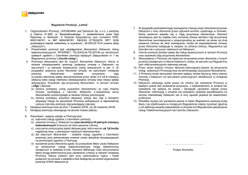 Regulamin Promocji ,,Letnia” 7. Organizatorem Promocji ,,WIOSENNA” jest Debacom Sp. z o.o. z siedzibą w Zabrzu 41-800, ul. Niedziałkowskiego 1, zarejestrowana przez Sąd Rejonowy w Gliwicach, X Wydział Gospodarczy pod numerem KRS: 0000146747, nr NIP 6482450761, REGON 277933079, RPT 3239 posiadająca kapitał zakładowy w wysokości 50.000,00 PLN (zwana dalej ,,Debacom”). 2. Przedmiotem promocji jest udostępnienie Abonentom Debacom Usług telekomunikacyjnych: INTERNET; TELEWIZJA;TELEFON po obniżonych opłatach zgodnie z Cennikiem promocji będącym Załącznikiem nr 1 do Regulaminu promocji („Cennik usług”). 3. Promocja skierowana jest do nowych Abonentów Debacom, którzy w okresie obowiązywania promocji podpiszą umowę z Debacom na warunkach i w zakresie świadczenia Usług wskazanych w pkt. 2. W przypadku zawarcia przez Abonenta Umowy na warunkach niniejszej promocji Abonentowi zostanie przyznana ulga w postaci obniżonej opłaty abonamentowej przez okres 2;4 lub 6 miesięcy (dotyczy tylko usługi internetu) obowiązywania Umowy oraz niższa opłata aktywacyjna, Wysokość ulgi przyznanej Abonentowi w ramach Umowy („Ulga”) stanowi: a) różnica pomiędzy sumą wysokości Abonamentu za czas trwania Umowy wynikającą z Cennika Debacom a wysokością sumy Abonamentu promocyjnego w okresie Umowy promocyjnej . b) różnica pomiędzy kosztami aktywacji Usługi bez ulgi a kosztami aktywacji Usługi na warunkach Promocji wskazanych w odpowiedniej rubryce Cennika promocji odpowiadającej Usłudze. 4. Niniejsza promocja trwa od dnia 1 Kwietnia 2016r. do 20 września 2016r. 5. Niniejsza promocja obowiązuje na terenie miasta Zabrze. 1. 6. Warunkiem wzięcia udziału w Promocji jest : a) wybranie Usługi zgodnie z Cennikiem promocji, b) zawarcie Umowy z Debacom na czas określony 24 pełnych miesięcy kalendarzowych liczonych od dnia zawarcia Umowy c) uiszczenie promocyjnej opłaty aktywacyjnej, która wynosi od 1zł brutto najpóźniej wraz z pierwszym należnym Abonamentem d) dla obecnych Abonentów - dodanie Usługi (zgodnie z Cennikiem promocji) przy jednoczesnej zmianie umów aktualnie obowiązujących na promocyjne zgodnie z Promocją. d) wyrażenie przez Abonenta zgody na przesyłanie faktur przez Debacom za świadczone Usługi telekomunikacyjne drogą elektroniczną dostępnych w zakładce e-bok. Abonent deklarując chęć otrzymywania faktur drogą elektroniczną przy zawieraniu Umowy w ramach niniejszej Promocji, faktury pobiera sam przy zastosowaniu loginu i hasła podanych na umowie z zakładki e-bok dostępnej na stronie organizatora promocji WWW.debacom.pl. 8. 9. 10. 11. 12. 13. W przypadku jednostronnego rozwiązania Umowy przez Abonenta lub przez Debacom z winy Abonenta przed upływem terminu ustalonego w Umowie, której zawarcie wiązało się z Ulgą przyznaną Abonentowi, Abonent obowiązany jest do zapłaty kary umownej równej wartości Ulgi przyznanej Abonentowi pomniejszonej o proporcjonalną jej wartość za okres od dnia zawarcia Umowy do dnia rozwiązania, chyba że wypowiedzenie Umowy przez Abonenta następuje w związku ze zmianą Umowy, Regulaminu lub Cennika lub z przyczyn zależnych od Debacom. Cennik promocji określa opłaty dla Usług świadczonych w ramach Promocji oraz wysokość Ulgi przyznanej Abonentowi. Skorzystanie z Promocji nie wyklucza korzystania przez Abonenta z innych promocji dostępnych w ofercie Debacom, chyba, że warunki czy Regulaminy tych ofert promocyjnych stanowią inaczej. Przez okres trwania Umowy Abonent zobowiązany będzie do utrzymania Usług wybranych Promocją oraz do terminowego uiszczania Abonamentu. Z Promocji może skorzystać Abonent będący osobą fizyczną, który zawrze Umowę z Debacom na warunkach promocyjnych określonych w niniejszej Promocji. Debacom zastrzega sobie prawo do zmiany lub odwołania Promocji w każdym czasie bez podawania przyczyny, z zastrzeżeniem, iż zmiana lub odwołanie nie wpływa na prawa i obowiązki uprzednio nabyte przez Abonenta. Informacja o zmianie lub odwołaniu zostanie opublikowana na stronie internetowej Debacom lub w inny sposób podana do wiadomości publicznej. Wszelkie wyrazy lub wyrażenia pisane w treści Regulaminu promocji dużą literą i nie zdefiniowane w niniejszym Regulaminie należy rozumieć zgodnie z ich definicją zawartą odpowiednio w Umowie lub Regulaminie świadczenia Usług Telekomunikacyjnych lub Cenniku Debacom. ………………………………......... Podpis Abonenta Załącznik nr 1 do Regulaminu Promocji „Letnia” Cennik Promocji „Letnia” l.p. Pakiet Internetowy Czas trwania Umowy 24 miesiące Abonament bez ulgi Abonament z ulgą* Koszt Aktywacji bez ulgi Aktywacja z ulgą Suma Ulgi promocyjnej Rata za aktywacje po przyznanej uldze Ulga promocyjna za jeden miesiąc trwania umowy 1. 2. 3. *ulga określona warunkami promocji przyznana częściowo na okres 2, 4 lub 6 miesięcy .................................................. Podpis Abonenta