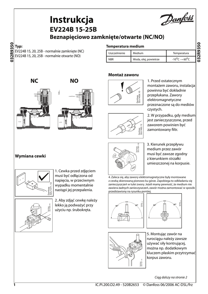 Instrukcja EV224B 15-25B Typ: EV224B 15, 20, 25B - normalnie zamknięte (NC) EV224B 15, 20, 25B - normalnie otwarte (NO) Temperatura medium Uszczelnienie Medium Temperatura NBR Woda, olej, powietrze -10oC → 60oC Montaż zaworu NC NO 1. Przed ostatecznym montażem zaworu, instalacja powinna być dokładnie przepłukana. Zawory elektromagnetyczne przeznaczone są do mediów czystych. 2. W przypadku, gdy medium jest zanieczyszczone, przed zaworem powinien być zamontowany filtr. 3. Kierunek przepływu medium przez zawór musi być zawsze zgodny z kierunkiem strzałki umieszczonej na korpusie. Wymiana cewki 1. Cewka przed zdjęciem musi być odłączona od napięcia, w przeciwnym wypadku momentalnie nastąpi jej przepalenia. 4. Zaleca się, aby zawory elektromagnetyczne były montowane z cewką skierowaną pionowo ku górze. Zapobiega to odkładaniu się zanieczyszczeń w tulei zwory. Jeżeli mamy pewność, że medium nie zawiera żadnych zanieczyszczeń, zawór można zamontować w sposób przedstawiony na rysunku poniżej. 2. Aby zdjąć cewkę należy lekko ją podważyć przy użyciu np. śrubokręta. 5. Montując zawór na rurociągu należy zawsze używać siły kontrującej, można np. dodatkowym kluczem płaskim przytrzymać korpus zaworu. Ciąg dalszy na stronie 2 1 IC.PI.200.D2.49 - 520B2653 © Danfoss 06/2006 AC-DSL/frz 032R9350 032R9350 Beznapięciowo zamknięte/otwarte (NC/NO) 6. Po obu stronach zaworu Zestaw części zamiennych rury przyłączeniowe powinny Zawory normalnie zamknięte (NC) być sztywno umocowane do elementów stałych. Zestaw zwiera: Warning Ciś. testowe MAKS. 64 bar O-ring umieszczony pod cewką, Zworę z płytką zwory, O-ringi dla tulei zwory, Sprężynę, Membranę, Dwa o-ringi dla układu pilotowego, O-ring i uszczlkę dla układu wyrównawczego 7.Maksymalne ciśnienie testowe wynosi 64 bary. Montaż cewki Uwaga: Nigdy nie podłączaj cewki do prądu, gdy nie jest zamontowana na zaworze. Może ulec przepaleniu oraz występuje ryzyko pożaru. 2. Przyklej etykietę zaworu na cewce oraz nałóż drugą etykietę na tuleję cewki. Typ Uszczelnienie Numer kat. EV224B 15B NBR 032U6156 EV224B 20B NBR 032U6158 EV224B 25B NBR 032U6160 Zestaw części zamiennych Zawory normalnie otwarte (NO) Zestaw zwiera: O-ring umieszczony pod cewką, Tuleję zwory ze zmontowaną płytką, O-ringi dla tulei zwory, Sprężynę, Membranę, Dwa o-ringi dla układu pilotowego, O-ring i uszczlkę dla układu wyrównawczego 3. Załóż O-ring. 4. Załóż cewkę na tuleję. Gdy usłyszysz charakterystyczne kliknięcie, będzie to oznaczało, że cewka jest zamontowana poprawnie. Typ Uszczelnienie Numer kat. EV224B 15B NBR 032U6157 EV224B 20B NBR 032U6159 EV224B 25B NBR 032U6161 Pin 0.5 mm Otwór wyrównawczy Bezpieczne ciśnienie robocze Typ EV220B 15, 20, 25B (NC/NO) 2 Ciśnienie 40 bar IC.PI.200.D2.49 - 520B2653 © Danfoss 06/2006 AC-DSL/frz