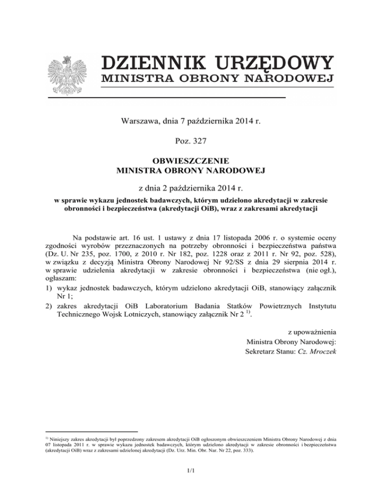 Warszawa, dnia 7 października 2014 r. Poz. 327 OBWIESZCZENIE MINISTRA OBRONY NARODOWEJ z dnia 2 października 2014 r. w sprawie wykazu jednostek badawczych, którym udzielono akredytacji w zakresie obronności i bezpieczeństwa (akredytacji OiB), wraz z zakresami akredytacji Na podstawie art. 16 ust. 1 ustawy z dnia 17 listopada 2006 r. o systemie oceny zgodności wyrobów przeznaczonych na potrzeby obronności i bezpieczeństwa państwa (Dz. U. Nr 235, poz. 1700, z 2010 r. Nr 182, poz. 1228 oraz z 2011 r. Nr 92, poz. 528), w związku z decyzją Ministra Obrony Narodowej Nr 92/SS z dnia 29 sierpnia 2014 r. w sprawie udzielenia akredytacji w zakresie obronności i bezpieczeństwa (nie ogł.), ogłaszam: 1) wykaz jednostek badawczych, którym udzielono akredytacji OiB, stanowiący załącznik Nr 1; 2) zakres akredytacji OiB Laboratorium Badania Statków Powietrznych Instytutu Technicznego Wojsk Lotniczych, stanowiący załącznik Nr 2 1). z upoważnienia Ministra Obrony Narodowej: Sekretarz Stanu: Cz. Mroczek 1) Niniejszy zakres akredytacji był poprzedzony zakresem akredytacji OiB ogłoszonym obwieszczeniem Ministra Obrony Narodowej z dnia 07 listopada 2011 r. w sprawie wykazu jednostek badawczych, którym udzielono akredytacji w zakresie obronności i bezpieczeństwa (akredytacji OiB) wraz z zakresami udzielonej akredytacji (Dz. Urz. Min. Obr. Nar. Nr 22, poz. 333). 1/1 Załączniki do obwieszczenia Ministra Obrony Narodowej z dnia 2 października 2014 r. (poz. 327) Załącznik Nr 1 WYKAZ jednostek badawczych, którym udzielono akredytacji OiB Lp. 1. Nazwa jednostki badawczej Laboratorium Badania Statków Powietrznych Instytutu Technicznego Wojsk Lotniczych 1/1 Zakres udzielonej akredytacji OiB Określa załącznik Nr 2 Załącznik Nr 2 ZAKRES AKREDYTACJI OiB Nr 24/MON/2014 Wydanie 1 LABORATORIUM BADANIA STATKÓW POWIETRZNYCH INSTYTUTU TECHNICZNEGO WOJSK LOTNICZYCH 01-494 Warszawa, ul. Księcia Bolesława 6 Grupa Nazwa wyrobu lub wyrobów* grupy wyrobów Badane charakterystyki wyrobu i metody badawcze Urządzenia optyczne zabudowane na statku powietrznym. Badanie dokumentacji technicznej systemu zobrazowania parametrów lotu na: − zgodność z NO-06-A105: 2005; − kompletność w zakresie określonym w WZTT. Grupa 10 Dokumenty normatywne i/lub udokumentowane procedury badawcze Metodyka badawcza nr MB-4/N/LBSP/11 „Badanie dokumentacji technicznej systemu zobrazowania parametrów lotu.” Badanie kompletności systemu Metodyka badawcza nr MB-5/N/LBSP/11 zobrazowania parametrów lotu. „Badanie ukompletowania systemu zobrazowania parametrów lotu.” Badanie jakości wyświetlania Metodyka badawcza nr MB-6/N/LBSP/11 informacji przez system „Badanie zakresu prezentacji informacji zobrazowania parametrów lotu. systemu zobrazowania parametrów lotu.” Metodyka badawcza nr MB-13/L/LBSP/11 „Badanie jakości prezentowania informacji przez system zobrazowania parametrów lotu statku powietrznego.” Badanie ilości danych Metodyka badawcza nr MB-7/N/LBSP/11 prezentowanych przez system „Badanie zakresu prezentowanych danych zobrazowania parametrów lotu. w systemie zobrazowania parametrów lotu.” Metodyka badawcza nr MB-14/L/LBSP/11 „Badanie ilości prezentowanych informacji przez system zobrazowania parametrów lotu statku powietrznego.” Badanie: − sterowalności systemem zobrazowania parametrów lotu; − ergonomii systemu zobrazowania parametrów lotu. 1/2 Metodyka badawcza nr MB-8/N/LBSP/11 „Badanie zakresu sterowalności systemem zobrazowania parametrów lotu.” Metodyka badawcza nr MB-15/L/LBSP/11 „Badanie ergonomii sterowania systemem zobrazowania parametrów lotu statku powietrznego.” Zakres akredytacji OiB LBSP ITWL Grupa Nazwa wyrobu lub wyrobów* grupy wyrobów Badane charakterystyki wyrobu i metody badawcze Dokumenty normatywne i/lub udokumentowane procedury badawcze Badanie bezpieczeństwa zabudowy elementów systemu na wyposażeniu indywidualnym pilota. Metodyka badawcza nr MB-9/N/LBSP/11 „Badanie zabudowy elementów systemu zobrazowania parametrów lotu na hełmie pilota.” Badanie kompatybilności sytemu zobrazowania parametrów lotu z innymi systemami zabudowanymi na statku powietrznym. Metodyka badawcza nr MB-10/N/LBSP/11 „Badanie w zakresie współpracy systemu zobrazowania parametrów lotu z systemami pokładowymi.” Metodyka badawcza nr MB-16/L/LBSP/11 „Badanie wpływu pracy systemu zobrazowania parametrów lotu statku powietrznego na pracę innych systemów.” Badanie poprawności zastosowanych rozwiązań konstrukcyjnych w systemie zobrazowania parametrów lotu. Metodyka badawcza nr MB-11/N/LBSP/11 „Badanie w zakresie wymagań konstrukcyjnych dla systemu zobrazowania parametrów lotu.” Badanie bezpieczeństwa użytkowania statku powietrznego z zabudowanym systemem zobrazowania lotu. Metodyka badawcza nr MB-12/L/LBSP/11 „Badanie wpływu systemu zobrazowania parametrów lotu oraz jego pracy na bezpieczeństwo użytkowania statku powietrznego.” Uwaga: * - grupy wyrobów zgodnie z art. 6 ustawy z dnia 17 listopada 2006 r. o systemie oceny zgodności wyrobów przeznaczonych na potrzeby obronności i bezpieczeństwa państwa (Dz. U. Nr 235, poz. 1700, z późn. zm.). 2/2