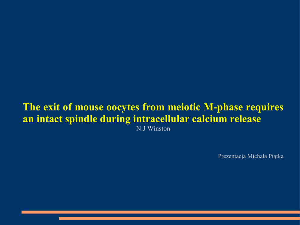 The exit of mouse oocytes from meiotic M-phase requires an intact spindle during intracellular calcium release N.J Winston Prezentacja Michała Piątka Wprowadzenie ● ● ● ● Dojrzałe owulwoane oocyty są w bloku metafazy II podziału Oocyty wychodzą z bloku gdy zostaną aktywowane przez zapłodnienie lub partenogenetycznie co wyzwala szereg przejściowych zmian stężenia jonów wapnia wewnątrz komórki Inhibitor wrzecion NOCODAZOL powoduje depolaryzacje mikrotubul.---> degeneracja wrzeciona Cyklina B i enzym ją rozkładający znajdują się na wrzecionie Wpływ nocodazolu na wrzeciona barwienie immunocytochemiczne (na zielono tubuliny na czerwono chromosomy) ● Widok z boku kontrolna ● po 1min w nocodazolu po 3 min w nocodazolu po 6min w nocodazolu po 3 min w nocodazolu po 6min w nocodazolu Widok z góry kontrolna po 1min w nocodazolu CEL: ● ● Zbadać czy wyjście oocyty z M fazy wymaga niezniszczonego wrzeciona Zbadać czy wyrzuty jonów wapniowych wewnątrz komórki wpływają na wyjście oocytu z M fazy Materiały i metody użyte w dośwaidczeniach ● ● 6-10 tygodniowym samicą podano 5ul surowicy gonadotropowej ciężarnej klaczy(PMSG) i ludzka gonadotropinę kosmówkową(hCG) 48 godzin przed śmiercią Oocyt uzyskano z cummulusów przez nakłucie bańki jajowodu w 13 godzinie po podaniu hCG Oocyty użyte do aktywacji alkoholem ● ● ● Cummulus z pecherzyka jajowodu został przepłukany z komórek folikularnych i usunięto osłonki przejrzyste Hodowla przez 4-5 godzin w kropli pożywki M2+BSA pod kropla parafiny w 37stC Po 18 godzinach od padania hCG część oocytów poddana została aktywacja etanolem ● BEZ obecności NOCODAZOLU ● W obecności NOCODAZALU pozostałe oocyty podzielono na 3 grupy które były trzymane w pożywce z NOCODAZOLEM na ● 15min przed aktywacja etanolem w obecności NOCODAZOLU ● 30 min przed aktywacja etanolem w obecności NOCODAZOLU ● 60 min przed aktywacja etanolem w obecności NOCODAZOLU następnie oocyty przemyto z etanolu i umieszczono hodowli w pożywce M2+BSA inkubujac 6 godzin Oocyty użyte do aktywacji przez zapłodnienie in vitro ● ● ● ● Pochodziły z cummulusów z jajowodów tych samych myszy co oocyty użyte do aktywacji etanolem Były oczyszczone lub bez osłonki przejrzystej Inkubowano je przez godzinę W 13,5 godzinie po podaniu hCG oocyty były zapładniane w kroplach pożywki zawierającej płodowa surowicę cielęcą FCS w obecności albo braku obecności nocodazolu Zapłodnione w obecności NOCODAZOLU zapłodnione bez obecności NOCODAZOLU 3razy przemyte poż. z Ca2+ + BAPTAAM (iii) poż. z Ca2+ bez BAPTAM (ii) po 3h do M2+BSA +1.78nM Ca2+ (i) Oocyty użyte do aktywacji przez zapłodnienie in vitro c.d. ● ● ● ● ● Pozostałą część oocytów zapładnianych w obecności NOCODOZOLU umieszczono w pożywkach M2-BSA bez Ca2+ ale z nocodazolem. Po 30 minutach osunięto inhibitor i polowe umieszczono w pożywce bez Ca2+ a druga połowę w pożywce zawierającej jony wapnia. W ten sposób otrzymano 5 grup komórek badanych (i)Kontrolna (ii)Akt. z nocodazolem bez BAPTAM (iii)Akt. z nocodazolem i z BAPTAM (iv)Akt. z nocodazolem potem w poż. bez Ca2+ i bez inhibitora (v)Akt z nocodazolem potem w pozwyce bez Ca2+ i bez inhibiotra a potem do poż. Z Ca2+ Rozwój oocytów był badany barwieniem immunocytochemicznym i zdefiniowano go na 2 grupy ● ● AKTYWNE u oocytów aktywowanych etanolem 1 przedjądrze u oocytów zapłodnionych 2 przedjądrza u oocytów zapłodnionych w obecność nocodozolu 3 lub więcej przedjądrzy NIEAKTYWNE u oocytów poddanych działaniu NOCODAZOLU które mają jedną lub więcej grup skondensowanych chromosomów połączonych z wrzecionami metafazowymi NOCODAZOL zapobiega aktywacji oocytów stymulacji etanolem podczas Table 1. Incidence of activation in groups of oocytes activated parthenogenetically in the presence or absence of nocodazole or after pre-treatment with nocodazole Activation medium (6 min) (i) Control (ii) Ethanol only (iii) Ethanol and nocodazole (iv) Ethanol and nocodazole (v) Ethanol and nocodazole (vi) Ethanol and nocodazole Nocodazole pre-treatment (min) 0 0 0 15 30 60 Incidence of activation (%) 0/193 (0) 141/184 (71) 60/175 (36) 0/49 (0) 0/66 (0) 0/65 (0) Number of experiments 7 7 6 1 2 3 NOCODAZOL zapobiega aktywacji oocytów Oocyty aktywowane w obecności Nocodazolu -aktywowane Etanolem 36% przy braku obecności nocodazolu aktywnych 71% aktywnych 5% aktywnych 51% aktywnych - aktywowane Jonoforem A23187 Poziom aktywnosci Kinazy histonów H1 wysoki niski Aktywność kinazy histonów H1 wysoka jest w oocytach kontrolnych które nie uległy aktywacji więc można stwierdzić że oocyty nie przechodzą do interfazy jeśli maja wysoką aktywność tego enzymu NOCODAZOL zapobiega aktywacji oocytów ● ● Aktywność kinazy histonów H1 wysoka jest w oocytach kontrolnych które nie uległy aktywacji więc można stwierdzić że oocyty nie przechodzą do interfazy jeśli maja wysoką aktywność tego enzymu W obu przypadkach ( aktywacji z lub bez nocodozolu) stwierdzono wystąpienie pojedynczych wyrzutów jonów wapnia po których W nocodazolu bez nocodazolu fig2a Nie przeszły do inetrfazy przeszły do interfazy NOCODAZOL zapobiega aktywacji oocytów Postanowiono sprawdzić czy oocyty aktywowane partenogenetycznie w nocodazolu po usunieciu inhibitora przejdą do interfazy ? Fig2c Po godzinie od usniecia z nocodazolu wrzeciona miały czas na odbudowanie się i mogły przejsc do interfazy jeśli były poddane aktywacji po raz drugi bez obecnosci inhibitora !!!!!!! Zapłodnienie oocytu indukuje wyrzuty wapnia nawet w obecności nocodozolu ● Oocyty zapłodnione w obecność nocodazolu dokańczają podział mejotyczny dopiero po usunięciu inhibitora wyrzucając kilka ciałek kierunkowych, tworząc przedjądrza i siec interfazowych mikrotubul zapłodniony bez obecności nocodozolu niezapłodnione bez obecności nocodazolu niezapłodnione w obecności nocodaz