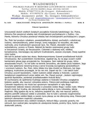 WIADOMOŚCI POLSKIEJ PARAFII W BEDFORD LETCHWORTH I HITCHIN Tel/Fax: (01234 266901) Dom: (01234) 343105 Mobile: 07946773214 (Ks Grzegorz Aleksandrowicz) Mobile: 07519059276 (Ks Cezary Komosi ński) Wydaje duszpasterz polski Ks. Grzegorz Aleksandrowicz www.ppb.org.uk oraz e-mail: [email protected] i [email protected] (Ks Cezary) For Private Circulation Only Nr. 1435 UROCZYSTOŚĆ ŚWIĘTYCH APOSTOŁÓW PIOTRA I PAWŁA ROK B Pokorni Apostołowie Uroczystość dwóch wielkich świętych początków Kościoła katolickiego: św. Piotra, któremu Pan powierzył władzę nad chrześcijanami pochodzącymi z Żydów, i św. Pawła, któremu Chrystus powierzył władzę nad chrześcijanami pochodzącymi z pogan. Św. Piotr był prostym rybakiem, powiedzielibyśmy dzisiaj: pochodził z robotniczej rodziny, niewykształcony, pełen energii, żywo reagujący na wszystko, ale mało wytrwały, przy trudnościach opuszczał ręce. Św. Paweł, obywatel rzymski, wykształcony, uczony w Prawie. Należał do bardzo szanowanej grupy ludzi w ówczesnym Izraelu, do faryzeuszów. Człowiek o stalowej woli, wielkiej konsekwencji, niezrażający się żadnymi trudnościami, zawsze zwycięski. Dwaj zupełnie różni ludzie. Nie byli to jednak ludzie bez skazy. Bezkompromisowy Szaweł prześladował Kościół Chrystusowy. Był uczestnikiem morderstwa. Zgadzał się, by na jego oczach rozbili kamieniami głowę jego przyjaciela św. Szczepana. Sam należał do grupy, która aresztowała innych, i to nie tylko na terenie Jerozolimy, ale daleko poza miastem. Jego ręce były splamione niewinną krwią a serce krzywdą wyrządzaną sprawiedliwym i uczciwym ludziom. Św. Piotr, który blisko trzy lata chodził za Mistrzem, był Jego zastępcą, trzykrotnie przysięgał, że Go nie zna. Zaparł się Go. I oto takich ludzi Chrystus uczynił Apostołami, i takim ludziom oddał władzę w Kościele. Ludziom świadomym popełnionych przez siebie win. Św. Paweł wyznał: „Jestem najmniejszy spośród Apostołów, ponieważ prześladowałem Kościół Boży”. W wychowaniu do spełnienia trudnego zadania w Kościele Chrystus uwzględnia bolesne upadki, aby nauczyć człowieka pokory. Pokora jest podstawą mądrości. Człowiek niepokorny nie może być sprawnym narzędziem w ręku Boga. Świadomość słabości stawia człowieka w prawdzie wobec Boga i wobec ludzi. Własny grzech może być trudną, ale niezwykle ważną lekcją w życiu człowieka, lekcją mądrości. Bóg zgadza się na to, żebyśmy popełnili zło, aby nas nauczyć pokory, abyśmy potrafili zobaczyć siebie w prawdzie. Iluż to ludzi z powodu wygórowanej ambicji popełnia wielkie błędy w swoim życiu płacąc za nie olbrzymią cenę. Pokora jest istotnym elementem mądrości człowieka. Za wstawiennictwem dwu wielkich świętych, których Bóg z powodu grzechu nie odrzucił, lecz wybrał jako narzędzia do uświęcenia świata, prośmy Ojca, byśmy umieli doskonalić pokorę. MSZE ŚWIĘTE I NABOŻEŃSTWA w BEDFORD: Niedziela,28.06.2015 Godz. 9.30 Godz.11.00 Godz.19.00 Poniedziałek, 29.06. Godz. 9.30 Godz.19.00 Wtorek. 30.06.2015 Godz. 9.30 Św.Pierwszych Męcz. Godz.19.00 Środa, 1.07.2015 Godz. 9.30 Godz.19.00 Czwartek, 2.07.2015 Godz. 9.30 Godz. 19.00 Piątek, 3.07.2015 Św. Tomasza Godz. 15.00 Apostoła Godz. 18.00 Godz. 19.00 Sobota, 4.07.2015 Godz. 9.30 Godz.19.00 Niedziela, 5.07.2015 Godz. 9.30 Godz.11.00 Godz.18.00 Godz.19.00 Charity Reg.No.1119423 UROCZYSTOŚĆ ŚW. APOSTOŁÓW PIOTRA i PAWŁA za ś.p.Władysława Jagieły w 8-mą rocznicę śmierci– int. córki Lucyny z rodziną O błog. Boże i potrzebne łaski dla Nicoli z okazji 7-ych urodzin – int. rodziców - za dusze ś.p. Piotra Denisow - int. rodziny. - O błog. Boże i opiekę Matki Bożej dla Ks Pawła Maciaszka - int. przyjaciół. - O błog. Boże i opiekę Matki Bożej dla Piotra Sieńko – int. taty Tadeusza. - Intencja wolna. - Intencja wolna. - O błogosławieństwo Boże dla Mieczysława z okazji 63 urodzin– int. rodziny. - Intencja wolna. - Intencja wolna - Intencja wolna. - PIERWSZY PIĄTEK miesiąca LIPCA - O zdrowie dla brata Pawła. Koronka do Miłosierdzia Bożego. -SPOWIEDŹ ŚW.dla dzieci Komunijnych z okazji Pierwszego piątku miesiaca. - O pełnię łask Bożych dla Zuzi i Tosi w dniu urodzin – int. rodziców. - Intencja wolna. - Intencja wolna. CZTERNASTA NIEDZIELA ZWYKŁA ROKU LITURGICZNEGO Rok B O błog.Boże dla Benjamina Arapi z okazji 1-szej rocznicy urodzin– int.dziadków. - za dusze ś.p. Marianny Morel - int. kuzynki. - ADORACJA NAJŚWIĘTSZEGO SAKRAMENTU. - Intencja wolna. SAKRAMENT CHRZTU ŚW.: W naszym kościele w Bedford Sakrament Chrztu świetego otrzymali: JOSH ALAN KRZYSZTOF HUGHES, NATHAN JERZY WHITAKER, WIKTORIA KATULSKA i OSKAR ARTUR ZDUNEK. Nowo ochrzczonym dzieciom i ich rodzicom życzymy błogosławieństwa i opieki Bożej. OGŁOSZENIA PARAFIALNE: 1. Są do nabycia:„Gość Niedzielny,” „Mały Gość Niedzielny” w cenie Ł1.50 oraz „Różaniec”, „Tak Rodzinie” i „Anioł Stróż” w cenie Ł 2. 2. W tym tygodniu 3 lipca przypada pierwszy piątek miesiąca. Zachęcam dzieci Komunijne do rozpoczęcia 9 pierwszych piątków miesiąca przystępując do Spowiedzi św i Komunii św. Spowiedź dla dzieci odbędzie się od godz. 18.00 do godz.19.00. Msza św w piątek o godz.19.00 3. W ten piątek 3 lipca o godz. 18.00 odbędzie się Zebranie dla ministrantów w salce nad zakrystią. 4. W niedzielę 12 lipca o godz. 11.00 odprawiona będzie Msza swięta dla dzieci i młodzieży szkolnej na zakonczenie roku szkolnego. Zapraszam dzieci z obu polskich szkół sobotnich i rownież te dzieci, które nie uczęszczają do szkół sobotnich. 5. Dzisiaj podczas Mszy świętych będzie zbierana dodatkowa zbiórka tzw. „Świętopietrze” 6. Od niedzieli 19 lipca do końca sierpnia a więc do 30 sierpnia nie bedzie Mszy świętej w niedziele o godz. 11.00. Będą odprawiane tylko dwie Msze swięte w niedziele: o godz.9.30 i go