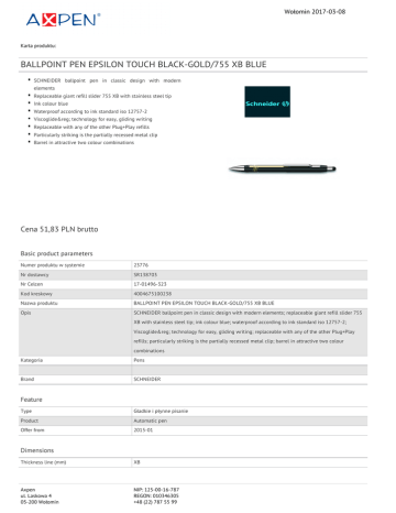 Wołomin 2017-03-08 Karta produktu: BALLPOINT PEN EPSILON TOUCH BLACK-GOLD/755 XB BLUE SCHNEIDER ballpoint pen in classic design with modern elements Replaceable giant refill slider 755 XB with stainless steel tip Ink colour blue Waterproof according to ink standard iso 12757-2 Viscoglide® technology for easy, gliding writing Replaceable with any of the other Plug+Play refills Particularly striking is the partially recessed metal clip Barrel in attractive two colour combinations Cena 51,83 PLN brutto Basic product parameters Numer produktu w systemie 23776 Nr dostawcy SR138703 Nr Celcen 17-01496-323 Kod kreskowy 4004675100238 Nazwa produktu BALLPOINT PEN EPSILON TOUCH BLACK-GOLD/755 XB BLUE Opis SCHNEIDER ballpoint pen in classic design with modern elements; replaceable giant refill slider 755 XB with stainless steel tip; ink colour blue; waterproof according to ink standard iso 12757-2; Viscoglide® technology for easy, gliding writing; replaceable with any of the other Plug+Play refills; particularly striking is the partially recessed metal clip; barrel in attractive two colour combinations Kategoria Pens Brand SCHNEIDER Feature Type Gładkie i płynne pisanie Product Automatic pen Offer from 2015-01 Dimensions Thickness line (mm) XB Axpen ul. Laskowa 4 05-200 Wołomin NIP: 125-00-16-787 REGON: 010346305 +48 (22) 787 55 99 Wołomin 2017-03-08 Karta katalogowa produktu cd. BALLPOINT PEN EPSILON TOUCH BLACK-GOLD/755 XB BLUE Colour Colour N/D Procurement vocabulary CPV 30192121-5 Długopisy kulkowe Certifications New product Standard Hit Standard Serdecznie zapraszamy do współpracy Axpen zespół. Axpen ul. Laskowa 4 05-200 Wołomin NIP: 125-00-16-787 REGON: 010346305 +48 (22) 787 55 99