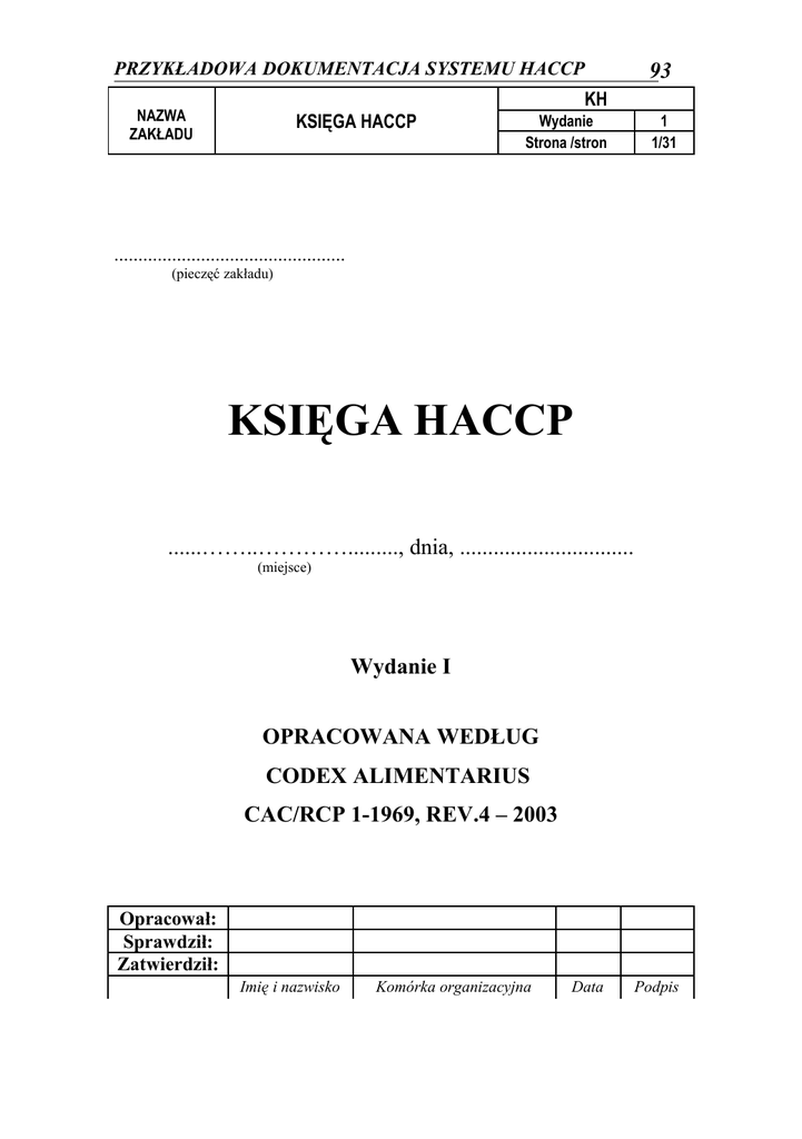 PRZYKŁADOWA DOKUMENTACJA SYSTEMU HACCP NAZWA ZAKŁADU KSIĘGA HACCP 93 KH Wydanie Strona /stron 1 1/31 ................................................ (pieczęć zakładu) KSIĘGA HACCP ......……..…………........., dnia, ............................... (miejsce) Wydanie I OPRACOWANA WEDŁUG CODEX ALIMENTARIUS CAC/RCP 1-1969, REV.4 – 2003 Opracował: Sprawdził: Zatwierdził: Imię i nazwisko Komórka organizacyjna Data Podpis PRZYKŁADOWA DOKUMENTACJA SYSTEMU HACCP NAZWA ZAKŁADU KSIĘGA HACCP 94 KH Wydanie Strona /stron 1 2/31 SPIS TREŚCI 1. Część pierwsza – Informacje wstępne 1.1. Profil zakładu 1.2. Schemat organizacyjny 1.3. Definicje 1.4. Polityka bezpieczeństwa żywności 1.5. Zakres systemu HACCP 1.6. Plan pomieszczeń 1.7. Zarządzenie o powołaniu Zespołu HACCP 2. Część druga – Opis ogólny systemu HACCP według wytycznych Kodeksu Żywnościowego, w oparciu o siedem zasad systemu HACCP 2.1. Utworzenie zespołu HACCP 2.2. Opis produktu 2.3. Określenie przeznaczenia produktu 2.4. Opracowanie schematu procesu technologicznego 2.5. Weryfikacja schematu procesu technologicznego 2.6. Identyfikacja i analiza zagrożeń (ZASADA 1) 2.7. Określenie CCP Krytycznych Punktów Kontroli (ZASADA 2) 2.8. Ustalenie limitów krytycznych dla każdego CCP (ZASADA 3) 2.9. Ustalenie sposobu monitorowania każdego CCP (ZASADA 4) 2.10.Określenie działań korygujących (ZASADA 5) 2.11.Ustalenie sposobu weryfikacji systemu HACCP (ZASADA 6) 2.12.Opracowanie dokumentacji systemu HACCP (ZASADA 7) 3. Część trzecia – informacje uzupełniające 3.1. Załączniki 3.2. Klauzula zmian Księgi HACCP PRZYKŁADOWA DOKUMENTACJA SYSTEMU HACCP NAZWA ZAKŁADU 95 KH KSIĘGA HACCP Wydanie Strona /stron 1 3/31 Część I – Informacje wstępne 1.1. Profil zakładu Szkoła Podstawowa Nr …….. w …………………….….. jest placówką oświatową prowadzoną przez Gminę ………………………………..…… Żywieniem zbiorowym objętych jest ……………………..….… uczniów. Posiłki przygotowuje i wydaje stołówka szkolna w której zatrudnionych jest …………… pracowników. Stołówka szkolna pracuje i wydaje posiłki od ………... godziny do godziny …….. Ze stołówki szkolnej korzystają również osoby dorosłe (pracownicy, nauczyciele) w liczbie ……………... Dane identyfikacyjne: Adres: ul. ...................................................................................................... NIP: .............................................................................................................. REGON: ....................................................................................................... 1.2. Schemat organizacyjny DYREKTOR V-CE DYREKTOR KIEROWNIK STOŁÓWKI GŁÓWNY KSIĘGOWY KIEROWNIK KUCHNI INTENDENT MAGAZYNIER KUCHARKA POMOC KUCHENNA - Stanowiska objęte systemem HACCP