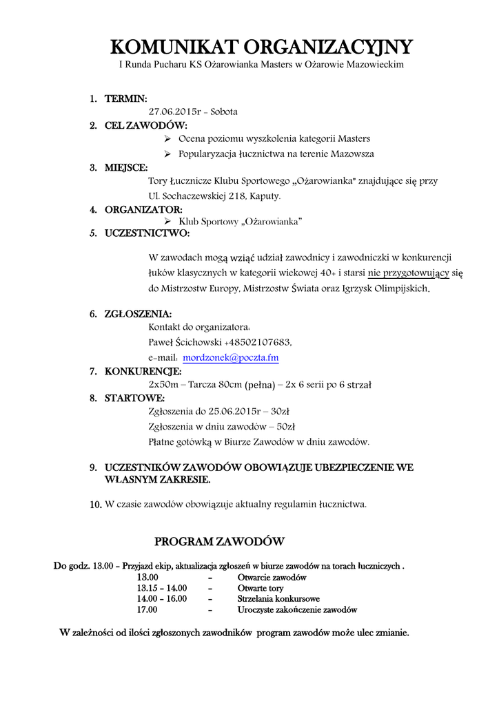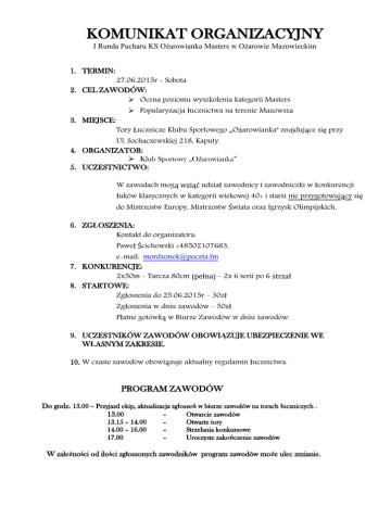 KOMUNIKAT ORGANIZACYJNY I Runda Pucharu KS Ożarowianka Masters w Ożarowie Mazowieckim 1. TERMIN: 27.06.2015r - Sobota 2. CEL ZAWODÓW: Ocena poziomu wyszkolenia kategorii Masters 3. MIEJSCE: Popularyzacja łucznictwa na terenie Mazowsza Tory Łucznicze Klubu Sportowego „Ożarowianka” znajdujące się przy Ul. Sochaczewskiej 218, Kaputy. 4. ORGANIZATOR: Klub Sportowy „Ożarowianka” 5. UCZESTNICTWO: W zawodach mogą wziąć udział zawodnicy i zawodniczki w konkurencji łuków klasycznych w kategorii wiekowej 40+ i starsi nie przygotowujący się do Mistrzostw Europy, Mistrzostw Świata oraz Igrzysk Olimpijskich. 6. ZGŁOSZENIA: Kontakt do organizatora: Paweł Ścichowski +48502107683, e-mail: [email protected] 7. KONKURENCJE: 2x50m – Tarcza 80cm (pełna) – 2x 6 serii po 6 strzał 8. STARTOWE: Zgłoszenia do 25.06.2015r – 30zł Zgłoszenia w dniu zawodów – 50zł Płatne gotówką w Biurze Zawodów w dniu zawodów. 9. UCZESTNIKÓW ZAWODÓW OBOWIĄZUJE UBEZPIECZENIE WE WŁASNYM ZAKRESIE. 10. W czasie zawodów obowiązuje aktualny regulamin łucznictwa. PROGRAM ZAWODÓW Do godz. 13.00 – Przyjazd ekip, aktualizacja zgłoszeń w biurze zawodów na torach łuczniczych . 13.00 – Otwarcie zawodów 13.15 – 14.00 14.00 – 16.00 17.00 – – – Otwarte tory Strzelania konkursowe Uroczyste zakończenie zawodów W zależności od ilości zgłoszonych zawodników program zawodów może ulec zmianie.
