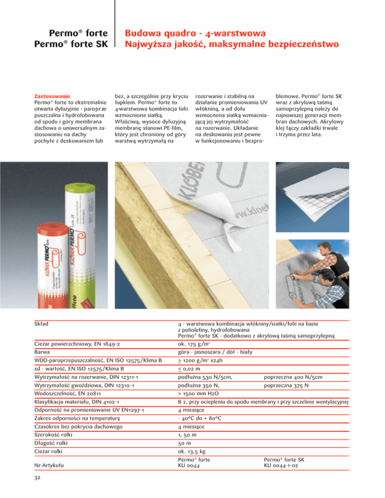 Permo® forte Permo® forte SK Zastosowanie Permo® forte to ekstremalnie otwarta dyfuzyjnie - paro p r zepuszczalna i hydrofobowana od spodu i góry membrana dachowa o uniwersalnym zastosowaniu na dachy pochy⌅e z deskowaniem lub Budowa quadro - 4-warstwowa Najwy˝sza jakość, maksymalne bezpieczeƒstwo bez, a szczególnie przy kryciu ⌅upkiem. Permo® forte to 4-warstwowa kombinacja folii wzmocniona siatką. W⌅aściwą, wysoce dyfuzyjną membranę stanowi PE-film, który jest chroniony od góry warstwą wytrzyma⌅ą na rozerwanie i stabilną na dzia⌅anie promieniowania UV w⌅ókniną, a od do⌅u wzmocnona siatką wzmacniającą jej wytrzyma⌅ość na rozerwanie. Uk⌅adanie na deskowaniu jest pewne w funkcjonowaniu i bezpro- blemowe. Permo® forte SK wraz z akrylową taśmą samoprzylepną nale˝y do najnowszej generacji membran dachowych. Akrylowy klej ⌅ączy zak⌅adki trwale i trzyma przez lata. Sk⌅ad 4 - warstwowa kombinacja w⌅ókniny/siatki/folii na bazie z poliolefiny, hydrofobowana Permo® forte SK - dodatkowo z akrylową taśmą samoprzylepną Cie˝ar powierzchniowy, EN 1849-2 ok. 175 g/m2 Barwa góra - jasnoszara / dó⌅ - bia⌅y WDD-paroprzepuszczalność, EN ISO 12575/Klima B >_ 1200 g/m2 x24h sd - wartość, EN ISO 12575/Klima B <_ 0,02 m Wytrzyma⌅ość na rozerwanie, DIN 12311-1 pod⌅u˝na 530 N/5cm, poprzeczna 400 N/5cm Wytrzyma⌅ość gwoździowa, DIN 12310-1 pod⌅u˝na 350 N, poprzeczna 375 N Wodoszczelność, EN 20811 > 1500 mm H2O Klasyfikacja materia⌅u, DIN 4102-1 B 2, przy ociepleniu do spodu membrany i przy szczelinie wentylacyjnej Odporność na promieniowanie UV EN1297-1 4 miesiące Zakres odporności na temperaturę - 40ºC do + 80ºC Czasokres bez pokrycia dachowego 4 miesiące Szerokość rolki 1, 50 m D⌅ugość rolki 50 m Cie˝ar rolki ok. 13,5 kg Nr-Artyku⌅u Permo® forte KU 0044 32 Permo® forte SK KU 0044-1-02