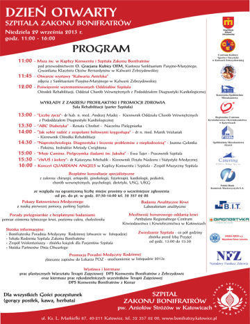 DZIEÑ OTWARTY SZPITALA ZAKONU BONIFRATRÓW Niedziela 29 wrzeœnia 2013 r. godz. 11:00 - 16:00 PROGRAM 11:00 - Msza œw. w Kaplicy Konwentu i Szpitala Zakonu Bonifratrów Centrum Kultury Sportu i Turystyki w Kalwarii Zebrzydowskiej pod przewodnictwem O. Gracjana Kubicy OFM, Kustosza Sanktuarium Pasyjno-Maryjnego, Gwardiana Klasztoru Ojców Bernardynów w Kalwarii Zebrzydowskiej 11:45 - Otwarcie wystawy “Kalwaria Anielska” zdjêcia z Sanktuarium Pasyjno-Maryjnego w Kalwarii Zebrzydowskiej 12:00 - Poœwiêcenie wyremontowanych Oddzia³ów Szpitala Oœrodek Rehabilitacji, Oddzia³ Chorób Wewnêtrznych z Pododdzia³em Diagnostyki Kardiologicznej Katowicka Spó³dzielnia Mieszkaniowa WYK£ADY Z ZAKRESU PROFILAKTYKI I PROMOCJI ZDROWIA Sala Rehabilitacji (parter Szpitala) 13:00 - ”Liczby ¿ycia”- dr hab. n. med. Andrzej Madej - Kierownik Oddzia³u Chorób Wewnêtrznych z Pododdzia³em Diagnostyki Kardiologicznej 13:30 14:00 - ”ABC Diabetyka” - Renata Chrobot - Naczelna Pielêgniarka - ”Jak sobie radziæ z zespo³ami bólowymi krêgos³upa” - dr n. med. Marek Walusiak Regionalne Centrum Krwiodawstwa i Krwiolecznictwa w Katowicach - Kierownik Oœrodka Rehabilitacji 14:30 - ”Naprotechnologia. Diagnostyka i leczenie problemów z niep³odnoœci¹” - Joanna Golonka Spó³dzielnia Mieszkaniowa PIAST - Po³o¿na, Instruktor Metody Creightona 15:00 - ”Moje Camino. Pielgrzymka œladami œw. Jakuba” - Ewa Tajer - Pracownik Szpitala 15:30 - ”eWUŒ i kolory”- dr Katarzyna Michalik - Kierownik Dzia³u Nadzoru i Statystyki Medycznej 16:00 - Koncert GUARDIAN ANGELS w Kaplicy Konwentu i Szpitala - Zespó³ Muzyczny Szpitala Bezp³atne konsultacje specjalistyczne z zakresu: chirurgii, ortopedii, ginekologii, fizjoterapii, kardiologii, pediatrii, chorób wewnêtrznych, psychologii, dietetyki, USG, UKG Polski Bank Komórek Macierzystych S.A. ze wzglêdu na ograniczon¹ liczbê miejsc prosimy o wczeœniejsze zg³oszenia od pn. do pt. w godz. 07:30-14:00 tel. 32 357 62 08 Pokazy Ratownictwa Medycznego z nauk¹ pierwszej pomocy, parking Szpitala Badania Analityczne Krwi Laboratorium analityczne Porady pielêgniarskie z bezp³atnymi badaniami: pomiar ciœnienia têtniczego krwi, poziomu cukru, cholesterolu Mo¿liwoœæ honorowego oddania krwi Ambulans Regionalnego Centrum Krwiodawstwa i Krwiolecznictwa w Katowicach Stoiska informacyjne: - Bonifraterska Poradnia Medycyny Rodzinnej (otwarcie w listopadzie) - Szko³a Rodzenia Szpitala Zakonu Bonifratrów - Zespó³ Wolontariuszy - zbiórka ksi¹¿ek dla Pacjentów Szpitala - Stoiska Partnerów Dnia Otwartego Zwiedzanie Szpitala - co pó³ godziny zbiórka przed Izb¹ Przyjêæ od godz. 13:00 do 15:30 Promocja Poradni Medycyny Rodzinnej zbieranie zapisów do Lekarza POZ - uruchomienie w listopadzie 2013r. Wystawa i kiermasz prac plastycznych Warsztatu Terapii Zajêciowej DPS Konwentu Bonifratrów z Zebrzydowic oraz kiermasz prac rêkodzielniczych uczestników Terapii Zajêciowej DPS Konwentu Bonifratrów z Konar Dla wszystkich Goœci poczêstunek (gor¹cy posi³ek, kawa, herbata) SZPITAL ZAKONU BONIFRATRÓW pw. Anio³ów Stró¿ów w Katowicach ul. Ks. L. Markiefki 87, 40-211 Katowice, tel. 32 357 62 00, www.bonifratrzy.katowice.pl