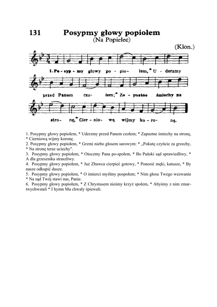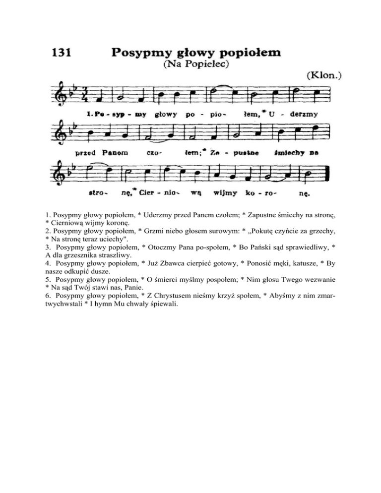 1. Posypmy głowy popiołem, * Uderzmy przed Panem czołem; * Zapustne śmiechy na stronę, * Cierniową wijmy koronę. 2. Posypmy głowy popiołem, * Grzmi niebo głosem surowym: * „Pokutę czyńcie za grzechy, * Na stronę teraz uciechy". 3. Posypmy głowy popiołem, * Otoczmy Pana po-społem, * Bo Pański sąd sprawiedliwy, * A dla grzesznika straszliwy. 4. Posypmy głowy popiołem, * Już Zbawca cierpieć gotowy, * Ponosić męki, katusze, * By nasze odkupić dusze. 5. Posypmy głowy popiołem, * O śmierci myślmy pospołem; * Nim głosu Twego wezwanie * Na sąd Twój stawi nas, Panie. 6. Posypmy głowy popiołem, * Z Chrystusem nieśmy krzyż społem, * Abyśmy z nim zmartwychwstali * I hymn Mu chwały śpiewali.