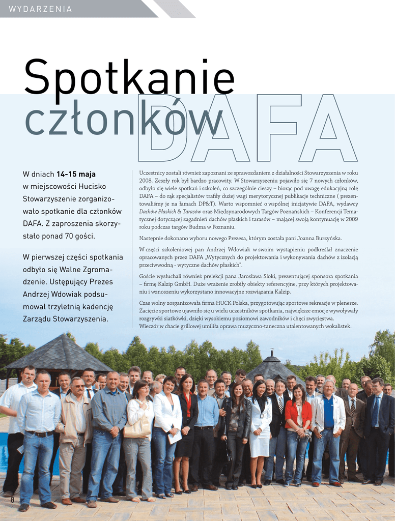 wydarzenia Spotkanie członków W dniach 14-15 maja DAFA. Z zaproszenia skorzy- Uczestnicy zostali również zapoznani ze sprawozdaniem z działalności Stowarzyszenia w roku 2008. Zeszły rok był bardzo pracowity. W Stowarzyszeniu pojawiło się 7 nowych członków, odbyło się wiele spotkań i szkoleń, co szczególnie cieszy – biorąc pod uwagę edukacyjną rolę DAFA – do rąk specjalistów trafiły dużej wagi merytorycznej publikacje techniczne ( prezentowaliśmy je na łamach DP&T). Warto wspomnieć o wspólnej inicjatywie DAFA, wydawcy Dachów Płaskich & Tarasów oraz Międzynarodowych Targów Poznańskich – Konferencji Tematycznej dotyczącej zagadnień dachów płaskich i tarasów – mającej swoją kontynuację w 2009 roku podczas targów Budma w Poznaniu. stało ponad 70 gości. Następnie dokonano wyboru nowego Prezesa, którym została pani Joanna Burzyńska. W pierwszej części spotkania W części szkoleniowej pan Andrzej Wdowiak w swoim wystąpieniu podkreślał znaczenie opracowanych przez DAFA „Wytycznych do projektowania i wykonywania dachów z izolacją przeciwwodną - wytyczne dachów płaskich”. w miejscowości Hucisko Stowarzyszenie zorganizowało spotkanie dla członków odbyło się Walne Zgromadzenie. Ustępujący Prezes Andrzej Wdowiak podsumował trzyletnią kadencję Zarządu Stowarzyszenia. Goście wysłuchali również prelekcji pana Jarosława Sloki, prezentującej sponsora spotkania – firmę Kalzip GmbH. Duże wrażenie zrobiły obiekty referencyjne, przy których projektowaniu i wznoszeniu wykorzystano innowacyjne rozwiązania Kalzip. Czas wolny zorganizowała firma HUCK Polska, przygotowując sportowe rekreacje w plenerze. Zacięcie sportowe ujawniło się u wielu uczestników spotkania, największe emocje wywoływały rozgrywki siatkówki, dzięki wysokiemu poziomowi zawodników i chęci zwycięstwa. Wieczór w chacie grillowej umiliła oprawa muzyczno-taneczna utalentowanych wokalistek. Zarząd Stowarzyszenia DAFA na kadencję w latach 2009-2012. Brunon Gogol, Członek Zarządu Stowarzyszenia Wykonawców Dachów Płaskich i Fasad DAFA, Prezes Przedsiębiorstwa Usług Specjalistycznych Termatex Sp. z o.o., działającego na rynku od 1987 r. Absolwent Akademii Górniczo-Hutniczej im. Stanisława Staszica w Krakowie na Wydziale Inżynierii Materiałowej i Ceramiki w zakresie Technologii Materiałów Ogniotrwałych. Zainteresowania: tenis, narciarstwo, podróże. Anatol Panfiluk, Członek Zarządu DAFA, absolwent Wydziału Architektury na Politechnice Warszawskiej, oraz Podyplomowych Studiów Menedżerskich na Uniwersytecie Warszawskim. Od roku 1995 związany z firmą Rockwool Polska Sp. z o.o., obecnie Menedżer Działu Sprzedaży Inwestycji. Zainteresowania: różne dyscypliny sportowe, architektura. Andrzej Wdowiak, Prezes Stowarzyszenia DAFA w latach 2006-2009, Prezes firmy Poburski Dachtechnik Sp. z o.o.. Kariera zawodowa obejmująca doświadczenie zdobywane na ryku polskim oraz niemieckim. Od ponad 20 lat związany jest z branżą budowlaną dachów płaskich i fasad, posiada również duże doświadczenie w zakresie izolacji parkingów i przeciwko wodzie gruntowej. Jest absolwentem Wydziału Budownictwa Politechniki Opolskiej. W sferze zainteresowań Andrzeja Wdowiaka znajdują się m.in.: tenis, piłka nożna, literatura managementu oraz elementy kultury wschodu. Mirosław Wróblewski, Członek Zarządu DAFA, wykształcenie wyższe na kierunku Ochrona Środowiska na Politechnice Śląskiej w Gliwicach. Prezes firmy FDT Technologie Dachów Płaskich Sp. z o.o., Polting S.A. oraz współwłaściciel firmy Polting Foam Sp. z o.o. 15-letnie doświadczenie w branży. Zainteresowania: sport, fotografia. 2009-2012 Stowarzyszenia Joanna Burzyńska, Prezes Zarządu Stowarzyszenia DAFA, od 1998r związana z firmą Koelner SA, obecnie Menedżer Działu Zamocowań Izolacji Dachowej i Fasadowej. Absolwentka Akademii Ekonomicznej we Wrocławiu na Wydziale Inżynierii Ekonomicznej Przemysłu. Zainteresowania: podróże, sport.