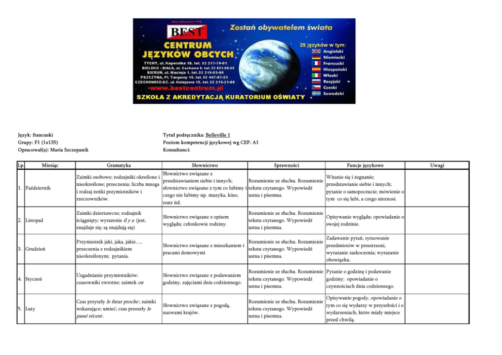 Język: francuski Grupy: F1 (1x135) Opracował(a): Maria Szczepanik Lp. Miesiąc Tytuł podręcznika: Belleville 1 Poziom kompetencji językowej wg CEF: A1 Konsultanci: Gramatyka Słownictwo Sprawności Funcje językowe 1. Październik Słownictwo związane z Zaimki osobowe; rodzajniki określone i przedstawianiem siebie i innych; Rozumienie ze słuchu. Rozumienie nieokreślone; przeczenia; liczba mnoga słownictwo związane z tym co lubimy i tekstu czytanego. Wypowiedź i rodzaj żeńki przymiotników i czego nie lubimy np. muzyka, kino, ustna i pisemna. rzeczowników. teatr itd. 2. Listopad Zaimki dzierżawcze; rodzajnik ściągnięty; wyrażenie il y a (jest, znajduje się; są znajdują się) Słownictwo związane z opisem wyglądu; członkowie rodziny. 3. Grudzień Przymiotnik jaki, jaka, jakie…, przeczenia z rodzajnikiem nieokreślonym; pytania. Zadawanie pytań, sytuowanie Rozumienie ze słuchu. Rozumienie Słownictwo związane z mieszkaniem i przedmiotów w przestrzeni, tekstu czytanego. Wypowiedź pracami domowymi wyrażanie zaskoczenia; wyrażanie ustna i pisemna. obowiązku. 4. Styczeń Uzgadnianie przymiotników; czasowniki zwrotne; zaimek on Słownictwo związane z podawaniem godziny, zajęciami dnia codziennego. Rozumienie ze słuchu. Rozumienie Pytanie o godzinę i podawanie tekstu czytanego. Wypowiedź godziny; opowiadanie o ustna i pisemna. czynnościach dnia codziennego. 5. Luty Czas przyszły le futur proche ; zaimki wskazujące; umieć; czas przeszły le passé récent . Słownictwo związane z pogodą, nazwami krajów. Opisywanie pogody, opowiadanie o Rozumienie ze słuchu. Rozumienie tym co się wydarzy w przyszłości i o tekstu czytanego. Wypowiedź wydarzeniach, które miały miejsce ustna i pisemna. przed chwilą. Witanie się i żegnanie; przedstawianie siebie i innych; pytanie o samopoczucie; mówienie o tym co się lubi, a czego nieznosi. Rozumienie ze słuchu. Rozumienie Opisywanie wyglądu; opowiadanie o tekstu czytanego. Wypowiedź swojej rodzinie. ustna i pisemna. Uwagi 6. Marzec Czas przeszły le passé composé; zaimki Rozumienie ze słuchu. Rozumienie Relacjonowanie wydarzeń z Słownictwo związane z w funkcji dopełnienia bliższego; tekstu czytanego. Wypowiedź relacjonowaniem zdarzeń z przeszłości. przeszłości. przyimki przed nazwami państw. ustna i pisemna. 7. Kwiecień Tryb rozkazujący; zaimek y; różne sposoby zadawania pytań; zaimki względne qui i que; czas przyszły le futur simple. 8. Maj Czas przeszły l'imparfait; porównania; Słownictwo związane z opisywaniem zaimki w funkcji dopełnienia dalszego. przedmiotów i ludzi. 9. Czerwiec Rozumienie ze słuchu. Rozumienie Powtórzenie i utrwalenie Powtórzenieni utrwalenie wiadomości. Powtórzenie i utrwalenie wiadomości. tekstu czytanego. Wypowiedź wiadomości. ustna i pisemna. Słownictwo związane ze wskazywaniem drogi; słownictwo związane z opowiadaniem o swoich planach na przyszłość. Rozumienie ze słuchu. Rozumienie Pytanie o drogę i wskazywanie tekstu czytanego. Wypowiedź drogi; opowiadanie o swoich ustna i pisemna. planach na przyszłość. Rozumienie ze słuchu. Rozumienie Opowiadanie o zwyczajach w tekstu czytanego. Wypowiedź przeszłości; porównywanie ustna i pisemna. przedmiotów i osób.