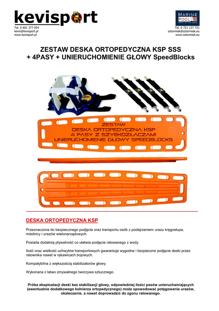 Tel. 0 601 377 054 [email protected] www.kevisport.pl Tel. 0 721 127 721 [email protected] www.sztormiak.eu ZESTAW DESKA ORTOPEDYCZNA KSP SSS + 4PASY + UNIERUCHOMIENIE GŁOWY SpeedBlocks DESKA ORTOPEDYCZNA KSP Przeznaczona do bezpiecznego podjęcia oraz transportu osób z podejrzeniem urazu kręgosłupa, miednicy i urazów wielonarządowych. Posiada dodatnią pływalność co ułatwia podjęcie ratowanego z wody. Ilość oraz wielkość uchwytów transportowych gwarantuje wygodne i bezpieczne podjęcie deski przez ratownika nawet w rękawicach bojowych. Kompatybilna z większością stabilizatorów głowy. Wykonana z łatwo zmywalnego tworzywa sztucznego. Próba eksploatacji deski bez stabilizacji głowy, odpowiedniej ilości pasów unieruchamiających (ewentualnie dodatkowego kołnierza ortopedycznego) może spowodować potęgowanie urazów, okaleczenie, a nawet doprowadzić do zgonu ratowanego. Tel. 0 601 377 054 [email protected] www.kevisport.pl Tel. 0 721 127 721 [email protected] www.sztormiak.eu Dane techniczne: Długość 182 cm. Szerokość 45 cm. Wysokość 6,5 cm. Waga 7,2 kg. Nośność 159 kg. Przepuszczalna dla promieni X, MRI, CT. 14 pinsów do błyskawicznego mocowania pasów (7 na stronę). Oddalenie uchwytów od podłoża 3,5 cm. Zwężony koniec dystalny. Unieruchomienie głowy SpeedBlocks Prosty, czteroetapowy sposób założenia dzięki poruszającym się wielokierunkowo specjalnie zaprojektowanym "klockom". Możliwość dobrego dopasowania bez względu na rodzaj obrażeń. Łatwy dostęp do uszu pacjenta. Niezawodny mechanizm unieruchamiający z szybko zwalnianą blokadą zapewniający pewną i wygodną wieloosiową regulację nawet w wodzie i piasku. Wymienne pianki i paski zapewniają 100% pewność czystości i bezpieczeństwa pacjenta. Uniwersalna podstawa z wymienną podkładką pod głowę jest łatwa w czyszczeniu – brak rzepów. Skuteczność odkażania zestawu wynosi powyżej 99%. Opatentowana mechaniczna blokada "klocków" daje pewną i skuteczną stabilizację nawet w deszczu i w wodzie. Unikalna konstrukcja umożliwia użycie SpeedBlocks już przy pacjentach powyżej 2 roku życia. Niska waga - każdy z klocków waży tylko 150g. Klocki wykonane są z trwałego i niepochłaniającego tworzywa. Przepuszczalne dla promieni rentgenowskich, może być używane w czasie diagnostyki tomografem komputerowym lub rezonansem magnetycznym. Nie zawiera lateksu. Pasy do deski zest. 4szt. szybkozłącza W komplecie 4 sztuki pasów do stabilizacji poszkodowanego (dzięki czemu wyeliminowano potrzebę ich przepinania). Dwuczęściowe, z regulacja długości po obu stronach klamry co przyspiesza prawidłowe ich ustawienie. Długość ok.150cm. Plastikowa klamra DELRIN®. Mocowane - obrotowe szybkozłącza (metalowe karabińczyki). Elementy metalowe w środowisku chlorowym (lub innym powodującym korozję) będą ulegać degradacji, nie jest to wada produktu i nie podlega reklamacji.