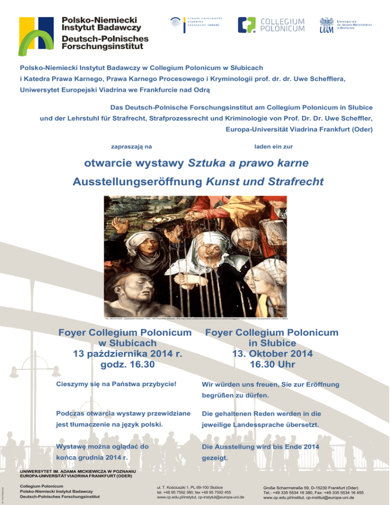 Polsko-Niemiecki Instytut Badawczy w Collegium Polonicum w Słubicach i Katedra Prawa Karnego, Prawa Karnego Procesowego i Kryminologii prof. dr. dr. Uwe Schefflera, Uniwersytet Europejski Viadrina we Frankfurcie nad Odrą Das Deutsch-Polnische Forschungsinstitut am Collegium Polonicum in Słubice und der Lehrstuhl für Strafrecht, Strafprozessrecht und Kriminologie von Prof. Dr. Dr. Uwe Scheffler, Europa-Universität Viadrina Frankfurt (Oder) zapraszają na laden ein zur otwarcie wystawy Sztuka a prawo karne Ausstellungseröffnung Kunst und Strafrecht fot.: Albrecht Dürer: „Opłakiwanie Chrystusa“, 1500 r., Alte Pinakothek, München, DPA, http://www.sueddeutsche.de/muenc:hen/trotz-wiederholungsgefahr-duerer-attentaeter-aus-psychiatrie-entlassen-1.736911 Foyer Collegium Polonicum w Słubicach 13 października 2014 r. godz. 16.30 Cieszymy się na Państwa przybycie! Foyer Collegium Polonicum in Słubice 13. Oktober 2014 16.30 Uhr Wir würden uns freuen, Sie zur Eröffnung begrüßen zu dürfen. Podczas otwarcia wystawy przewidziane Die gehaltenen Reden werden in die jest tłumaczenie na język polski. jeweilige Landessprache übersetzt. Wystawę można oglądać do Die Ausstellung wird bis Ende 2014 końca grudnia 2014 r. gezeigt. fot.: Anna Panek-Kusz UNIWERSYTET IM. ADAMA MICKIEWICZA W POZNANIU EUROPA-UNIVERSITÄT VIADRINA FRANKFURT (ODER) Collegium Polonicum Polsko-Niemiecki Instytut Badawczy Deutsch-Polnisches Forschungsinstitut ul. T. Kościuszki 1, PL 69-100 Słubice tel. +48 95 7592 380, fax +48 95 7592 455 www.cp.edu.pl/instytut, [email protected] Große Scharrnstraße 59, D-15230 Frankfurt (Oder) Tel.: +49 335 5534 16 380, Fax: +49 335 5534 16 455 www.cp.edu.pl/institut, [email protected]