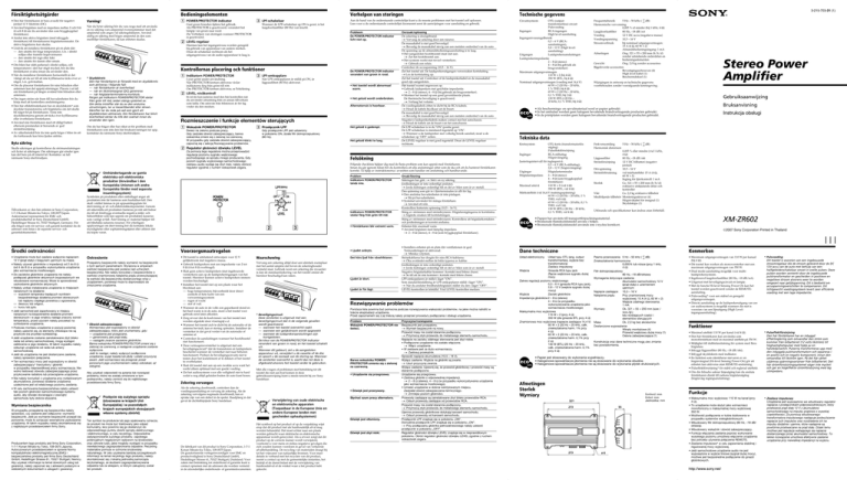 3-215-703-31 (1) 1 POWER/PROTECTOR indicator Varning! När du byter säkring bör du vara noga med att använda en ny säkring vars amperetal överensstämmer med det amperetal som anges vid säkringshållaren. Använd aldrig en säkring med högre amperetal än den som medföljer förstärkaren; då kan enheten skadas. Gaat groen branden tijdens het gebruik. Als PROTECTOR is geactiveerd, verandert het lampje van groen naar rood. Zie Verhelpen van storingen wanneer PROTECTOR is geactiveerd. 2 LEVEL-regelaar * Skyddskrets Den här förstärkaren är försedd med en skyddskrets som aktiveras i följande fall: — när förstärkaren är överhettad — när en likströmssignal (DC) genereras — när högtalarterminalerna kortsluts. Färgen på indikatorn POWER/PROTECTOR växlar från grön till röd, sedan stängs systemet av. Om detta inträffar slår du av den anslutna utrustningen, tar ur kassettbandet eller skivan. Därefter tar du reda på vad som gjort att skyddskretsen aktiverats. Om förstärkaren har blivit överhettad väntar du tills den svalnat innan du använder den igen. Om du har frågor eller har råkat ut för problem med förstärkaren som inte den här bruksanvisningen tar upp, kontaktar du närmaste Sony-återförsäljare. 1 Indikatorn POWER/PROTECTOR Lyser grönt under användning. När PROTECTOR-kretsen aktiveras växlar indikatorns färg från grönt till rött. Om PROTECTOR-kretsen aktiveras, se Felsökning. Producentem tego produktu jest firma Sony Corporation, 1-7-1 Konan Minato-ku Tokio, 108-0075 Japonia. Autoryzowanym przedstawicielem w sprawie Normy kompatybilności elektromagnetycznej (EMC) i bezpieczeństwa produktu jest firma Sony Deutschland GmbH, Hedelfinger Strasse 61, 70327 Stuttgart, Niemcy. Aby uzyskać informacje na temat dowolnych usług lub gwarancji, należy zapoznać się z adresami podanymi w oddzielnych dokumentach o usługach i gwarancji. De POWER/PROTECTOR indicator verandert van groen in rood. 3 LPF-omkopplare När LPF-omkopplaren är ställd på ON, är lågpassfiltret (80 Hz) aktiverat. • Het toestel wordt abnormaal warm. In-nivån kan justeras med den här kontrollen när du använder utrustning från en annan tillverkare som källa. Om utnivån från bilstereon är för låg vrider du den medurs. • Het geluid wordt onderbroken. Alternatorruis is hoorbaar. Rozmieszczenie i funkcje elementów sterujących 1 Wskaźnik POWER/PROTECTOR Świeci na zielono podczas pracy. Gdy zadziała obwód zabezpieczający, barwa wskaźnika zmieni się z zielonej na czerwoną. W przypadku gdy zadziała obwód zabezpieczający, zapoznaj się z sekcją Rozwiązywanie problemów. 3 Przełącznik LPF Het geluid is gedempt. Gdy przełącznik LPF jest ustawiony w położeniu ON, działa filtr dolnoprzepustowy (80 Hz). Het geluid klinkt te laag. Oorzaak/oplossing De zekering is doorgebrand. t Vervang de zekering door een nieuwe. De massakabel is niet goed bevestigd. t Bevestig de massakabel stevig aan een metalen onderdeel van de auto. De spanning op de afstandsbedieningsaansluiting is te laag. • Het aangesloten hoofdtoestel staat niet aan. t Zet het hoofdtoestel aan. • Het systeem werkt met teveel versterkers. t Gebruik een relais. Controleer de accuspanning (10,5 – 16 V). Zet het toestel uit. De luidsprekeruitgangen veroorzaken kortsluiting. t Los de kortsluiting op. Zet het toestel uit. Controleer of de luidsprekerkabel en de massakabel goed zijn aangesloten. Het toestel warmt ongewoon op. • Gebruik luidsprekers met geschikte impedantie. t 2 – 8 Ω (stereo), 4 – 8 Ω (bij gebruik als brugversterker). • Monteer het toestel op een goed geventileerde plaats. De thermische beveiliging is geactiveerd. t Verlaag het volume. De voedingskabels zitten te dicht bij de RCA-kabels. t Houd de kabels bij elkaar uit de buurt. De massakabel is niet goed bevestigd. t Bevestig de massakabel stevig aan een metalen onderdeel van de auto. Negatieve luidsprekerkabels maken contact met het autochassis. t Houd de kabels uit de buurt van het autochassis. De LPF-schakelaar is in de "ON"-positie gezet. De LPF-schakelaar is standaard ingesteld op "ON". t Wanneer u de luidspreker met volledig bereik aansluit, moet u de schakelaar op "OFF" zetten. De LEVEL-regelaar is niet goed ingesteld. Draai de LEVEL-regelaar rechtsom. 2 Regulator głośności dźwięku LEVEL Za pomocą tego regulatora można przeprowadzić regulację poziomu sygnału wejściowego pochodzącego ze sprzętu innego producenta. Gdy poziom sygnału wyjściowego samochodowego zestawu audio wydaje się zbyt niski, należy obrócić regulator zgodnie z ruchem wskazówek zegara. Symbolen på produkten eller emballaget anger att produkten inte får hanteras som hushållsavfall. Den skall i stället lämnas in på uppsamlingsplats för återvinning av el- och elektronikkomponenter. Genom att säkerställa att produkten hanteras på rätt sätt bidrar du till att förebygga eventuella negativa miljö- och hälsoeffekter som kan uppstå om produkten kasseras som vanligt avfall. Återvinning av material hjälper till att bibehålla naturens resurser. För ytterligare upplysningar om återvinning bör du kontakta lokala myndigheter eller sophämtningstjänst eller affären där du köpte varan. Felsökning Följande checklista hjälper dig med de flesta problem som kan uppstå med förstärkaren. Innan du går igenom listan bör du kontrollera att alla anslutningar sitter som de ska och att du hanterat förstärkaren korrekt. Ta hjälp av instruktionerna i avsnitten som handlar om anslutning och handhavande. Problem Indikatorn POWER/PROTECTOR tänds inte. LPF(80Hz) POWER/ PROTECTOR OFF 1 ON 2 0.5 4 6 0.3V LEVEL Ostrzeżenie Przepalony bezpiecznik należy wymienić na bezpiecznik o tych samych parametrach. Wyrażona w amperach wartość bezpiecznika jest podana nad uchwytem bezpiecznika. Nie należy korzystać z bezpieczników o wartości znamionowej natężenia prądu przewyższającej tę wartość dla bezpiecznika do