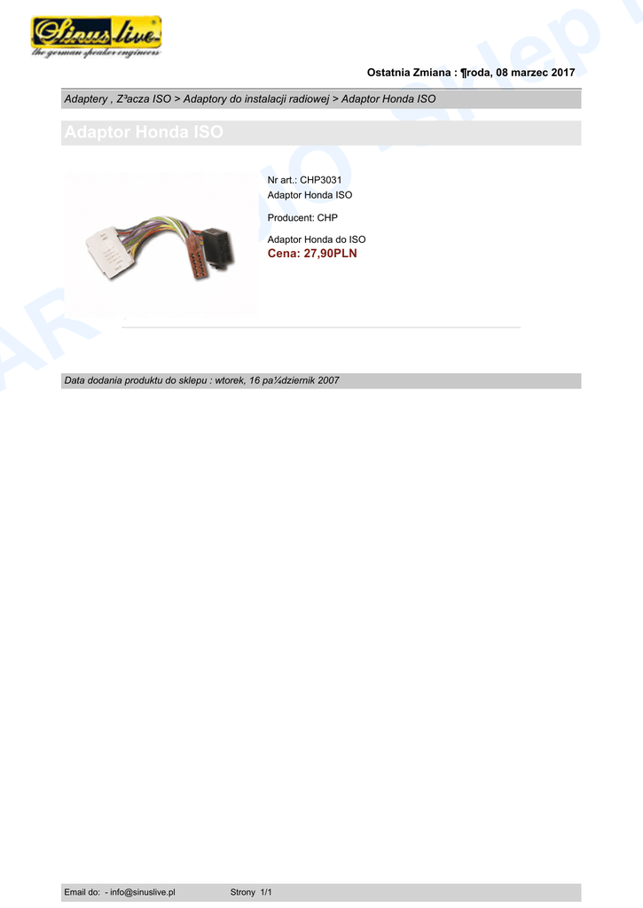e l k -S i p Ostatnia Zmiana : ¶roda, 08 marzec 2017 Adaptery , Z³acza ISO > Adaptory do instalacji radiowej > Adaptor Honda ISO Adaptor Honda ISO O I D Nr art.: CHP3031 Adaptor Honda ISO Producent: CHP A U A R Adaptor Honda do ISO Cena: 27,90PLN Data dodania produktu do sklepu : wtorek, 16 pa¼dziernik 2007 Email do: - [email protected] Strony 1/1