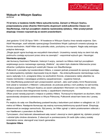 Wybuch w Wilczym Szańcu 2014-07-20 70 lat temu w kwaterze Adolfa Hitlera wybuchła bomba. Zamach w Wilczym Szańcu, przeprowadzony przez oficerów Wehrmachtu skupionych wokół pułkownika Clausa von Stauffenberga, miał być początkiem obalenia nazistowskiej dyktatury. Hitler przeżył jednak eksplozję i krwawo rozprawił się ze swoimi przeciwnikami. Jest godzina 12:42 20 lipca 1944 r. W kwaterze w Wilczym Szańcu trwa narada wojenna. Gen. Adolf Heusinger, szef oddziału operacyjnego Dowództwa Wojsk Lądowych omawia sytuację na froncie wschodnim. Adolf Hitler stoi pośrodku stołu, pochylony na mapami. Nagle salą wstrząsa potężna detonacja. „Długie języki ognia buchają we wszystkich kierunkach. Uczestnicy narady leżą na ziemi lub siłą podmuchu zostają wyrzuceni przez okna na zewnątrz” - wspominał wybuch gen. Heusinger. Niemiecka opozycja Jak tłumaczy Kazimierz Piekarski, historyk II wojny, zamach na Hitlera miał być początkiem wojskowego puczu nazwanego operacją „Walkiria”. Jej celem było obalenie hitlerowców przez oficerów i polityków skupionych wokół płk Clausa von Stauffenberga. Pułkownik z początku był zwolennikiem Hitlera, z czasem jednak przeszedł do opozycji uważając, że niekompetentny dyktator doprowadzi kraj do klęski. - Na zintensyfikowanie niemieckiego ruchu oporu wpłynęły m.in. przegrane bitwy na wschodnim froncie, zmasowane naloty aliantów na miasta niemieckie i narastające problemy zaopatrzeniowe – wyjaśnia historyk. Von Stauffenberg postanowił sam przeprowadzić zamach. Jako szef sztabu Armii Rezerwowej brał udział w naradach z Hitlerem i zdecydował, że podczas jednej z nich podłoży na sali bombę. 20 lipca pojawił się w Wilczym Szańcu ze swoim adiutantem Wernerem von Haeftenem, który dźwigał w teczce dwie kilogramowe bomby z zapalnikami chemicznymi. Oficer przed naradą poprosił o miejsce w pobliżu Hitlera. Tłumaczył to kłopotami ze słuchem, które spowodowały obrażenia odniesione w Afryce Północnej. Pułkownik stracił tam lewe oko i prawą dłoń. Po wejściu do salę von Stauffenberg postawił teczkę z ładunkiem pod stołem w odległości ok. 2,5 metra od Hitlera. Następnie tłumacząc się ważną rozmową telefoniczną opuścił barak. Eksplozję obserwował ze swojego samochodu. Był pewny, że Hitler zginął i z takim przekonaniem odleciał z von Haeftenem z powrotem do Berlina. Tymczasem, choć ładunek zdewastował salę narad i utworzył w ziemi głęboki lej, dyktator przeżył i odniósł tylko drobne obrażenia. Z obecnych w pomieszczeniu 24 osób tylko cztery zostały śmiertelnie ranne: stenograf oraz trzech generałów. Szczęście Hitlera Autor: Anna Dąbrowska Strona: 1 Przyczyn nieudanego zamachu było kilka. – Przede wszystkim, choć płk von Stauffenberg przemycił do kwatery dwa ładunki, w pośpiechu zdążył uzbroić tylko jeden z nich – wyjaśnia Piekarski. Gdyby wybuchły oba, zginęliby wszyscy uczestnicy spotkania. Ponadto, na szczęście dla Hitlera, naradę przeniesiono z betonowego bunkra do baraku, który pozwolił na rozproszenie fali wybuchu. Eksplozję złagodził też gruby, dębowy blat stołu i jego masywna podpora, za która ktoś z obecnych przesunął teczkę. „Mała grupka samolubnych, pozbawionych sumienia i jednocześnie zbrodniczych, głupich oficerów uknuła spisek, by mnie usunąć i wraz ze mną niemieckie dowództwo wojskowe” – przemówił w radio 20 lipca wieczorem führer. Stwierdził też, że ocalenie przyjmuję jako znak od Autor: Anna Dąbrowska Strona: 2 opatrzności, aby dalej realizować swoje cele. Z powodu nieudanego zamachu spiskowcy nie wzniecili też ogólnoniemieckiego powstania. Po przylocie do Berlina jego przywódcy: von Stauffenberg, von Haeften oraz dwaj inni oficerowie: Friedrich Olbricht i Albrecht Mertz von Quirnheim, zostali aresztowani i rozstrzelani w nocy z 20 na 21 lipca. W kolejnych procesach stracono za udział w zamachu ponad 200 osób, wśród nich 19 generałów i 26 pułkowników. – Trudno dziś powiedzieć jakie byłyby skutki udanego zamachu. Na pewno nowi przywódcy zakończyliby wojnę prawie rok wcześniej oszczędzając tysiące ludzkich istnień – uważa Piekarski. W Bendlerblocku, na dziedzińcu którego stracono von Stauffenberga, mieści się dziś ministerstwo obrony i Muzeum Niemieckiego Ruchu Oporu. Co roku w rocznice 20 lipca odbywają się tam uroczystości upamiętniające spiskowców. Wilczy Szaniec w Gierłoży koło Kętrzyna był jedną z kilku kwater Hitlera w Europie. Na terenie 250 hektarów ulokowano kilkadziesiąt baraków i betonowych schronów. Broniły ich zasieki, pole minowe, a także jeziora i bagna. Hitler przyjeżdżał tutaj od czerwca 1941 r. do listopada 1944 r. W styczniu 1945 r., przed wejściem armii radzieckiej, Niemcy wysadzili zabudowania. Adolfa Hitlera próbowano zabić kilkadziesiąt razy. Jedną z najsłynniejszych prób był zamach przeprowadzony przez Johanna Elsera. 8 listopada 1939 r. przed spotkaniem Hitlera z jego zwolennikami w piwiarni w Monachium Elser podłożył tam bombę zegarową. Hitler wyszedł jednak z budynku zanim bomba wybuchła. 13 marca 1943 r. gen. Henning von Tresckow i por. Fabiana von Schlabrendorffa podrzucili bombę do samolotu führera podczas jego wizyty na froncie wschodnim. Ładunek jednak nie zadziałał, bo nie uruchomił się zapalnik. W połowie 1944 r. Brytyjczycy planowali zastrzelenie Hitlera przez snajpera w alpejskiej rezydencji dyktatora. Uznali jednak, że korzystniej będzie pozostawić przy życiu przywódcę, który podejmuje złe decyzje wojenne, niż zmierzyć się z jego następcą, którym może zostać utalentowany generał. Autor: Anna Dąbrowska Strona: 3