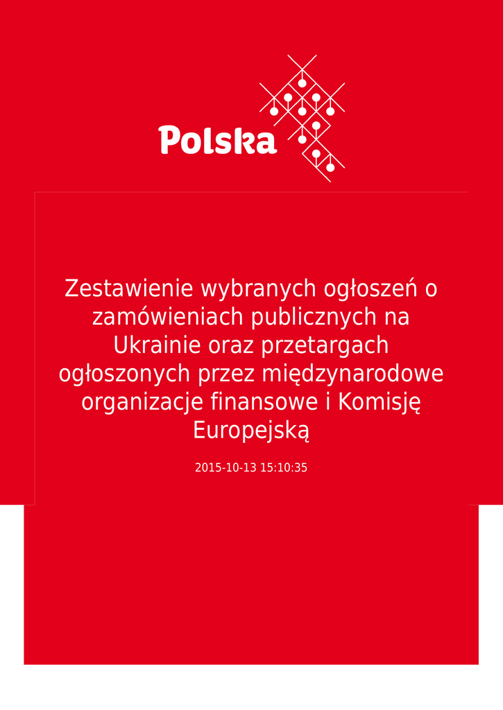 Zestawienie wybranych ogłoszeń o zamówieniach publicznych na Ukrainie oraz przetargach ogłoszonych przez międzynarodowe organizacje finansowe i Komisję Europejską 2015-10-13 15:10:35 2 3 Poniżej przedstawiamy zestawienie wybranych ogłoszeń o zamówieniach publicznych na Ukrainie oraz przetargach ogłoszonych przez międzynarodowe organizacje finansowe, w których mogą brać udział zagraniczni oferenci. Poniżej przedstawiamy zestawienie wybranych ogłoszeń o zamówieniach publicznych na Ukrainie oraz przetargach ogłoszonych przez międzynarodowe organizacje, w których mogą brać udział zagraniczni oferenci. Jednocześnie przypominany, iż wszystkie ogłoszenia o zamówieniach publicznych na Ukrainie (adresowane zarówno wyłącznie do krajowych oferentów, jak i do wszystkich potencjalnych oferentów, bez ograniczeń) znaleźć można w publicznym portalu zamówień publicznych (http://www.tender.me.gov.ua). Numer: 211490 Nazwa i dane teleadresowe instytucji ogłaszającej przetarg: „Biłocerkiwska tepłoelektrocentral”, kod EDRPOU 30664834, ul. Petra Zaporożca 361, Biła Cerkwa, obwód kijowski, 09114, Ukraina; www.tender.me.gov.ua Osoba kontaktowa: p. Wasyl Syrytsia, tel. +38 (0456) 337-675, tel./faks +38 (0456) 379-855; e-mail: [email protected] Temat przetargu, numer przetargu, zakres: Części zapasowe do turbin parowych; numer przetargu 211490 Branża: Budownictwo, materiały budowlane, maszyny specjalne Planowana cena zakupu: 4,9 mln UAH Państwo/Rynek: Ukraina Termin składania ofert do: 18.11.2015 4 Numer: 211295 Nazwa i dane teleadresowe instytucji ogłaszającej przetarg: Ministerstwo Rozwoju Regionalnego, Budownictwa i Gospodarki Mieszkaniowo-Komunalnej Ukrainy, kod EDRPOU 37471928, ul. Wełyka Żytomyrska 9, Kijów, 01601, Ukraina; www.tender.me.gov.ua, www.minregion.gov.ua Osoba kontaktowa: p. Hałyna Merkuszewa, tel. +38 (05652) 9-53-58, tel./faks +38 (05652) 5-51-71 Temat przetargu, numer przetargu, zakres: Sprzęt komputerowy do instalacji w wielkiej sali konferencyjnej Ministerstwa; numer przetargu 211295 Branża: Komputery, sprzęt biurowy, oprogramowanie Planowana cena zakupu: 2,6 mln UAH Państwo/Rynek: Ukraina Termin składania ofert do: 10.11.2015 Numer: 211507 Nazwa i dane teleadresowe instytucji ogłaszającej przetarg: Centralne Biuro Ministerstwa Spraw Wewnętrznych Ukrainy w Kijowie, kod EDRPOU 08592201; ul. Wołodymyrska 15, Kijów, 01601, Ukraina; www.tender.me.gov.ua Osoba kontaktowa: p. Iwan Bereżańskyj, tel. +38 (044) 271-95-16; tel./faks +38 (044) 271-92-16; e-mail: [email protected] Temat przetargu, numer przetargu, zakres: Komputery i sprzęt biurowy; numer przetargu 211507 Branża: Komputery, sprzęt biurowy, oprogramowanie Planowana cena zakupu: 1,5 mln UAH Państwo/Rynek: Ukraina Termin składania ofert do: 10.11.2015 Numer: 211143 Nazwa i dane teleadresowe instytucji ogłaszającej przetarg: Narodowe Biuro Antykopupcyjne Ukrainy, kod EDRPOU 39751280; ul. Surikowa 3, Kijów, 03035, Ukraina; www.tender.me.gov.ua Osoba kontaktowa: p. T.M. But, tel. +38 (044) 246-31-51, e-mail: [email protected] Temat przetargu, numer przetargu, zakres: Bielizna osobista, koszule ; numer przetargu 211143 Branża: Przemysł lekki Planowana cena zakupu: 1,19 mln UAH Państwo/Rynek: Ukraina Termin składania ofert do: 10.11.2015 5 Numer: 211144 Nazwa i dane teleadresowe instytucji ogłaszającej przetarg: Narodowe Biuro Antykopupcyjne Ukrainy, kod EDRPOU 39751280; ul. Surikowa 3, Kijów, 03035, Ukraina; www.tender.me.gov.ua Osoba kontaktowa: p. T.M. But, tel. +38 (044) 246-31-51, e-mail: [email protected] Temat przetargu, numer przetargu, zakres: Odzież robocza dla mężczyzn; numer przetargu 211144 Branża: Towary, prace, usługi Planowana cena zakupu: 1,47 mln UAH Państwo/Rynek: Ukraina Termin składania ofert do: 11.11.2015 Numer: 210965 Nazwa i dane teleadresowe instytucji ogłaszającej przetarg: Obwodowy Szpital Kliniczny im. O. Herbaczewskiego Żytomierskiej Obwodowej Administracji Państwowej, kod EDRPOU 01991406; ul. Czerwonoho Chresta 3, Żytomierz, 10002, Ukraina; www.tender.me.gov.ua Osoba kontaktowa: p. Mykoła Susłyk, tel. +38 (0412) 43-87-35, +38 (0412) 4387-28, +38 (068) 835-17-81, e-mail: [email protected] Temat przetargu, numer przetargu, zakres: Litotryptor laserowy typu kontaktowego; numer przetargu 210965 Branża: Medycyna społeczna Planowana cena zakupu: 1,7 mln UAH Państwo/Rynek: Ukraina Termin składania ofert do: 27.10.2015 6 Nazwa i numer projektu: Second Power Transmission Project (PTP-2), nr P146788 Nazwa i dane teleadresowe instytucji ogłaszającej przetarg: Bank Światowy Organizacje uczestniczące w projekcie: „PAT UKRENERHO”, ul. Simona Petlury 25, Kiev, 01032, Ukraina Rodzaj zapytania: Wniosek o wyrażenie zainteresowania Osoba kontaktowa: p. Wiktor Lysych, Kierownik Wydziału Inwestycji Międzynarodowych „PAT UKRENERHO”, tel. +38 (044) 238-38-39, +38 (044) 23830-14, tel./faks +38 (044) 238-39-81; e-mail: [email protected] Temat przetargu, zakres: Zwiększenie poziomu niezawodności systemu przesyłania i dystrybucji energii elektrycznej na Ukrainie oraz wzmocnienie rynku hurtowego energii elektrycznej na Ukrainie. Elementy projektu: 1. Modernizacja podstacji przesyłowych 2. Wzmocnienie rynku energii elektrycznej na Ukrainie: - montaż i podłączenie urządzeń do kompensacji mocy biernej dla wybranych podstacji przesyłowych wysokiego napięcia - wprowadzenie systemu Smart Grid poprzez jego zakup i instalacje rozwiązań Smart Grid, w tym: modernizację sieci telekomunikacyjnej pomiędzy odnawialnymi źródłami energii, podstacjami kluczowymi sieci przesyłowych a centrami sterowania systemem. Planowana cena zakupu: 378,72 mln USD Branża: Przesyłanie i dystrybucja energii elektrycznej Państwo/Rynek: Ukraina Termin składania wniosków do: 30.10.2015 r. Informacja o przetargu na stronie Banku Światowego: Link 1, Link 2 7 Nazwa i numer projektu: Serving People, Improving Health Project for Ukrain