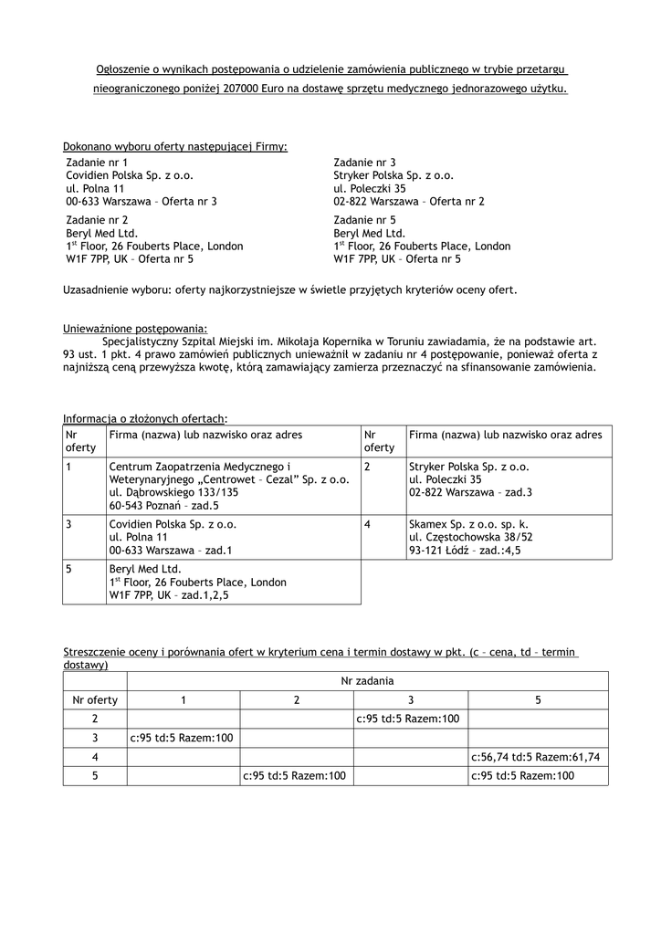 Ogłoszenie o wynikach postępowania o udzielenie zamówienia publicznego w trybie przetargu nieograniczonego poniżej 207000 Euro na dostawę sprzętu medycznego jednorazowego użytku. Dokonano wyboru oferty następującej Firmy: Zadanie nr 1 Covidien Polska Sp. z o.o. ul. Polna 11 00-633 Warszawa – Oferta nr 3 Zadanie nr 3 Stryker Polska Sp. z o.o. ul. Poleczki 35 02-822 Warszawa – Oferta nr 2 Zadanie nr 2 Beryl Med Ltd. 1st Floor, 26 Fouberts Place, London W1F 7PP, UK – Oferta nr 5 Zadanie nr 5 Beryl Med Ltd. 1st Floor, 26 Fouberts Place, London W1F 7PP, UK – Oferta nr 5 Uzasadnienie wyboru: oferty najkorzystniejsze w świetle przyjętych kryteriów oceny ofert. Unieważnione postępowania: Specjalistyczny Szpital Miejski im. Mikołaja Kopernika w Toruniu zawiadamia, że na podstawie art. 93 ust. 1 pkt. 4 prawo zamówień publicznych unieważnił w zadaniu nr 4 postępowanie, ponieważ oferta z najniższą ceną przewyższa kwotę, którą zamawiający zamierza przeznaczyć na sfinansowanie zamówienia. Informacja o złożonych ofertach: Nr Firma (nazwa) lub nazwisko oraz adres oferty Nr oferty Firma (nazwa) lub nazwisko oraz adres 1 Centrum Zaopatrzenia Medycznego i Weterynaryjnego „Centrowet – Cezal” Sp. z o.o. ul. Dąbrowskiego 133/135 60-543 Poznań – zad.5 2 Stryker Polska Sp. z o.o. ul. Poleczki 35 02-822 Warszawa – zad.3 3 Covidien Polska Sp. z o.o. ul. Polna 11 00-633 Warszawa – zad.1 4 Skamex Sp. z o.o. sp. k. ul. Częstochowska 38/52 93-121 Łódź – zad.:4,5 5 Beryl Med Ltd. 1st Floor, 26 Fouberts Place, London W1F 7PP, UK – zad.1,2,5 Streszczenie oceny i porównania ofert w kryterium cena i termin dostawy w pkt. (c – cena, td – termin dostawy) Nr zadania Nr oferty 1 2 2 3 5 c:95 td:5 Razem:100 c:95 td:5 Razem:100 4 5 3 c:56,74 td:5 Razem:61,74 c:95 td:5 Razem:100 c:95 td:5 Razem:100 Informacja o firmach wykluczonych / ofertach odrzuconych: Oferta Firmy Centrum Zaopatrzenia Medycznego i Weterynaryjnego „Centrowet – Cezal” z siedzibą w Poznaniu podlega odrzuceniu w zadaniu nr 5 na podstawie art. 89 ust.1 pkt.2 prawo zamówień publicznych, ponieważ jej treść nie odpowiada treści specyfikacji istotnych warunków zamówienia. Zamawiający wymagał drenu z końcówka żeńską z jednej strony, z drugiej z nasadką finger tip, a nie łącznikiem. Wykonawca zaoferował dren z końcówką żeńską, w którą włożony był łącznik finger tip, natomiast druga strona jest bez zakończenia. Oferta Firmy Beryl Med Ltd. z siedzibą w Londynie podlega odrzuceniu w zadaniu nr 1 na podstawie art. 89 ust.1 pkt.2 prawo zamówień publicznych, ponieważ jej treść nie odpowiada treści specyfikacji istotnych warunków zamówienia. Zamawiający wymagał strzykawki luer – lock 50ml, natomiast Wykonawca zaoferował strzykawkę 60ml. Dnia 22.12.2015r. ogłoszenie zamieszczono na stronie internetowej www.med.torun.pl i na tablicy ogłoszeń Zamawiającego.