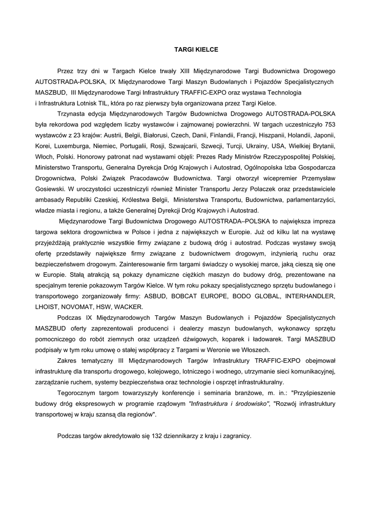 TARGI KIELCE Przez trzy dni w Targach Kielce trwały XIII Międzynarodowe Targi Budownictwa Drogowego AUTOSTRADA-POLSKA, IX Międzynarodowe Targi Maszyn Budowlanych i Pojazdów Specjalistycznych MASZBUD, III Międzynarodowe Targi Infrastruktury TRAFFIC-EXPO oraz wystawa Technologia i Infrastruktura Lotnisk TIL, która po raz pierwszy była organizowana przez Targi Kielce. Trzynasta edycja Międzynarodowych Targów Budownictwa Drogowego AUTOSTRADA-POLSKA była rekordowa pod względem liczby wystawców i zajmowanej powierzchni. W targach uczestniczyło 753 wystawców z 23 krajów: Austrii, Belgii, Białorusi, Czech, Danii, Finlandii, Francji, Hiszpanii, Holandii, Japonii, Korei, Luxemburga, Niemiec, Portugalii, Rosji, Szwajcarii, Szwecji, Turcji, Ukrainy, USA, Wielkiej Brytanii, Włoch, Polski. Honorowy patronat nad wystawami objęli: Prezes Rady Ministrów Rzeczypospolitej Polskiej, Ministerstwo Transportu, Generalna Dyrekcja Dróg Krajowych i Autostrad, Ogólnopolska Izba Gospodarcza Drogownictwa, Polski Związek Pracodawców Budownictwa. Targi otworzył wicepremier Przemysław Gosiewski. W uroczystości uczestniczyli również Minister Transportu Jerzy Polaczek oraz przedstawiciele ambasady Republiki Czeskiej, Królestwa Belgii, Ministerstwa Transportu, Budownictwa, parlamentarzyści, władze miasta i regionu, a także Generalnej Dyrekcji Dróg Krajowych i Autostrad. Międzynarodowe Targi Budownictwa Drogowego AUTOSTRADA–POLSKA to największa impreza targowa sektora drogownictwa w Polsce i jedna z największych w Europie. Już od kilku lat na wystawę przyjeżdżają praktycznie wszystkie firmy związane z budową dróg i autostrad. Podczas wystawy swoją ofertę przedstawiły największe firmy związane z budownictwem drogowym, inżynierią ruchu oraz bezpieczeństwem drogowym. Zainteresowanie firm targami świadczy o wysokiej marce, jaką cieszą się one w Europie. Stałą atrakcją są pokazy dynamiczne ciężkich maszyn do budowy dróg, prezentowane na specjalnym terenie pokazowym Targów Kielce. W tym roku pokazy specjalistycznego sprzętu budowlanego i transportowego zorganizowały firmy: ASBUD, BOBCAT EUROPE, BODO GLOBAL, INTERHANDLER, LHOIST, NOVOMAT, HSW, WACKER. Podczas IX Międzynarodowych Targów Maszyn Budowlanych i Pojazdów Specjalistycznych MASZBUD oferty zaprezentowali producenci i dealerzy maszyn budowlanych, wykonawcy sprzętu pomocniczego do robót ziemnych oraz urządzeń dźwigowych, koparek i ładowarek. Targi MASZBUD podpisały w tym roku umowę o stałej współpracy z Targami w Weronie we Włoszech. Zakres tematyczny III Międzynarodowych Targów Infrastruktury TRAFFIC-EXPO obejmował infrastrukturę dla transportu drogowego, kolejowego, lotniczego i wodnego, utrzymanie sieci komunikacyjnej, zarządzanie ruchem, systemy bezpieczeństwa oraz technologie i osprzęt infrastrukturalny. Tegorocznym targom towarzyszyły konferencje i seminaria branżowe, m. in.: "Przyśpieszenie budowy dróg ekspresowych w programie rządowym "Infrastruktura i środowisko", "Rozwój infrastruktury transportowej w kraju szansą dla regionów". Podczas targów akredytowało się 132 dziennikarzy z kraju i zagranicy. Nagrody i wyróżnienia wręczone podczas targów Wyróżnienia Targów Kielce: • • Drabpol Sp. j. P. Drabczyński i J. Ludwin z Mykanowa za system pomiaru zużycia paliwa EDM eco JD-Inżynieria Ruchu z Zielonki za Solarny System Oświetlenia Dróg Medale Targów Kielce: • • • • AMMANN POLSKA Sp. z o.o. z Warszawy za zagęszczarkę AVH 6030 WIRTGEN POLSKA Sp. z o.o. z Czapur za kruszarkę szczękową KLEEMANN MC 110Z FRANKI-KPRM Sp z o.o. z Jaworzna za Pale Franki nowej generacji – pan ZPB Kaczmarek Sp.z o.o. z Rawicza za studnie szczelne Wyróżnienia Targów Kielce za aranżację stoiska: • • • • • • • • • • • • • • • • • • • • • • ZAKŁADO INŻYNIERII RUCHU z Bytomia ORLEN ASFALT z Płocka JP GRANIT z Ostrowca Świętokrzyskiego SIGMA TRAKT z Tarnowa Podgórnego INTERMINGLASS z Wałbrzycha BERNARDI POLSKA z Warszawy ZABERD S.A. z Wrocławia CUMMINS ENGINE COMPANY z Krakowa AMITECH POLAND z Gdańska ZTW TRZUSKAWICA SA z Sitkówki-Nowiny MASFALT z Pruszkowa OLSZTYŃSKIE KOPALNIE SUROWCÓW MINERALNYCH z Olsztyna CENTRUM BIZNESU TYTANIUM z Łodzi TRAFFIC EQUIPMENT ze SZCZECINA TEZANA z Warszawy INTERHANDLER z TORUNIA VOLVO MASZYNY BUDOWLANE POLSKA z WARSZAWY CET GROUP z Włoch IVECO POLAND z WARSZAWY HORTPAK z WARSZAWY HAULOTTE POLSKA z WARSZAWY BH RUDA z Katowic Medale Targów Kielce za aranżację stoiska: • • • • • VIACON POLSKA z Rydzyny MSR TRAFFIC z Przeźmierowa PROFIL z Warszawy ZPB KACZMAREK z Rawicza PHILIPS POLSKA z Warszawy